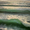 Ein stimmungsvolles Meeresgemälde mit eindrucksvoller Lichtwirkung und kräftiger Farbführung. In leuchtenden Grün- und Blautönen tosen die Wellen gegen dunkle Felsen, während die Sonne über dem Horizont durch die Wolken bricht und das Wasser in warmen Gold- und Silbertönen aufleuchten lässt. Die pastose Malweise betont die Dynamik der Brandung und verleiht der Szene Tiefe und Bewegung.