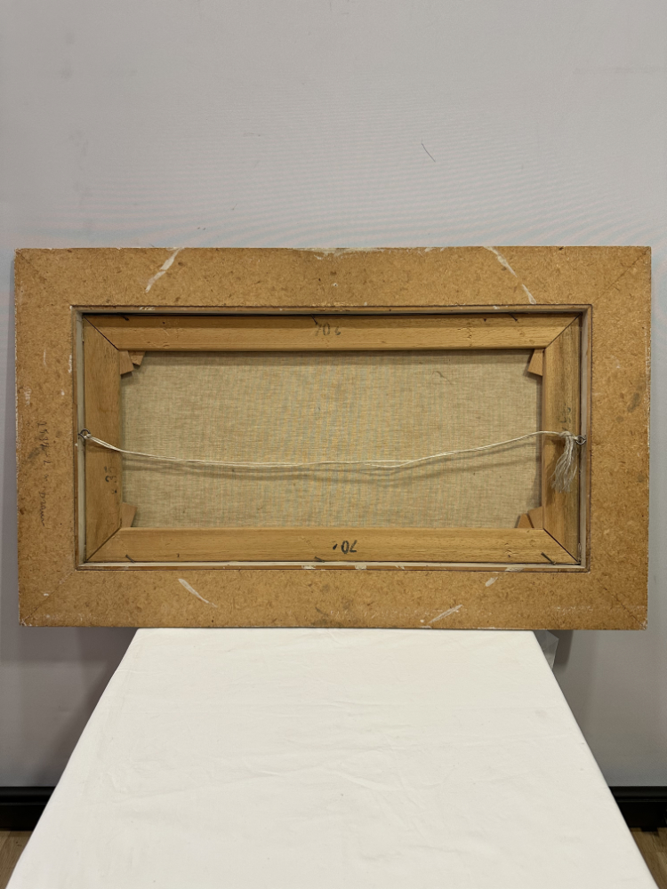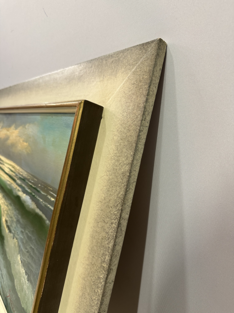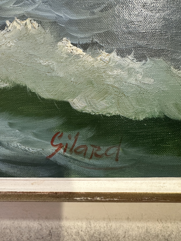 Unten rechts signiert, womöglich «Silard», die Signatur ist leicht schwungvoll gesetzt und könnte auch anders interpretiert werden. Die Malweise erinnert an südeuropäische Marinemalerei der 1960er bis 1970er Jahre, oft in Ateliers entlang der französischen oder spanischen Mittelmeerküste entstanden. Das Gemälde ist auf Leinwand gearbeitet und in einem breiten, champagnerfarbenen Rahmen gefasst, der die Farbwirkung harmonisch unterstützt.