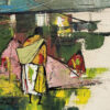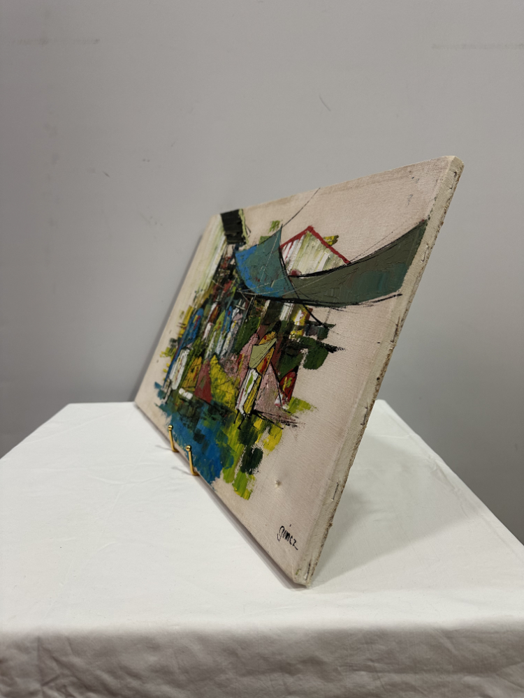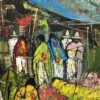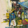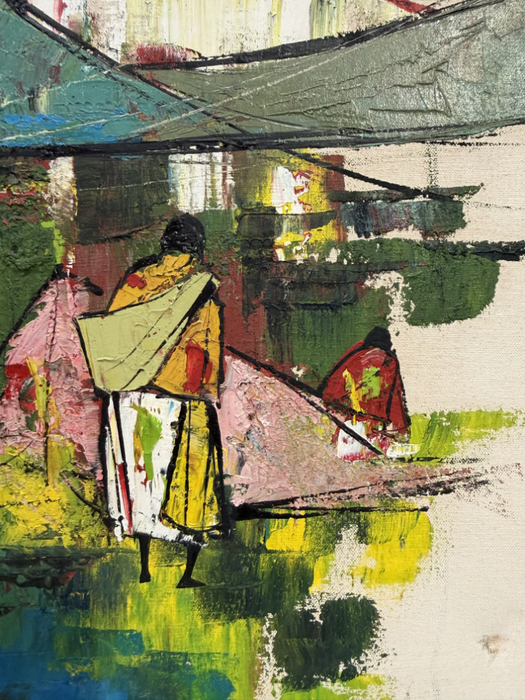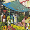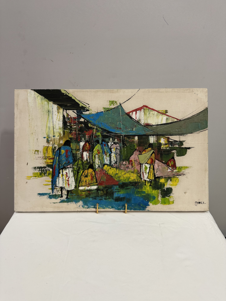 Das Werk zeigt eine belebte Marktszene mit Figuren in traditionellen Gewändern, die unter farbigen Zeltdächern agieren. Gomez’ Malstil kombiniert kräftige, klar abgegrenzte Farbflächen mit pastoser Struktur und rhythmischer Bewegung. Typisch für seine Werke dieser Zeit ist die expressive Verwendung von Blau-, Gelb-, Rot- und Grüntönen, die der Szene eine spürbare Lebendigkeit verleihen.