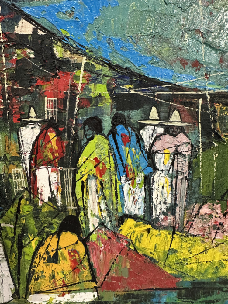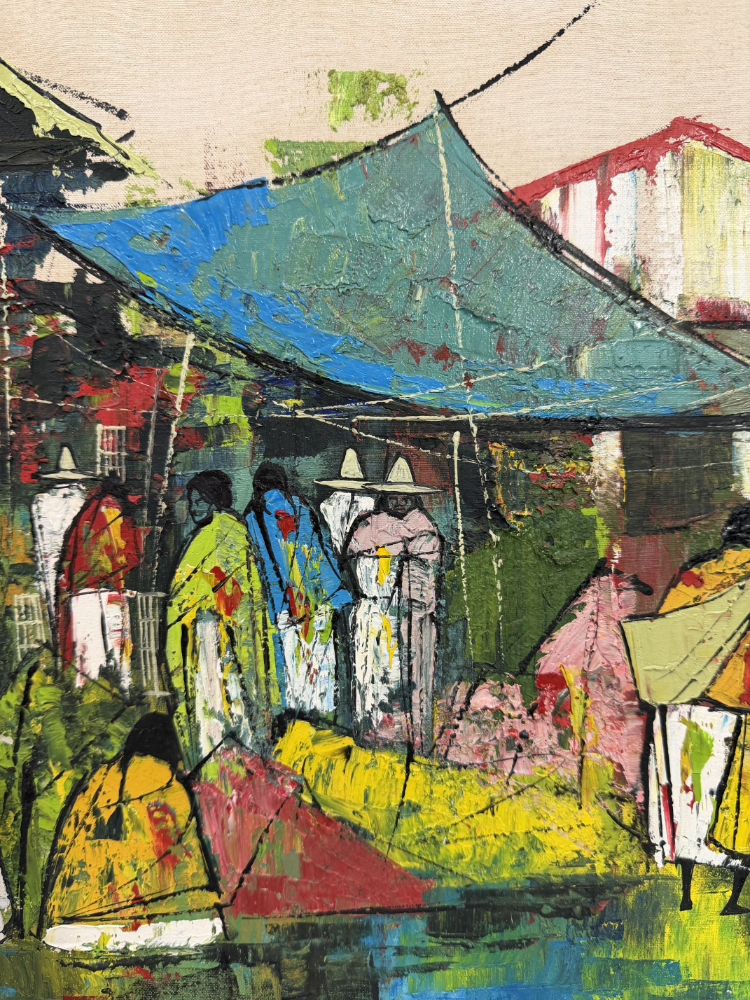 Dieses farbintensive Original-Ölgemälde auf Leinwand stammt von Benigno Gomez, einem bekannten lateinamerikanischen Künstler, der in den 1960er- und 1970er-Jahren mit seinen lebendigen Marktszenen internationale Anerkennung fand.