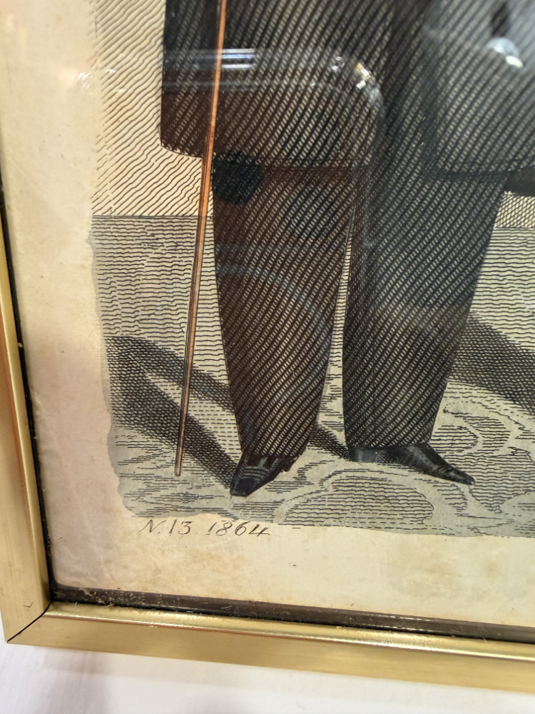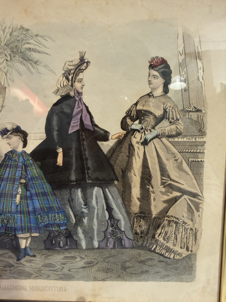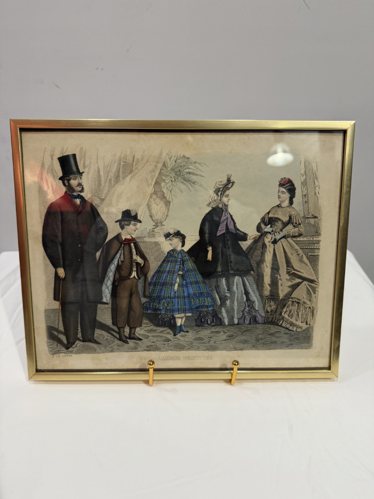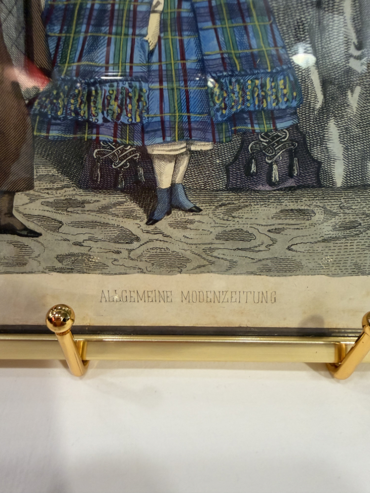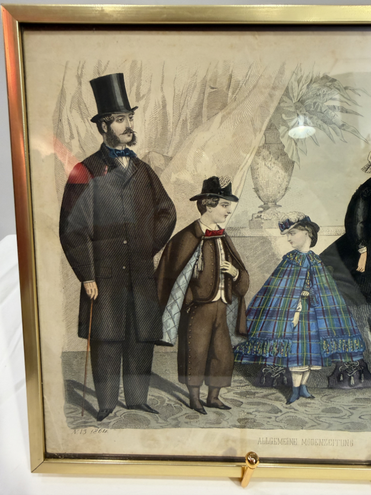 Original Mode-Lithografie 1864 „Allgemeine Modenzeitung“ – kolorierter Kupferstich im Goldrahmen 30 x 24 cm