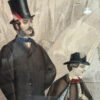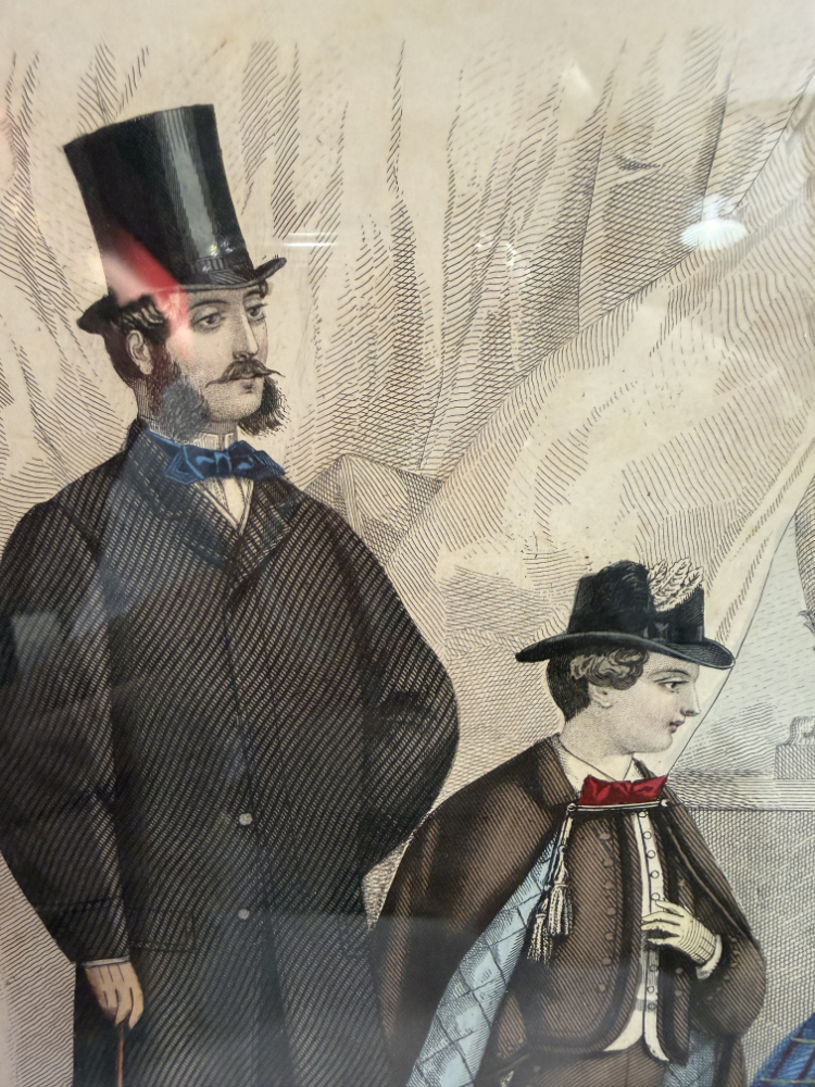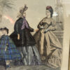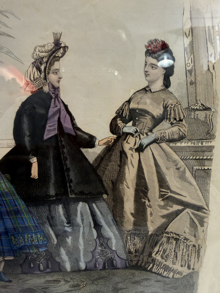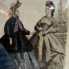 Die detailreich ausgeführte Druckgrafik wurde von Hand koloriert und besticht durch harmonische Farbtöne in Blau, Beige, Lila und Schwarz. Die Stoffe wirken fast stofflich, mit sichtbar schraffierten Mustern, Reifröcken, Schleifen und Hüten. Die Darstellung vermittelt eindrucksvoll das Modebewusstsein und die gesellschaftliche Eleganz der 1860er-Jahre.