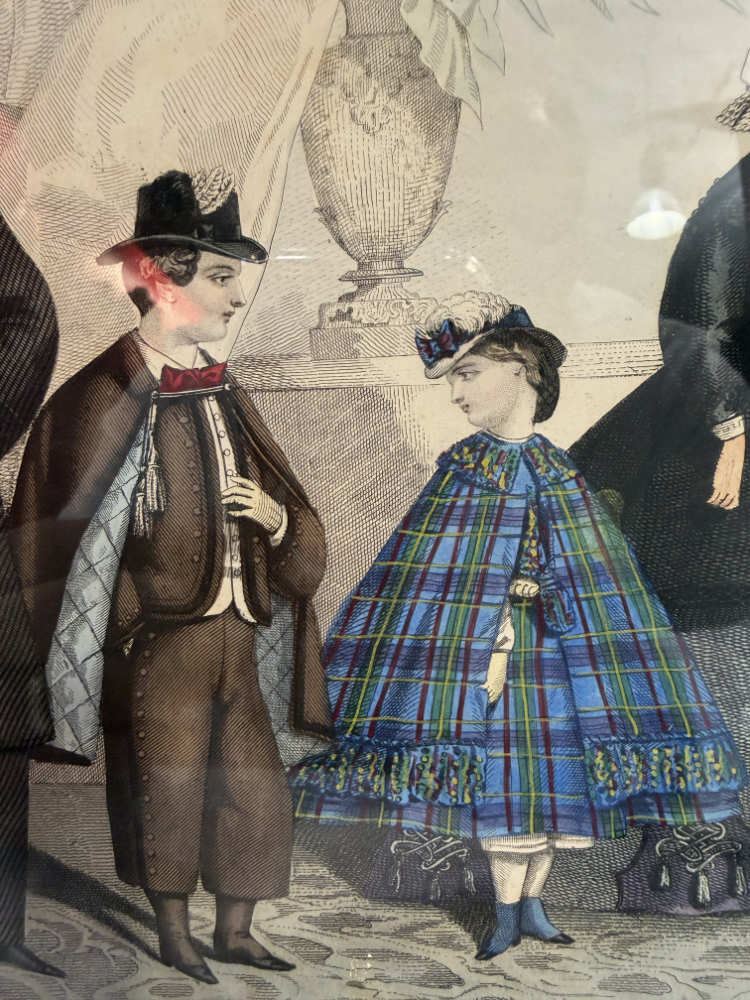 Diese feine Modegrafik aus dem Jahr 1864 stammt aus der Allgemeinen Modenzeitung, einer der bekanntesten europäischen Modepublikationen des 19. Jahrhunderts. Das kolorierte Blatt zeigt eine elegante Gesellschaftsszene mit Damen, Kindern und einem Herrn – ein authentisches Spiegelbild bürgerlicher Mode und Etikette der Zeit.