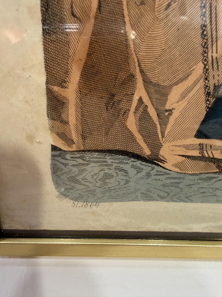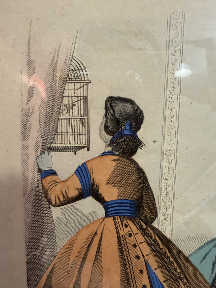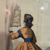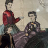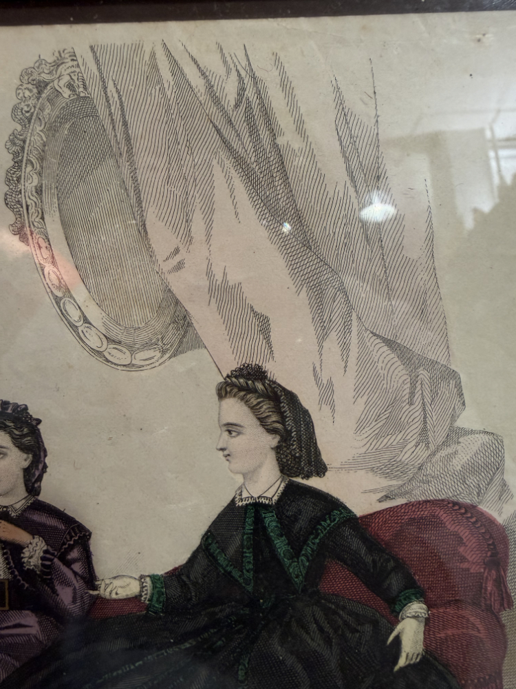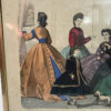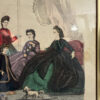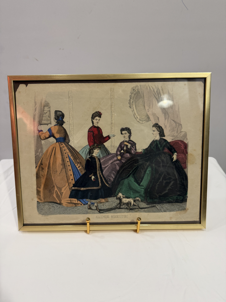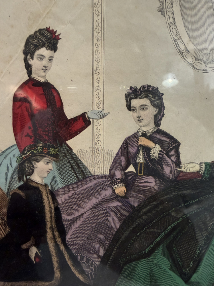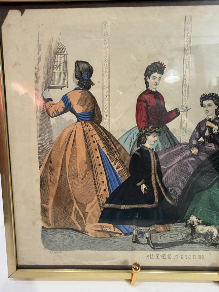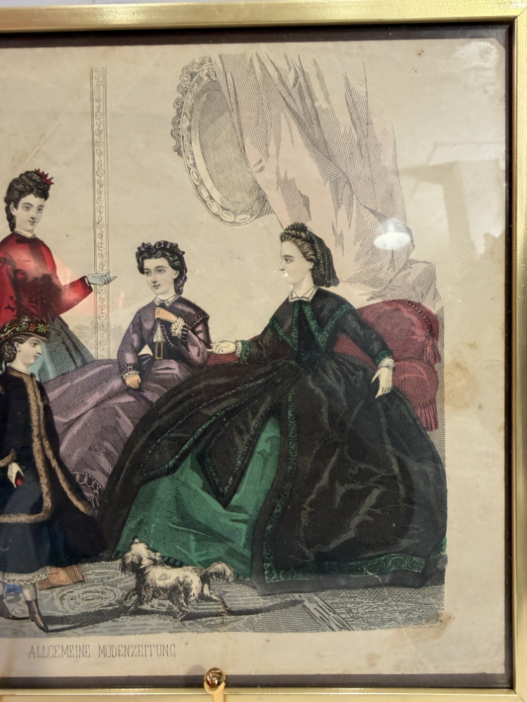 Die Darstellung vermittelt ein anschauliches Bild der Modekultur um 1860 – ein Zeitdokument, das den Geschmack, die Haltung und den Alltag der gehobenen Gesellschaft festhält. Das Blatt befindet sich unter Glas im schlichten goldfarbenen Rahmen.