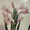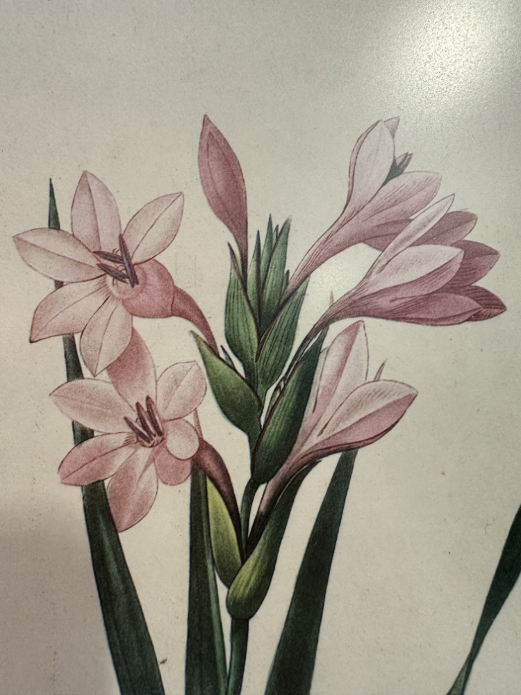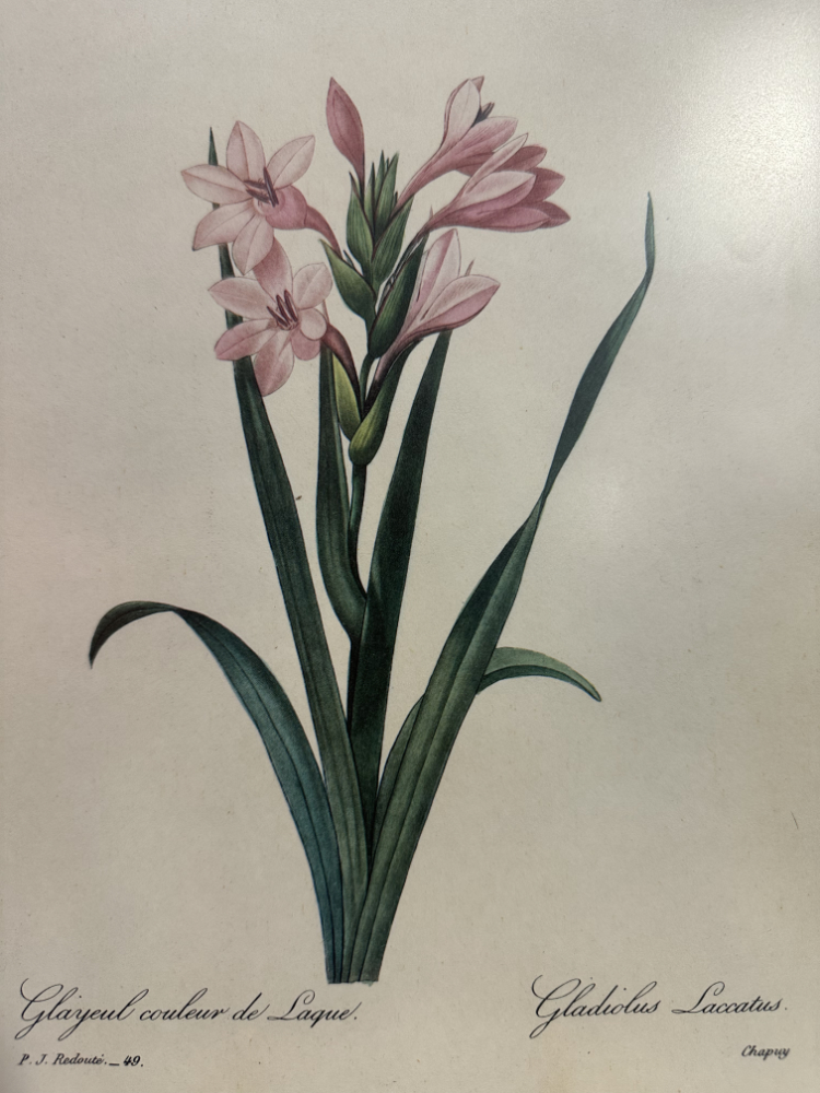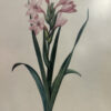 Diese detailreiche Darstellung zeigt die Gladiolus Laccatus, eine zartrosa Blütenart aus der Familie der Schwertlilien, nach einer Vorlage des berühmten französisch-belgischen Blumenmalers Pierre-Joseph Redouté. Der Künstler war einer der bedeutendsten botanischen Illustratoren des 18. und 19. Jahrhunderts und wurde für seine naturgetreuen Pflanzenstudien berühmt.