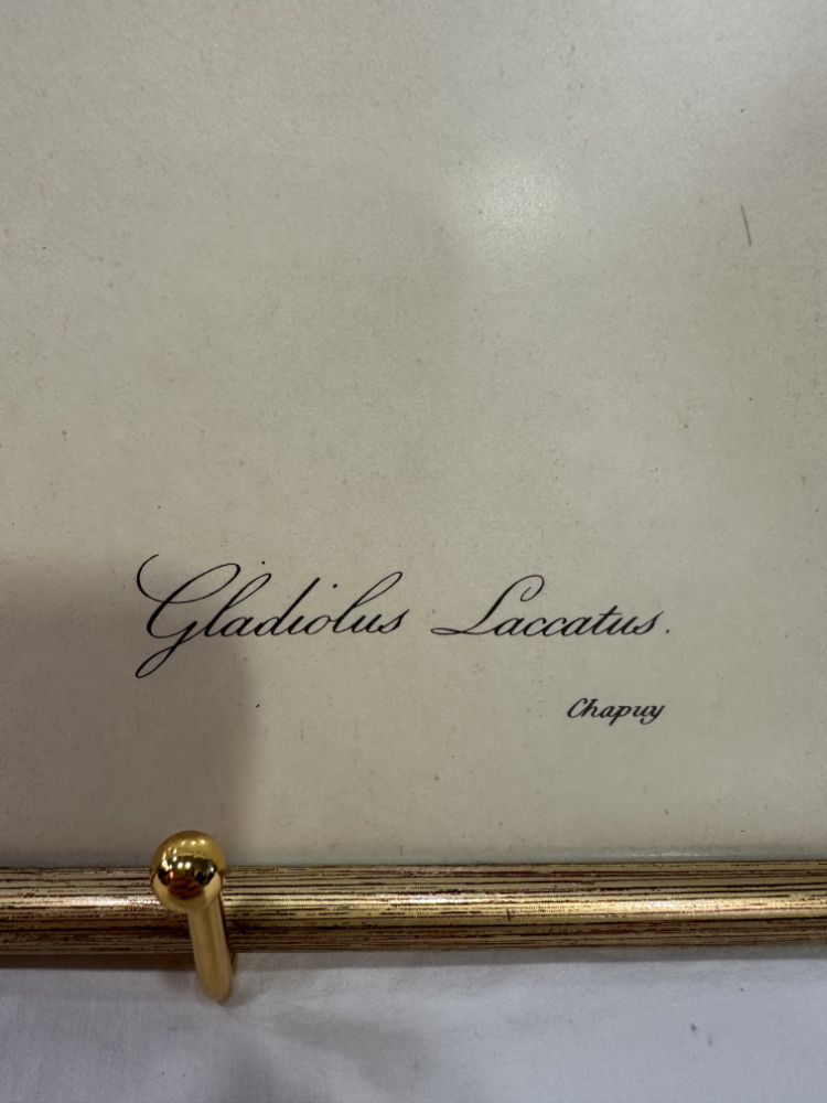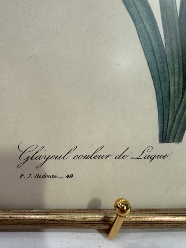Das Blatt trägt die originale französische Beschriftung «Glayeul couleur de Laque» und «Gladiolus Laccatus», was ihm den typischen Charakter klassischer botanischer Tafeln verleiht. Ideal für Liebhaber botanischer Kunst und stilvolle Wohnräume.