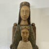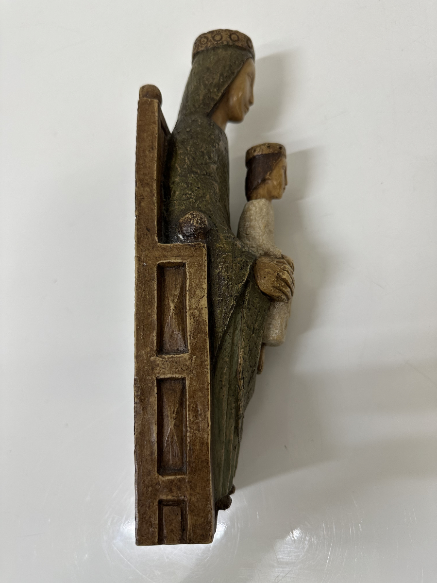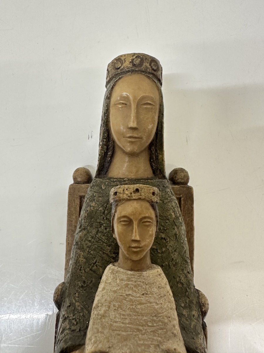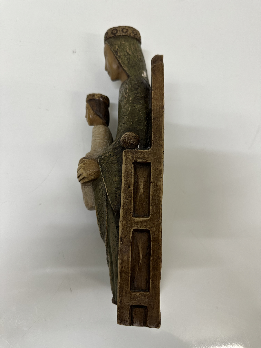 Gefasste Holzarbeit aus Bethlehem mit klarer, ruhiger Formensprache und tiefer symbolischer Wirkung. Die sitzende Madonna hält das Kind frontal auf dem Schoss, beide Figuren mit reduzierten Gesichtszügen und sanft geschlossenen Augen. Die Haltung wirkt streng und zugleich schützend, ganz im Stil traditioneller christlicher Volkskunst aus dem Heiligen Land. Die grünlich gefasste Gewandfläche der Madonna kontrastiert bewusst mit der helleren Figur des Kindes. Rückseitig hohl gearbeitet, mit originalem Werkstattaufkleber «Atelier d’Art – Artisans des Monastères de Bethlehem» sowie eingravierter Herkunftsangabe «Bethlehem».