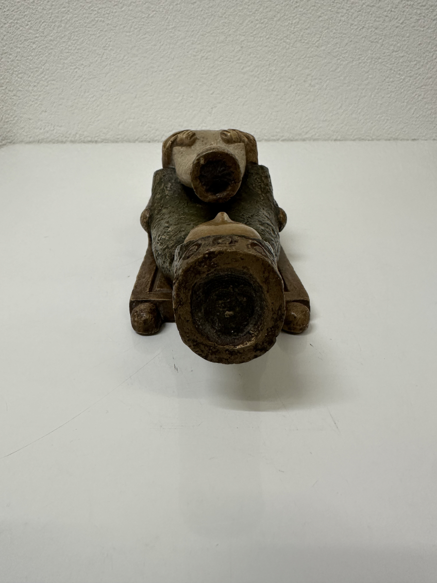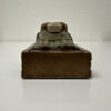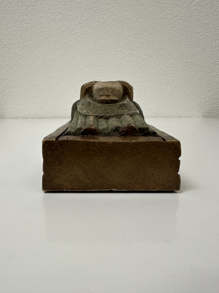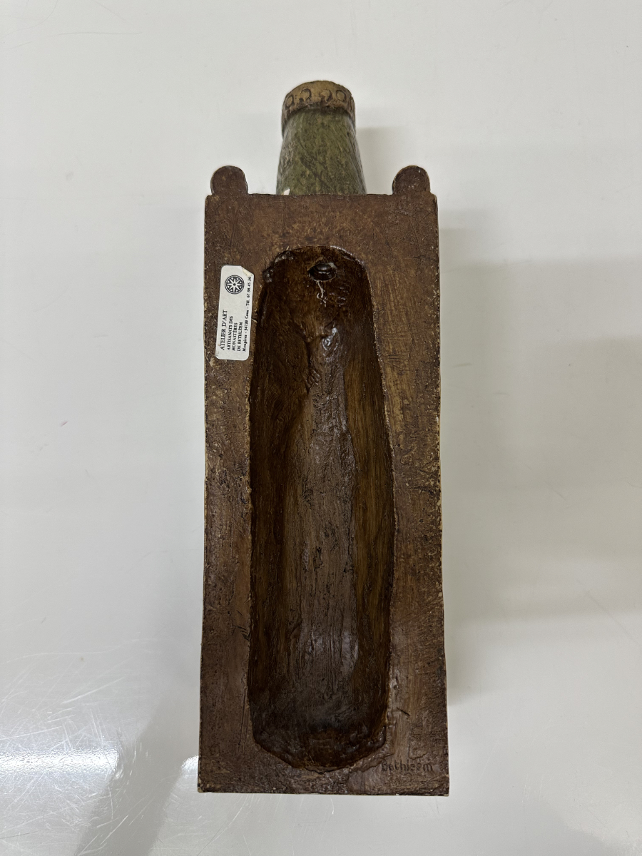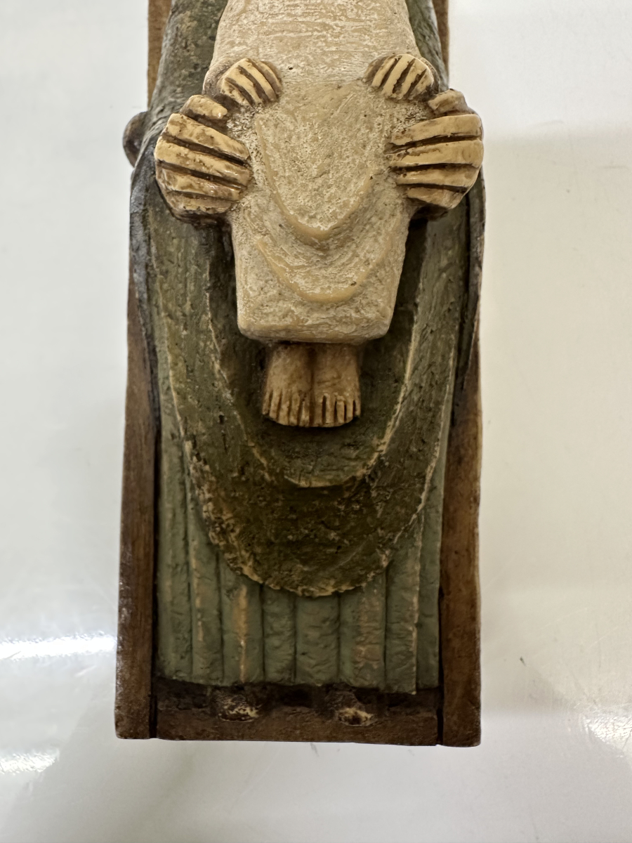 Gefasste Holzarbeit aus Bethlehem mit klarer, ruhiger Formensprache und tiefer symbolischer Wirkung. Die sitzende Madonna hält das Kind frontal auf dem Schoss, beide Figuren mit reduzierten Gesichtszügen und sanft geschlossenen Augen. Die Haltung wirkt streng und zugleich schützend, ganz im Stil traditioneller christlicher Volkskunst aus dem Heiligen Land. Die grünlich gefasste Gewandfläche der Madonna kontrastiert bewusst mit der helleren Figur des Kindes. Rückseitig hohl gearbeitet, mit originalem Werkstattaufkleber «Atelier d’Art – Artisans des Monastères de Bethlehem» sowie eingravierter Herkunftsangabe «Bethlehem».