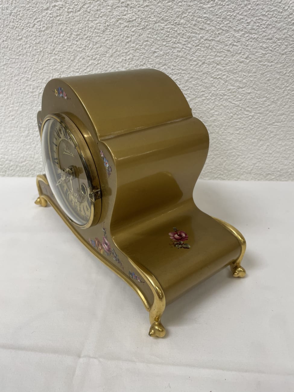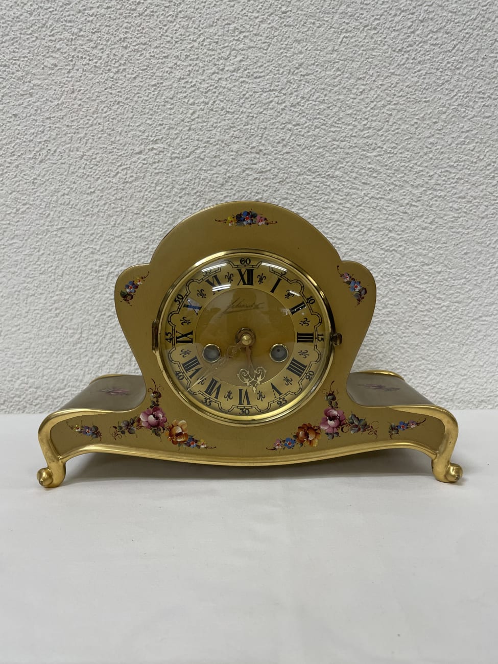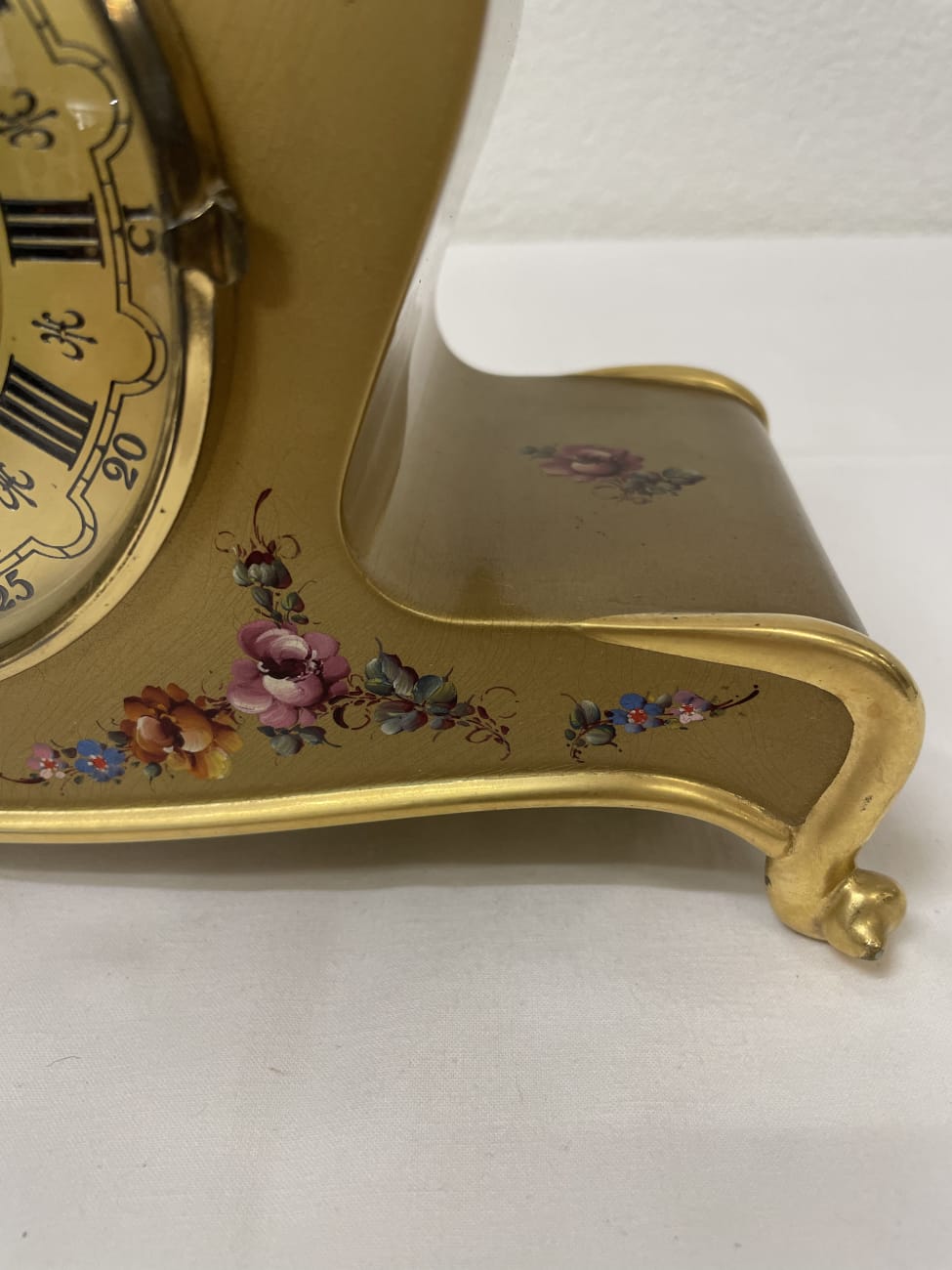 Goldfarbene Oberfläche, feine Blumenmalereien und die geschwungene Form sorgen sofort für einen klassischen Look. Das Zifferblatt mit römischen Zahlen und verzierten Zeigern ist gut lesbar und passt optisch perfekt zum Gesamtbild. Innen befindet sich ein Batteriefach, das über die rückseitige Tür einfach zugänglich ist. Die Uhr steht stabil auf kleinen Füssen und eignet sich ideal als dekoratives Element auf Sideboard, Regal oder Kamin. Leichte Gebrauchsspuren sind vorhanden und im Gesamtbild kaum störend.