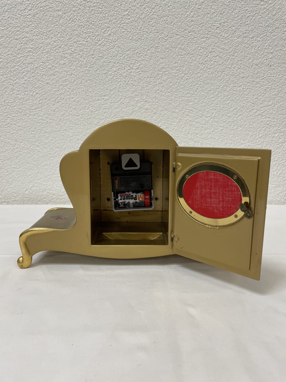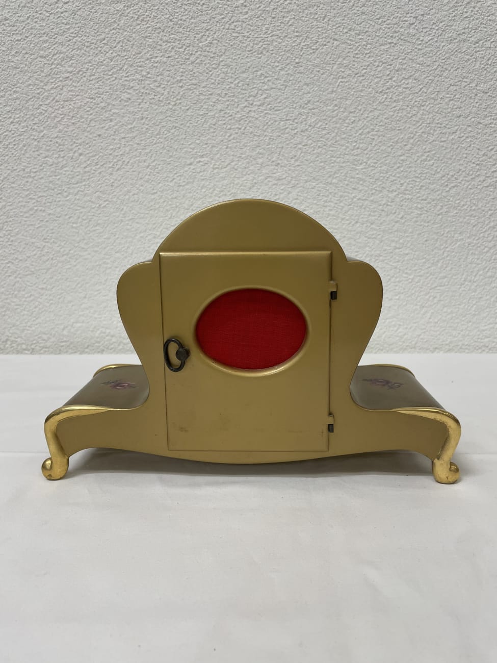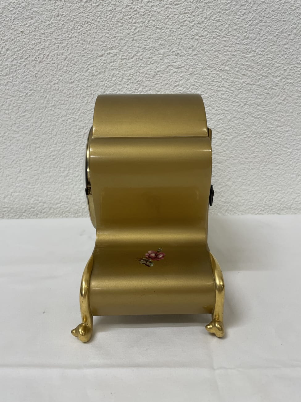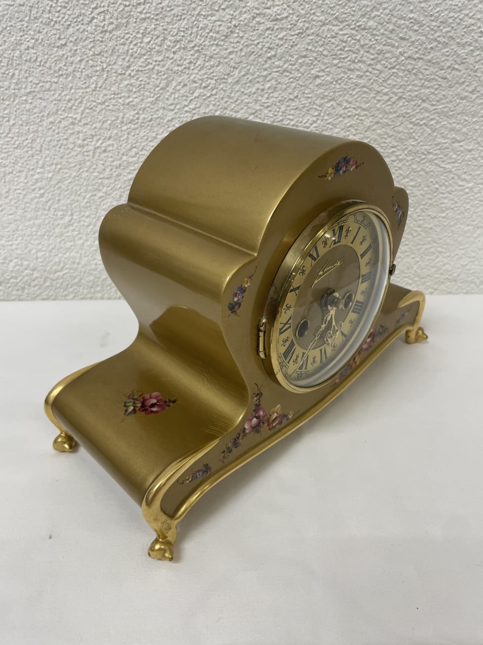 Goldfarbene Oberfläche, feine Blumenmalereien und die geschwungene Form sorgen sofort für einen klassischen Look. Das Zifferblatt mit römischen Zahlen und verzierten Zeigern ist gut lesbar und passt optisch perfekt zum Gesamtbild. Innen befindet sich ein Batteriefach, das über die rückseitige Tür einfach zugänglich ist. Die Uhr steht stabil auf kleinen Füssen und eignet sich ideal als dekoratives Element auf Sideboard, Regal oder Kamin. Leichte Gebrauchsspuren sind vorhanden und im Gesamtbild kaum störend.