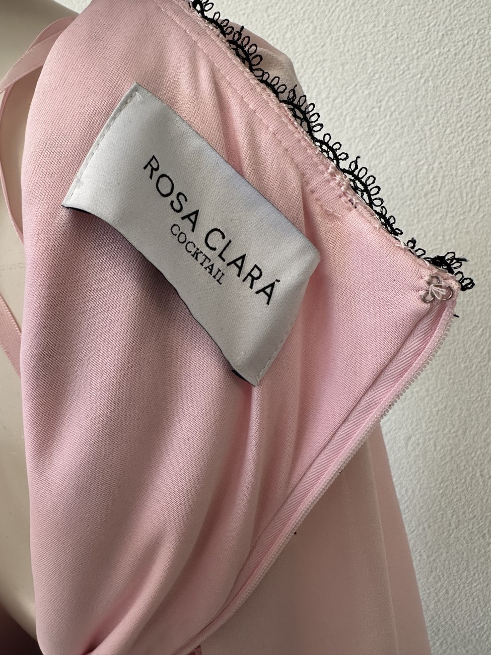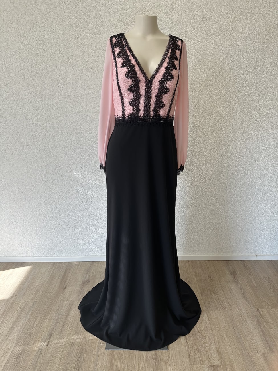 Dieses elegante Abendkleid von Rosa Clará Cocktail kombiniert eine feminine Oberpartie aus rosa Stoff mit aufgenähter schwarzer Spitze und einen langen, glatten Rock in Schwarz. Der tiefe V-Ausschnitt wird durch dekorative Spitzenborten betont und sorgt für eine elegante Linienführung. Transparente lange Ärmel mit Spitzenabschluss greifen das Muster des Oberteils wieder auf. Durch die schmale Silhouette und den langen Fall wirkt das Kleid sehr elegant und eignet sich hervorragend für festliche Anlässe. Hinten befindet sich ein verdeckter Reissverschluss, das Kleid trägt noch das Originaletikett in Grösse 42 (EU / 10 US).
