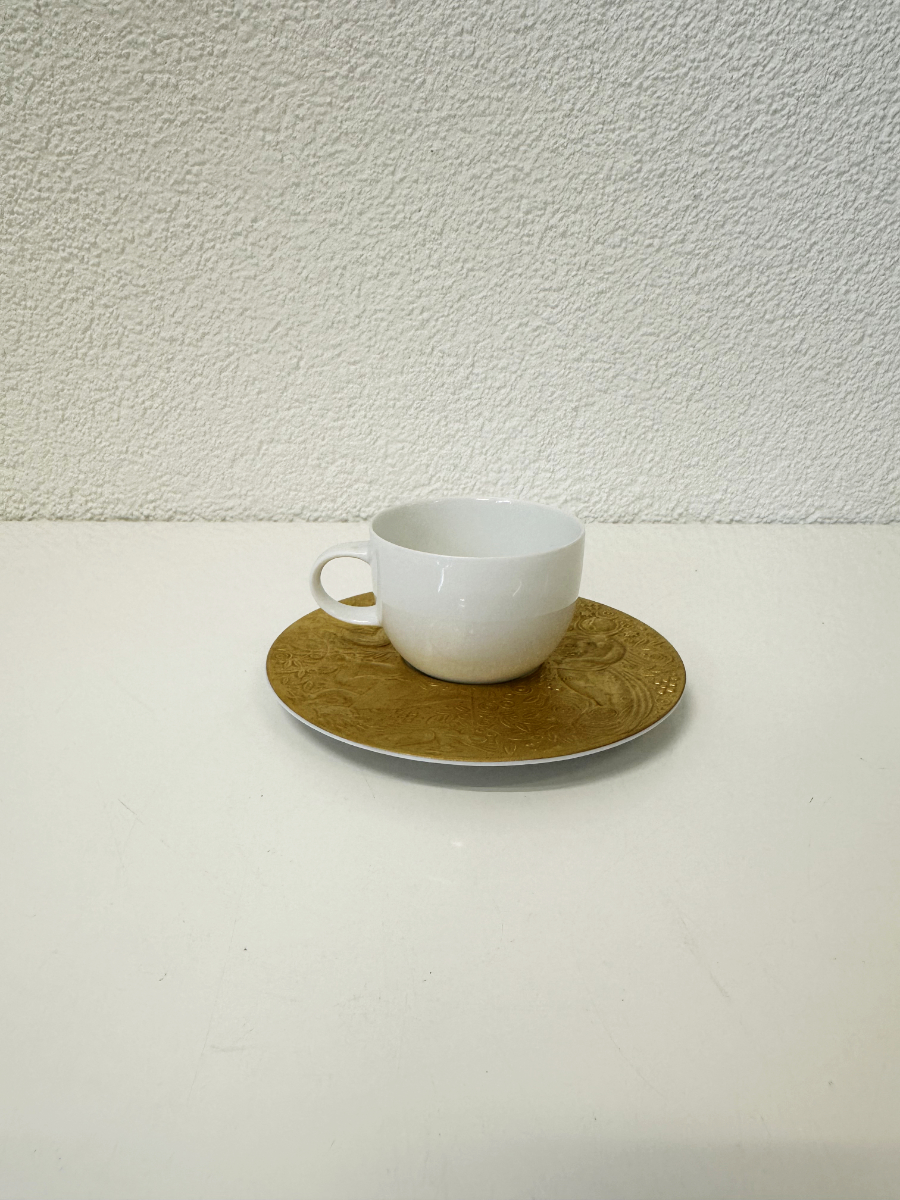 Weisses Rosenthal Porzellan mit einem auffälligen Unterteller in Goldoptik. Das Relief zeigt Figuren und Ornamente aus Mozarts „Die Zauberflöte“ und wirkt wie ein kleines Kunstwerk auf dem Tisch. Die Tasse ist schlicht gehalten, dadurch kommt das goldene Motiv noch stärker zur Geltung. Auf der Unterseite ist Rosenthal Germany markiert, der Teller trägt den Schriftzug „Die Zauberflöte“.