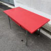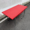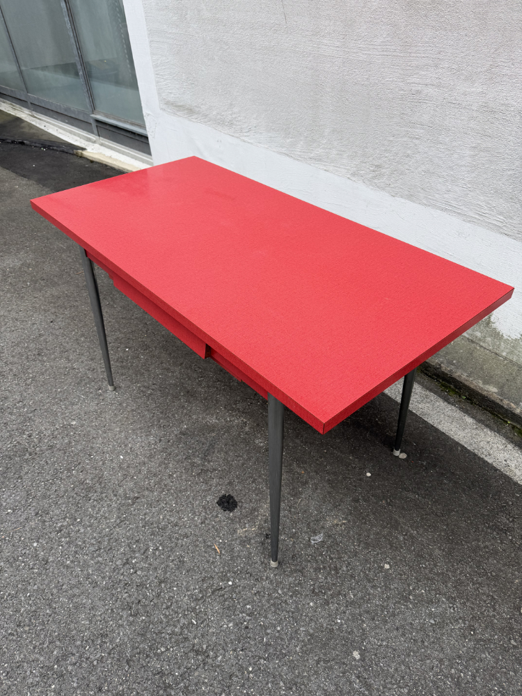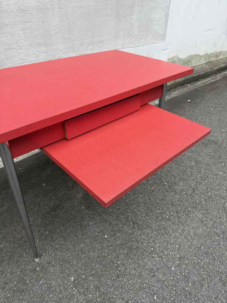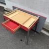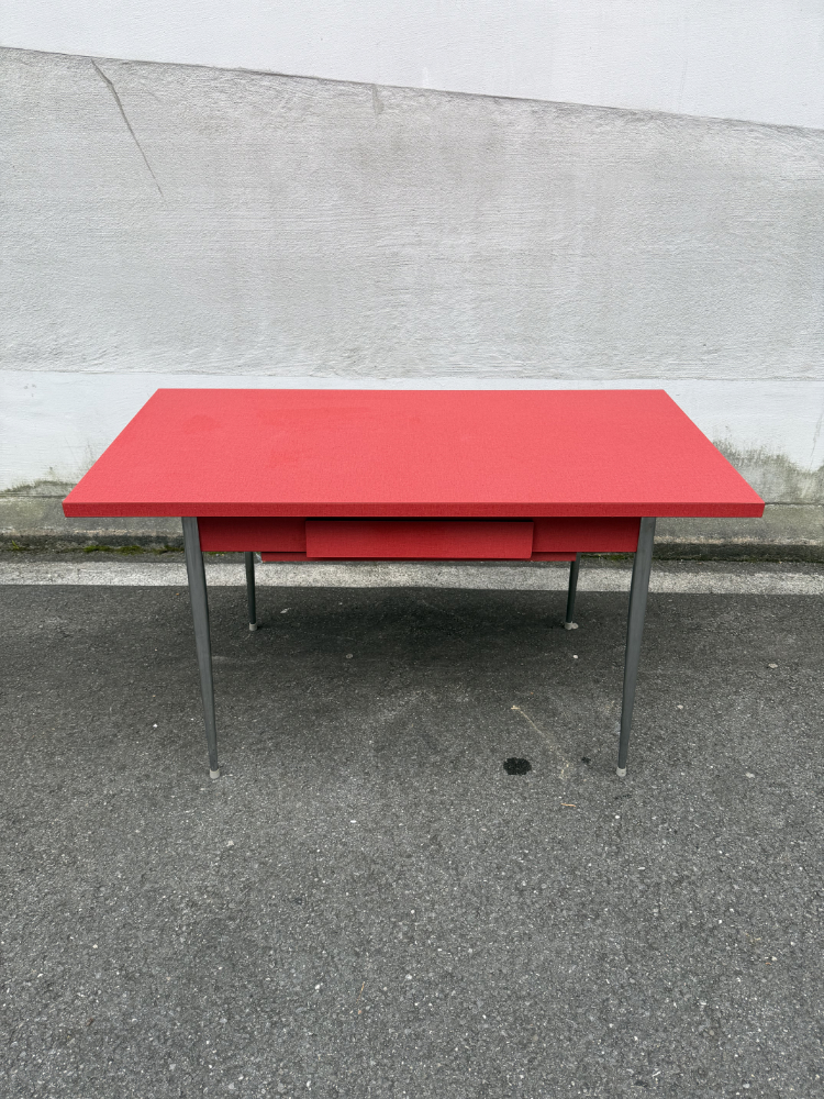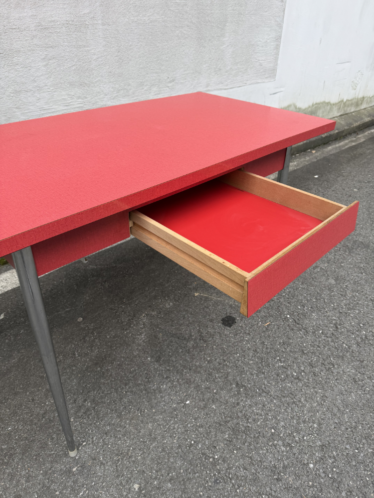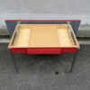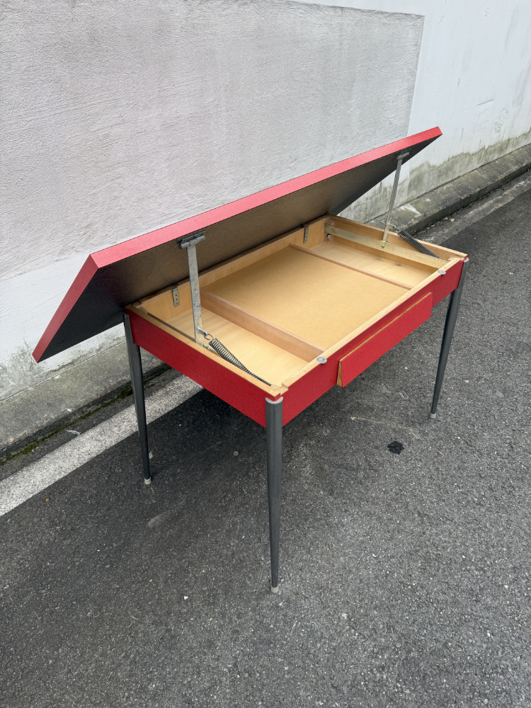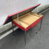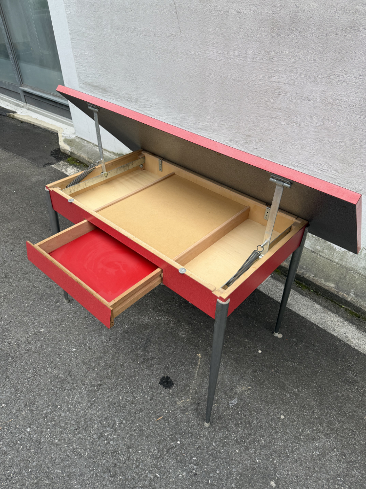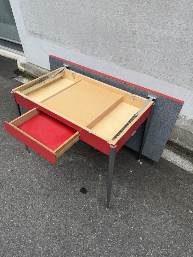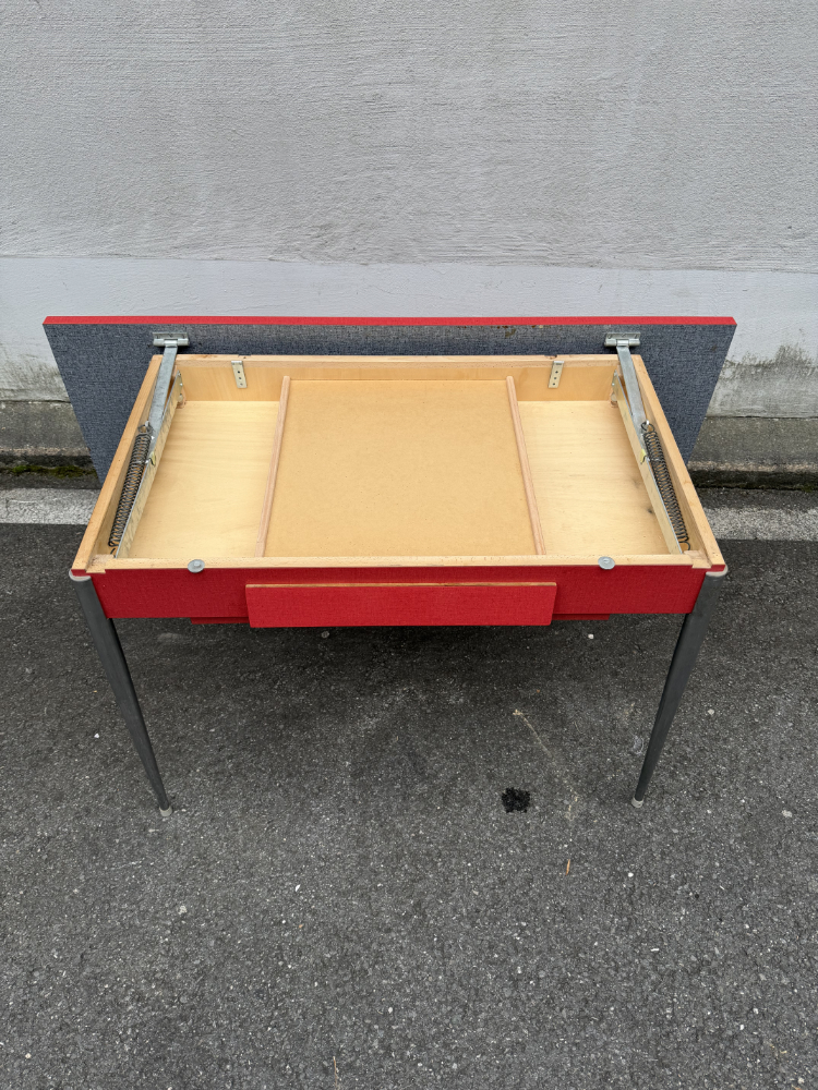 Seltenes Schweizer Mid-Century-Möbelstück aus den 1960er-Jahren mit roter Laminatoberfläche, filigranen Metallbeinen und funktionalem Innenleben. Der Tisch stammt vermutlich von Kelko Zürich und wurde ursprünglich als multifunktionaler Arbeits- oder Nähtisch konzipiert.