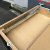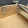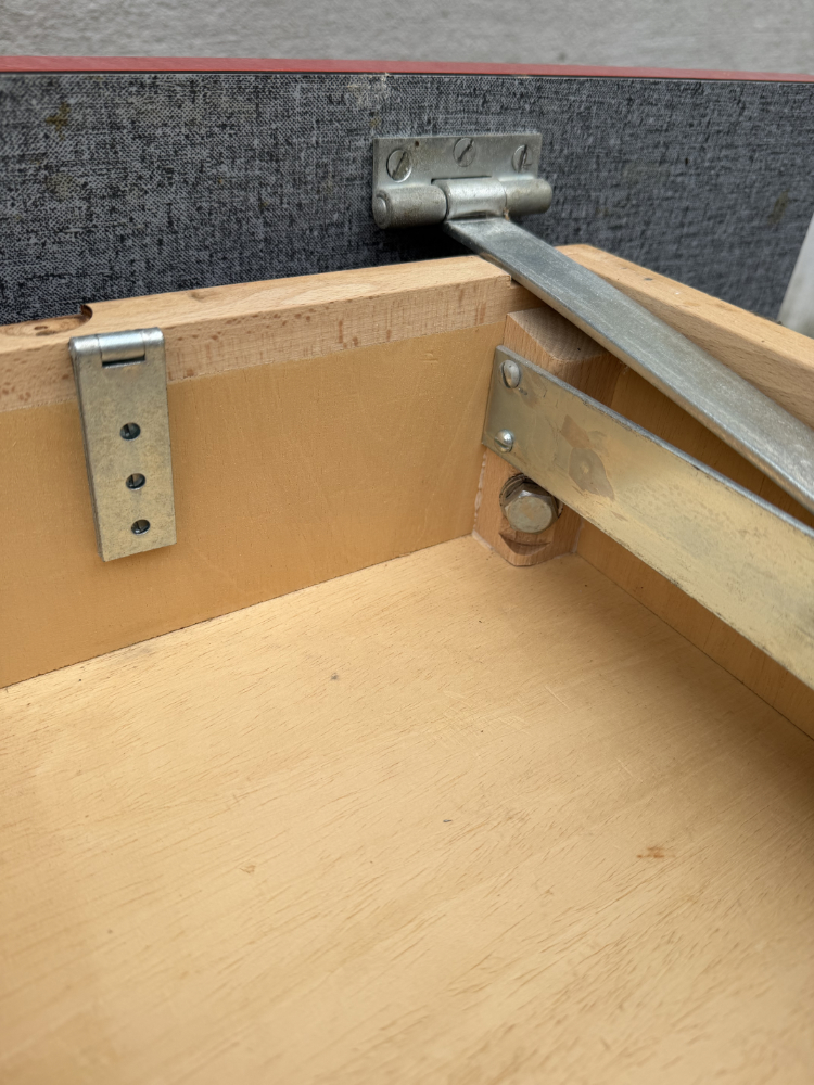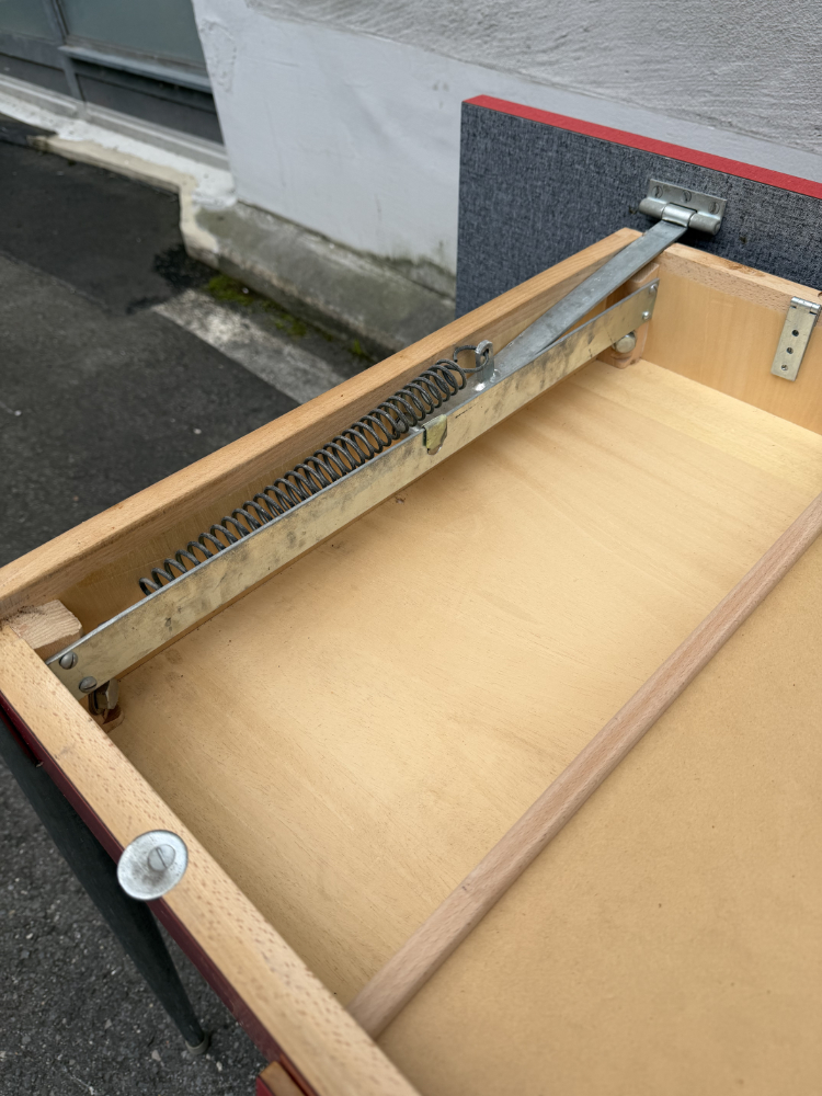 Die Tischplatte lässt sich komplett aufklappen und gibt darunter einen grosszügigen Stauraum mit stabiler Federmechanik frei – ideal für Schreib-, Zeichen- oder Nähutensilien. Unter der Platte befindet sich zusätzlich eine flache Auszugsfläche, die beim Arbeiten als temporäre Ablage für Maschinen, Unterlagen oder Werkzeuge diente.