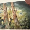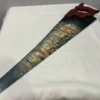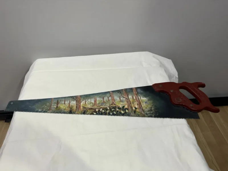Die Säge, die durch handbemalte, kunstvolle Malerei verziert ist, befindet sich in einem guten bis sehr guten Zustand. Dieses wunderschöne Exemplar zeichnet sich durch selbst gestaltete, eindrucksvolle Verzierungen aus. Auf ihr ist ein prächtiger Wald dargestellt, der in voller Blüte steht. Auch der Griff ist bemalt und mit schönen Verzierungen versehen. Die Säge trägt eine Signatur von M. Marty, von dem angenommen wird, dass es sich um eine Privatperson handelt, die dieses Stück angefertigt hat. Sie könnte zwar verwendet werden, eignet sich jedoch eher als attraktives Dekorationsobjekt.