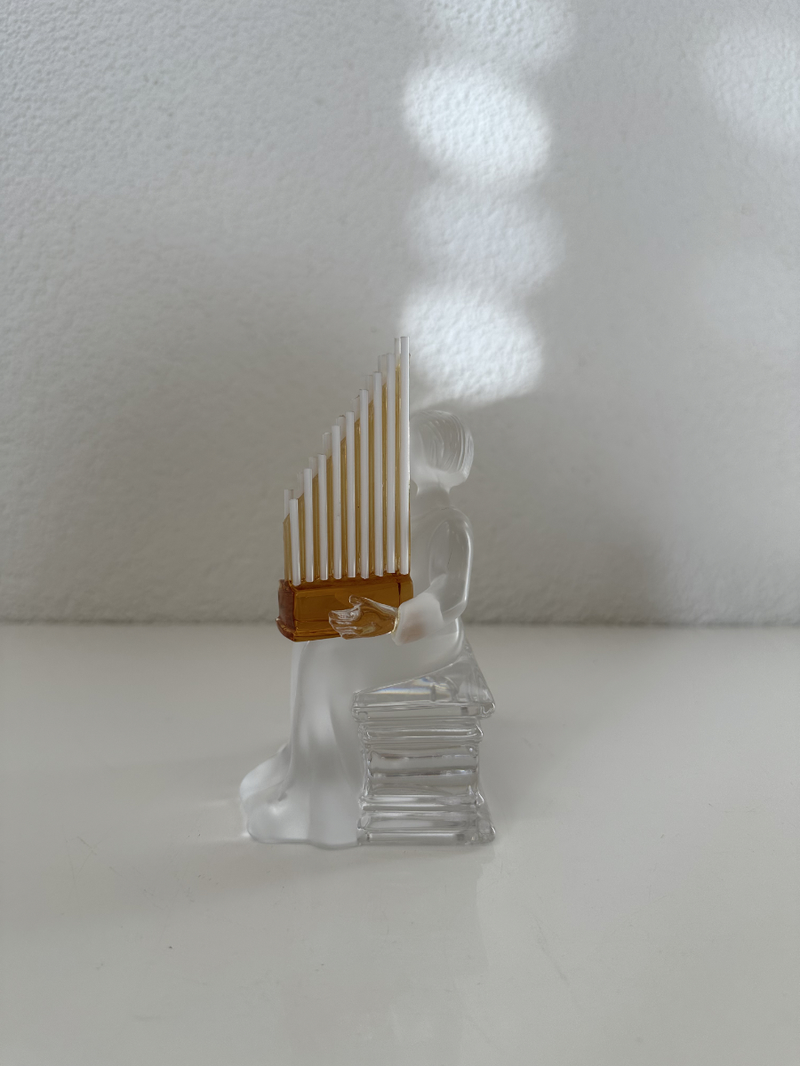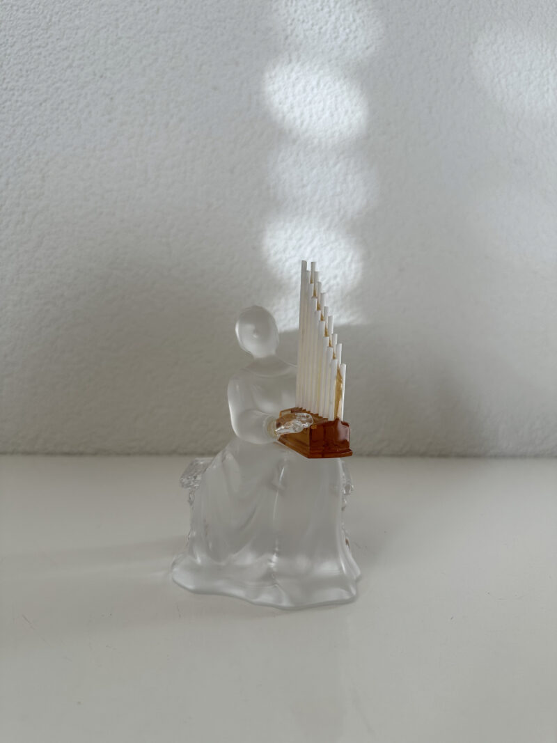 Satiniertes Kristall, klare Kanten und eine fein gearbeitete Orgel in warmem Amberton: Diese Saint Louis Figur zeigt einen sitzenden Musiker mit Pfeifenorgel und wirkt wie eine kleine Szene aus Glas. Die Orgelpfeifen sind gestaffelt nach oben aufgebaut, wodurch das Stück eine elegante Höhe bekommt. Besonders schön ist der Kontrast zwischen dem mattierten Körper und dem klaren, massiven Sockel. Auf der Unterseite ist die Signatur Saint Louis zu erkennen.