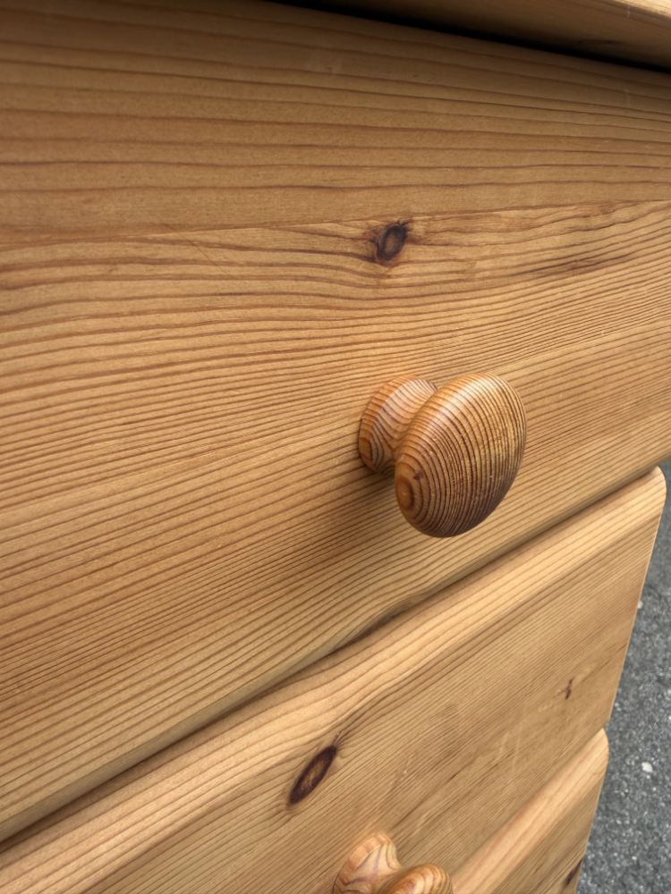 Diese Kommode aus massivem Kiefernholz verbindet natürliche Ausstrahlung mit praktischer Funktion. Die warme Holzfarbe, die sichtbare Maserung und die runden Griffe verleihen ihr ein harmonisches, wohnliches Erscheinungsbild. Mit fünf gleich grossen Schubladen bietet sie kompakten Stauraum für Kleidung, Accessoires oder Bürobedarf. Der Zustand ist sehr gut, das Holz wirkt gepflegt und stabil.