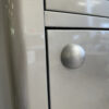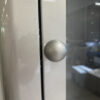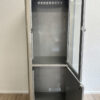 Hohe, schlanke Form und richtig praktisch aufgebaut: Oben eine Glastür mit zwei Glasböden für alles, was man sehen möchte, unten ein geschlossenes Fach für Dinge, die verschwinden sollen. Die Oberfläche ist in einem hellgrauen Ton lackiert, mit runden Metallknäufen und Lüftungsschlitzen an der Rückseite, dadurch wirkt der Schrank wie aus Praxis, Labor oder Werkstatt. Passt aber genauso gut in moderne Wohnungen, ins Atelier, in den Laden oder ins Büro.