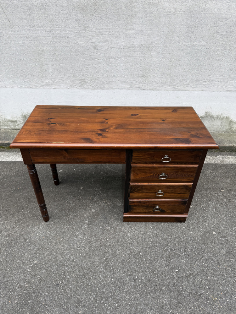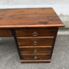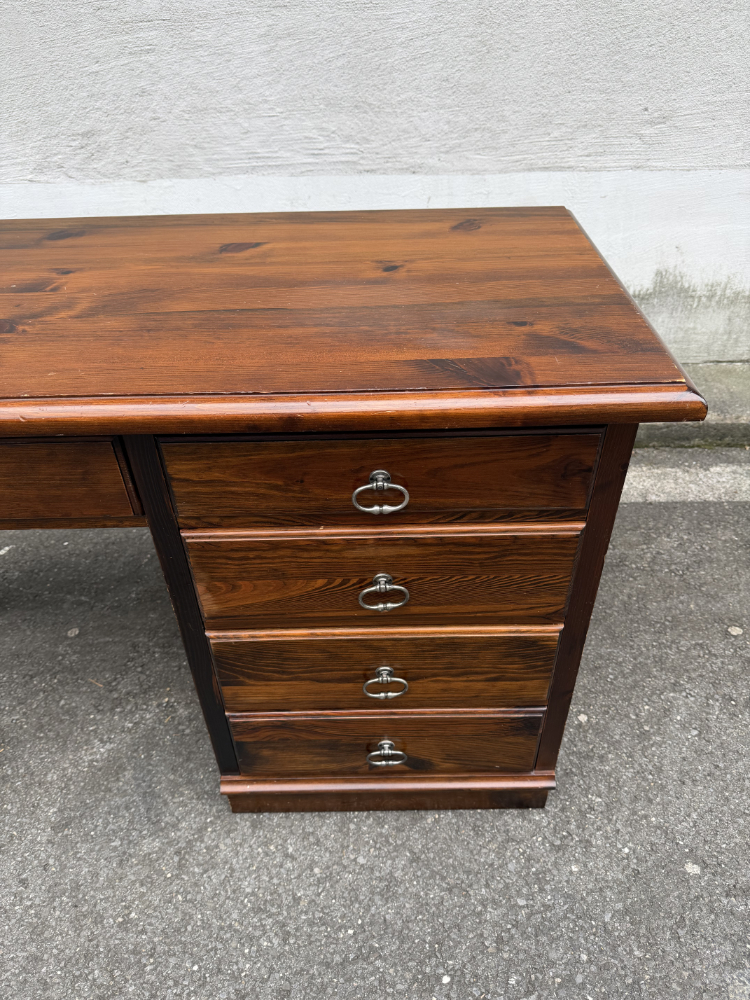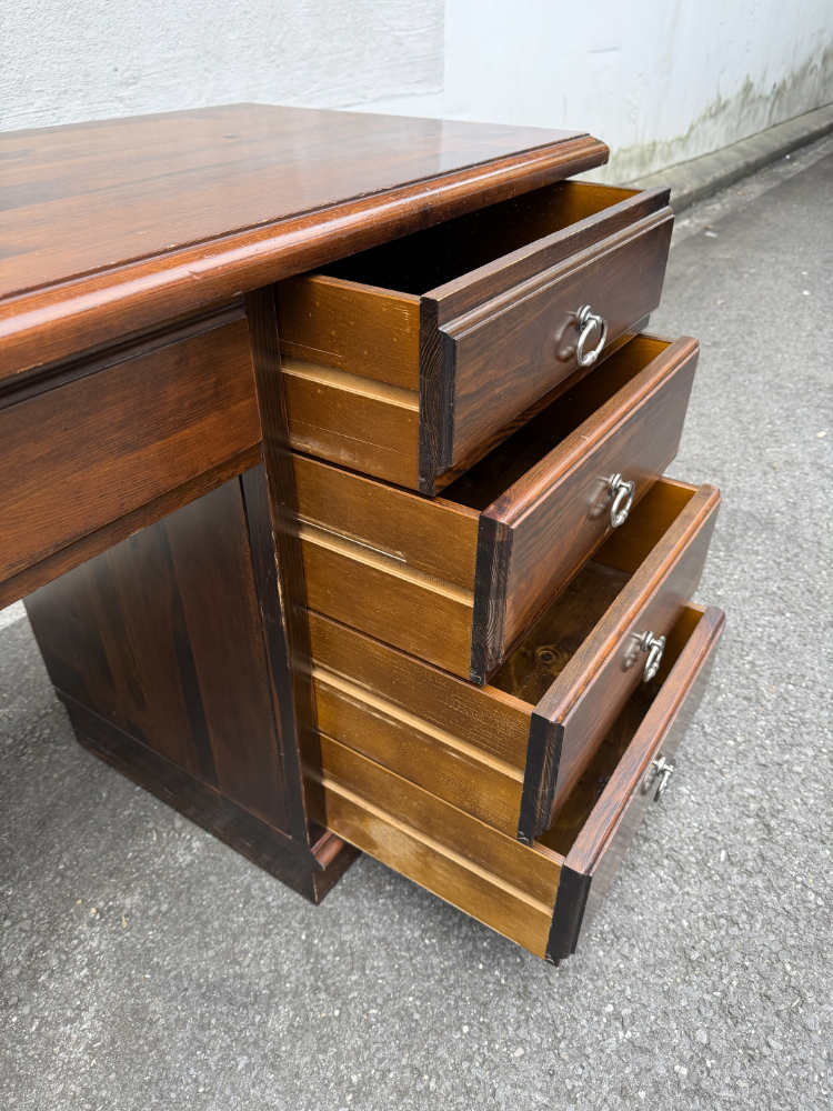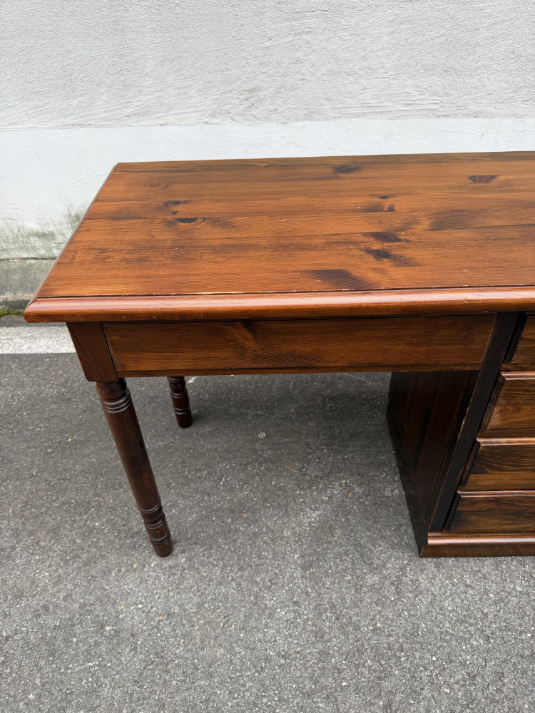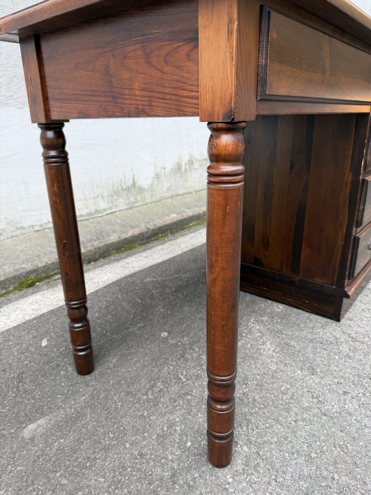 Auf der rechten Seite befindet sich eine praktische Schubladenkombination mit vier unterschiedlich tiefen Fächern, versehen mit gedrehten Metallgriffen. Die linke Seite ist mit einer gedrechselten Stützsäule versehen, was dem Tisch eine klassische, leicht rustikale Note verleiht. Die Oberfläche wurde in einem satten Mittelbraun poliert und betont die natürliche Struktur des Holzes.
