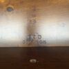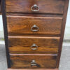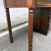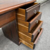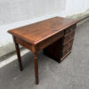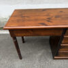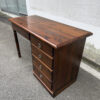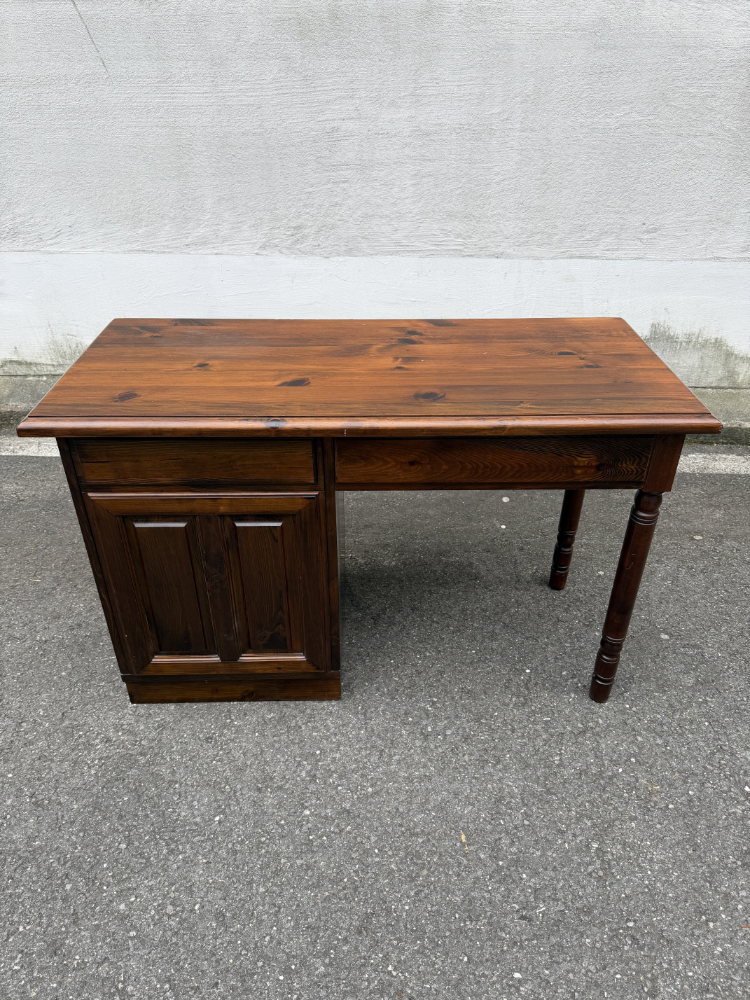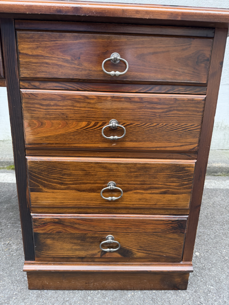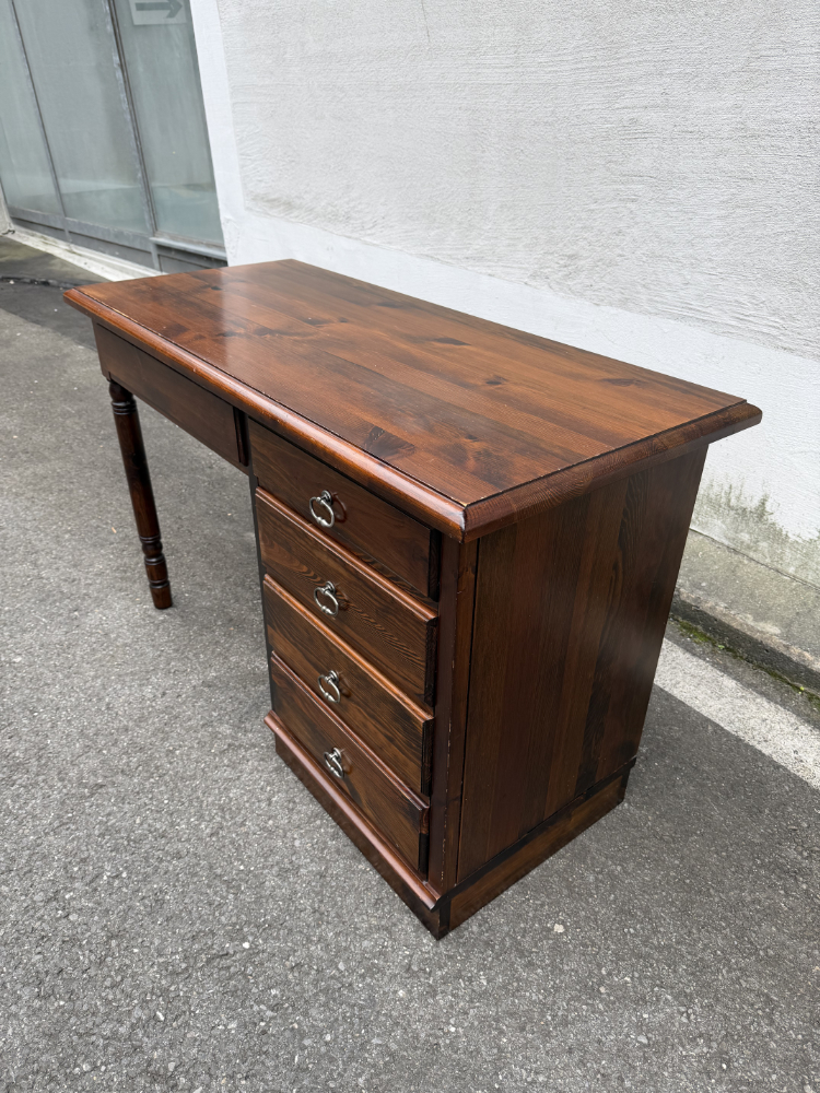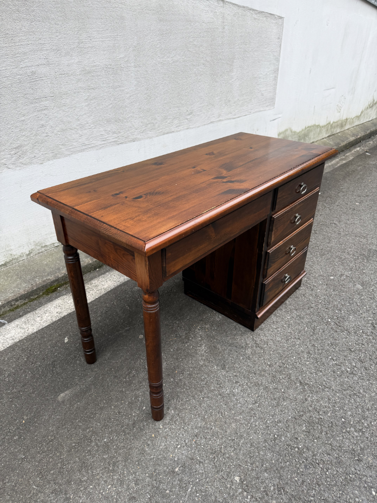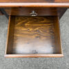 Auf der rechten Seite befindet sich eine praktische Schubladenkombination mit vier unterschiedlich tiefen Fächern, versehen mit gedrehten Metallgriffen. Die linke Seite ist mit einer gedrechselten Stützsäule versehen, was dem Tisch eine klassische, leicht rustikale Note verleiht. Die Oberfläche wurde in einem satten Mittelbraun poliert und betont die natürliche Struktur des Holzes.