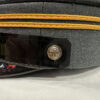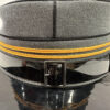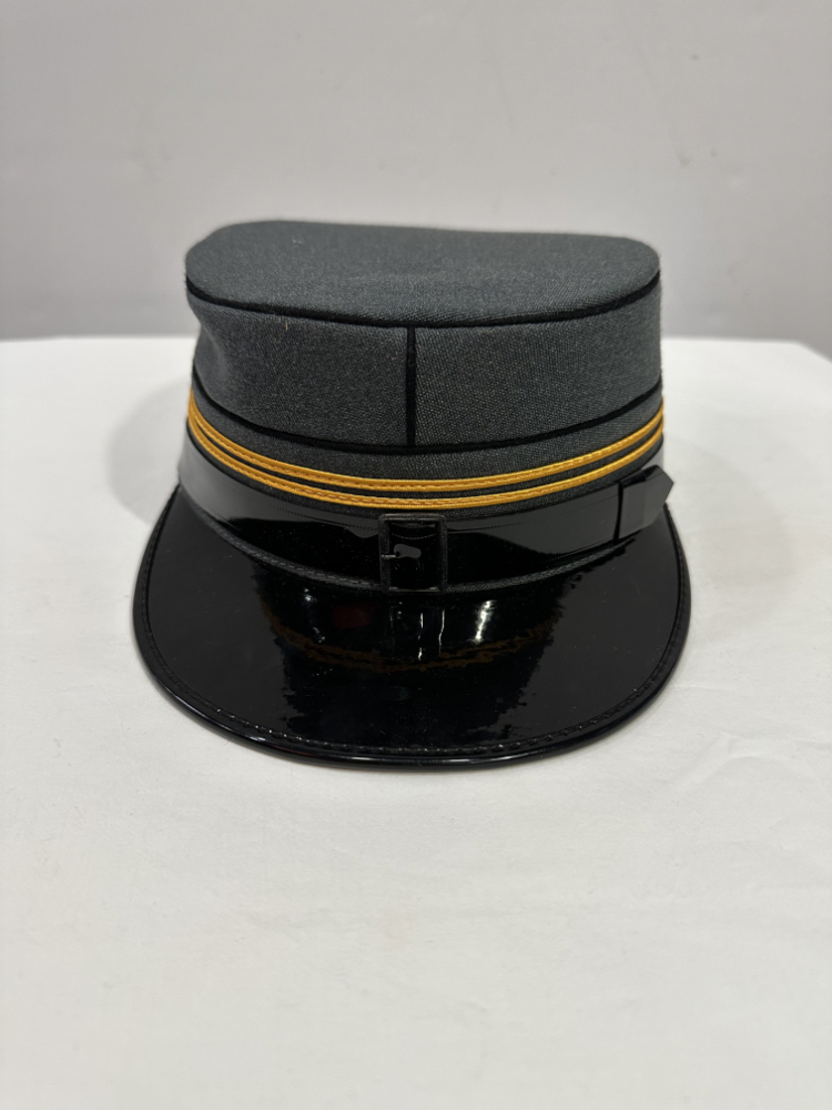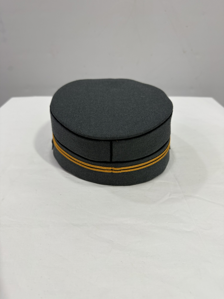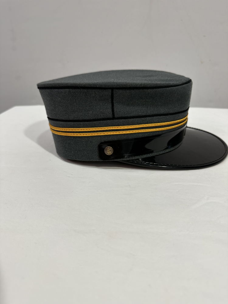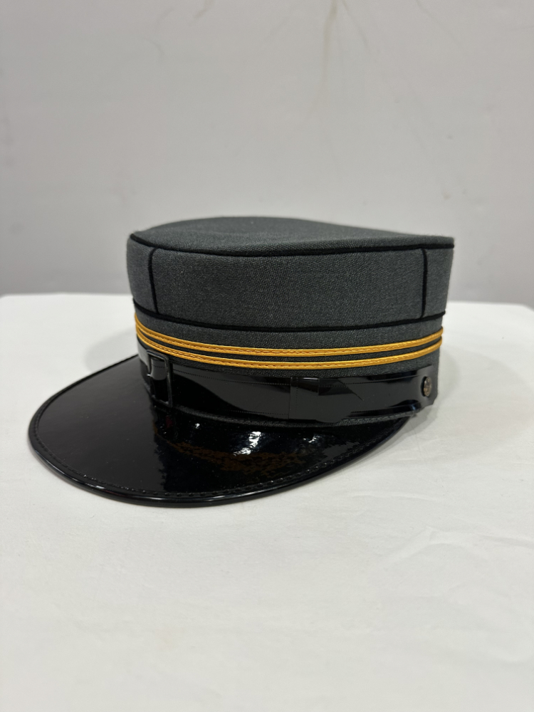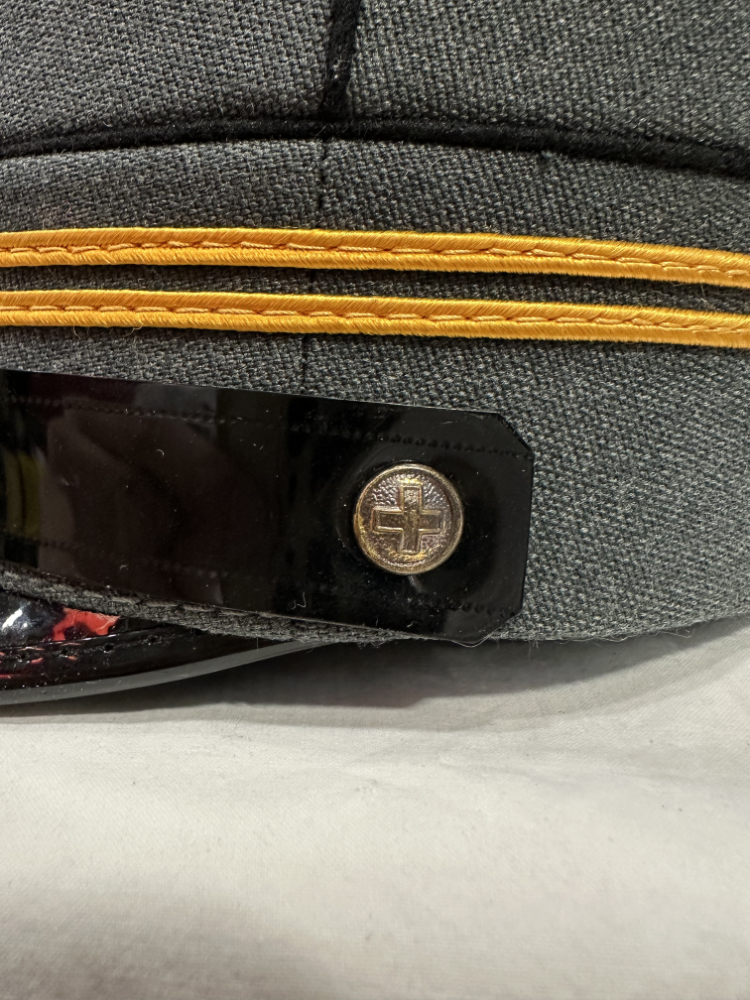 Diese klassische Schweizer Offiziersmütze stammt aus der traditionsreichen Mützenfabrik Hediger in St. Gallen, die für hochwertige Uniform und Dienstkopfbedeckungen bekannt ist. Das Modell ist in einem dunkelgrauen Wollstoff gefertigt, mit doppelter goldgelber Kordel und einer glänzenden schwarzen Kunststoffvisierkappe, ein typisches Merkmal für Mützen des Schweizer Militärs und öffentlicher Dienste.