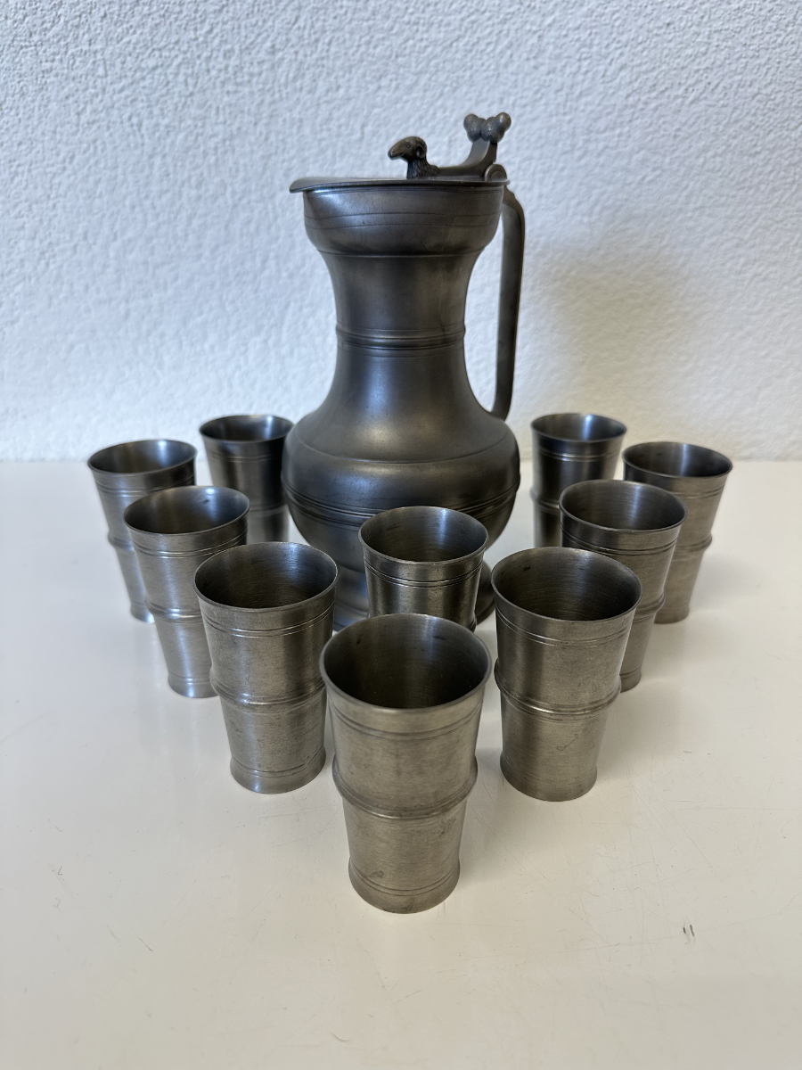 ✅ Vintage Zinnservice bestehend aus 1 Krug mit Deckel und 9 Bechern