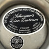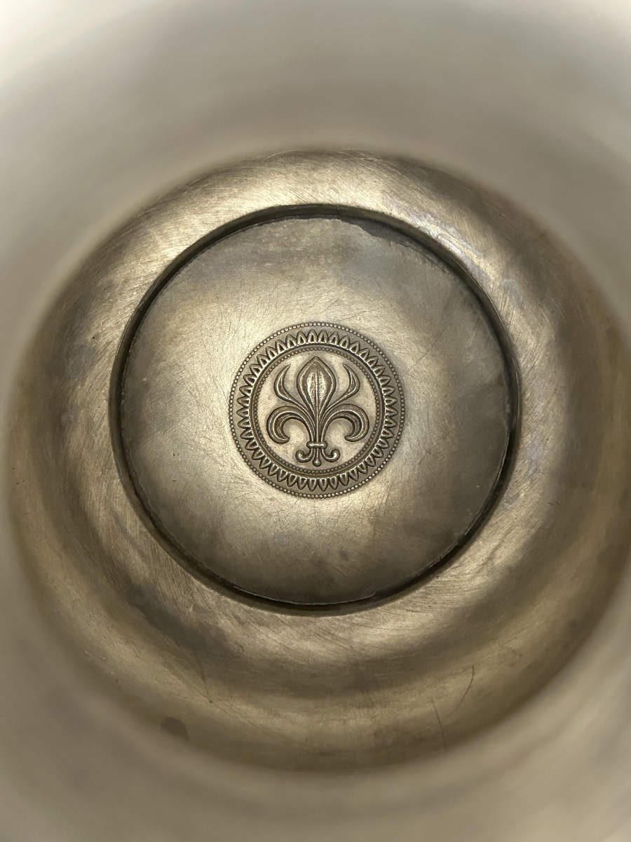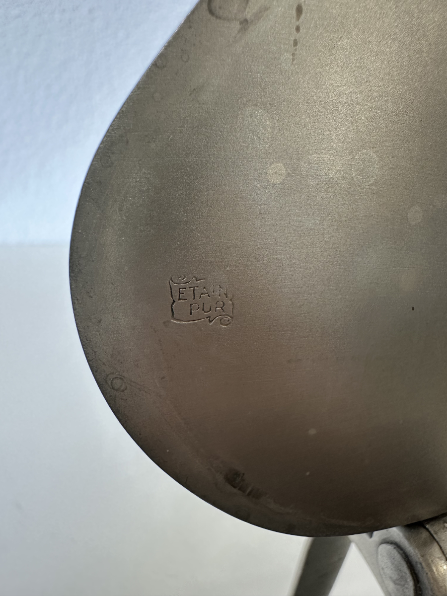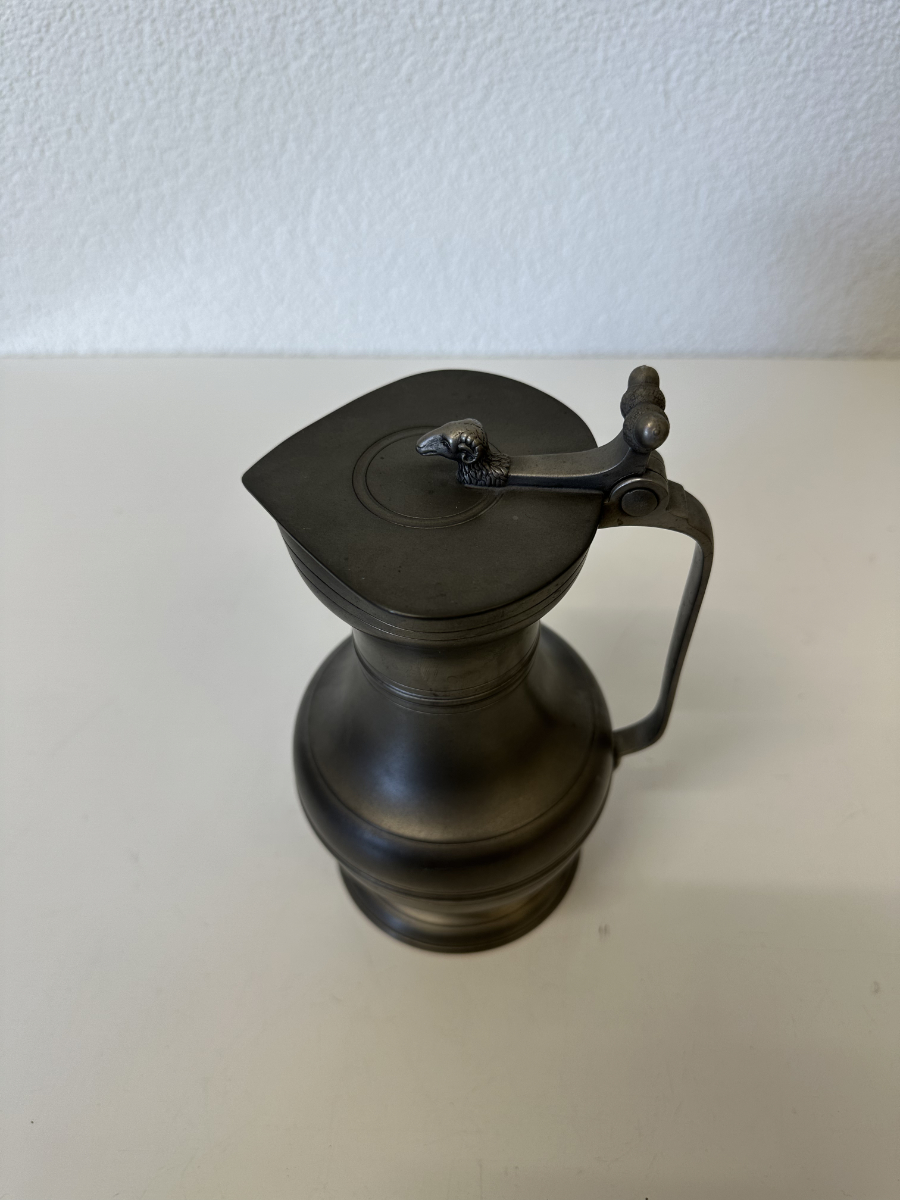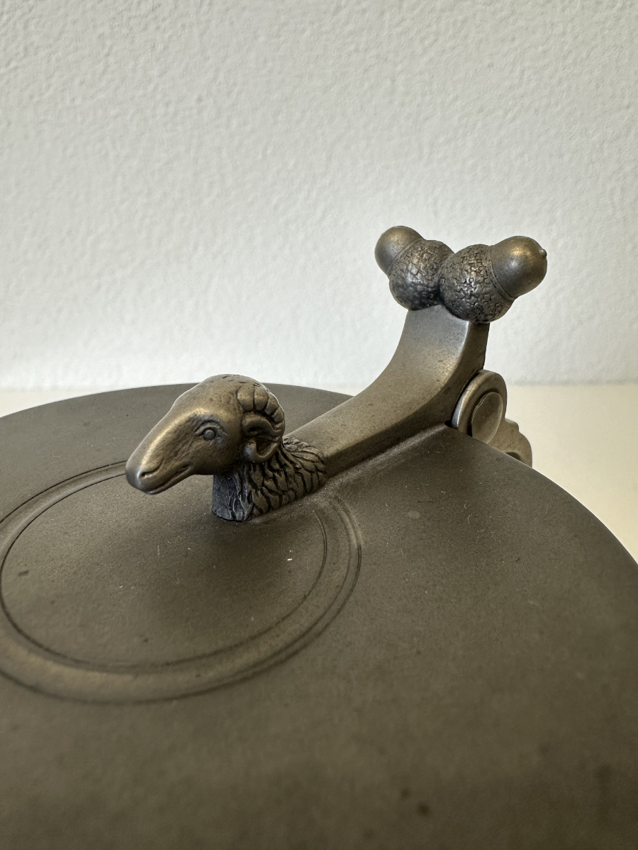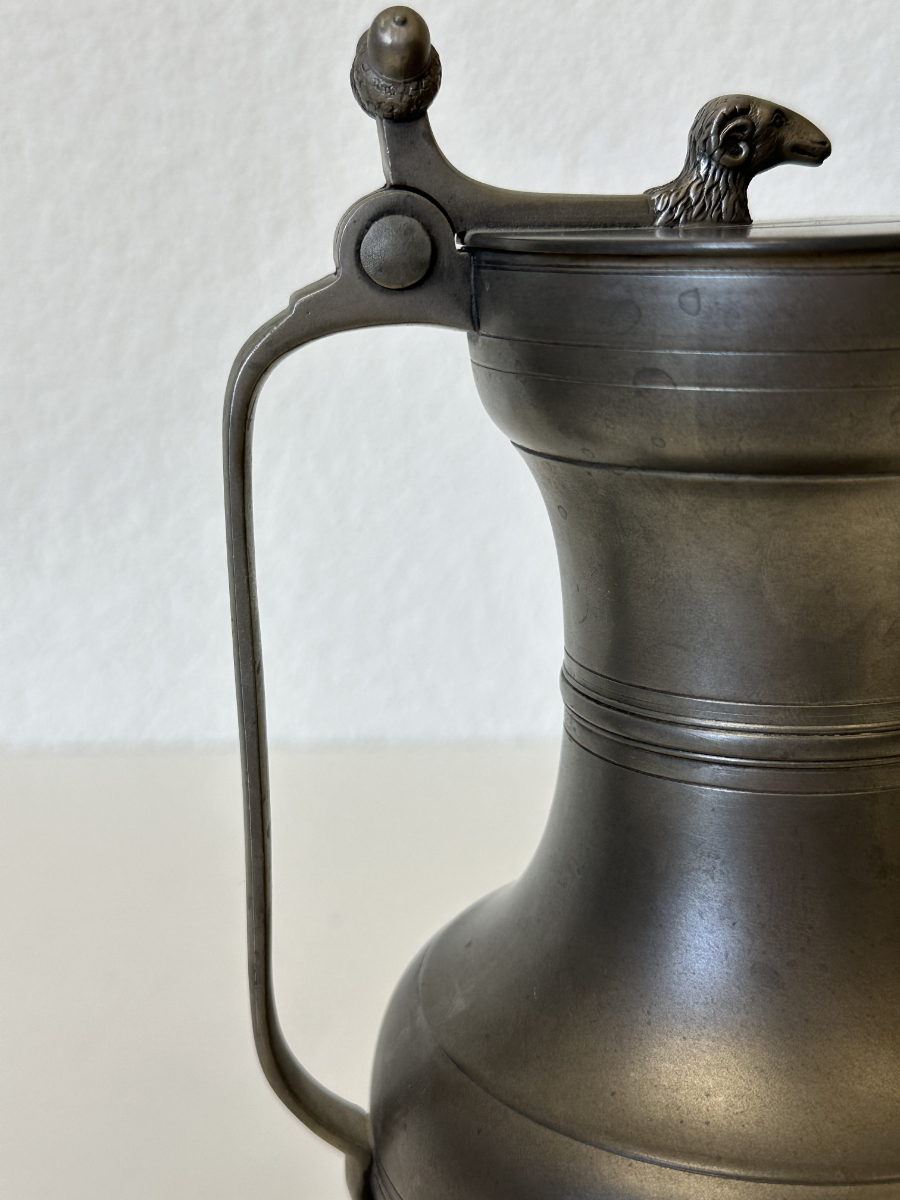 Schweres Zinn, matte Patina und ein Deckel mit kleinem Widderkopf als Griff machen dieses Service sofort zum Hingucker. Der Krug liegt gut in der Hand, hat einen praktischen Ausguss und einen Klappdeckel, der beim Einschenken sauber mitgeht. Dazu kommen 9 passende Zinnbecher im gleichen Stil. Innen ist ein Emblem mit Lilienmotiv zu sehen, am Deckel ist ein Aufkleber vom Schwyzer Zinn Zentrum. Perfekt für den Stammtisch, die Hausbar oder als Deko auf dem Buffet.