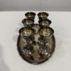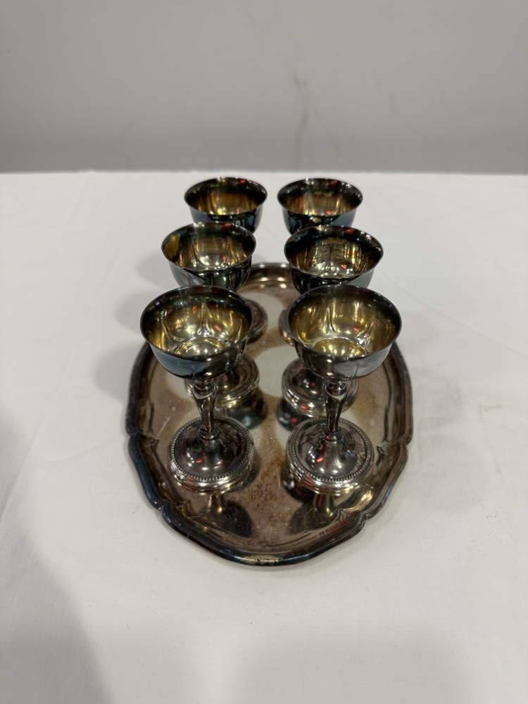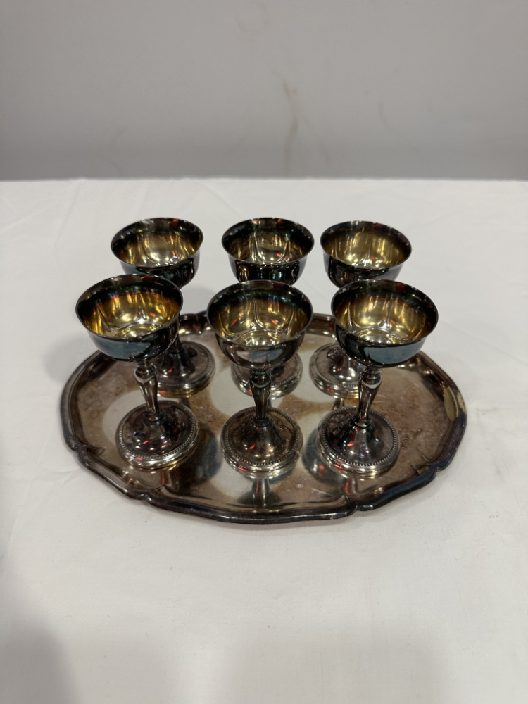 Set aus 6 versilberten Likörkelchen mit Tablett