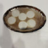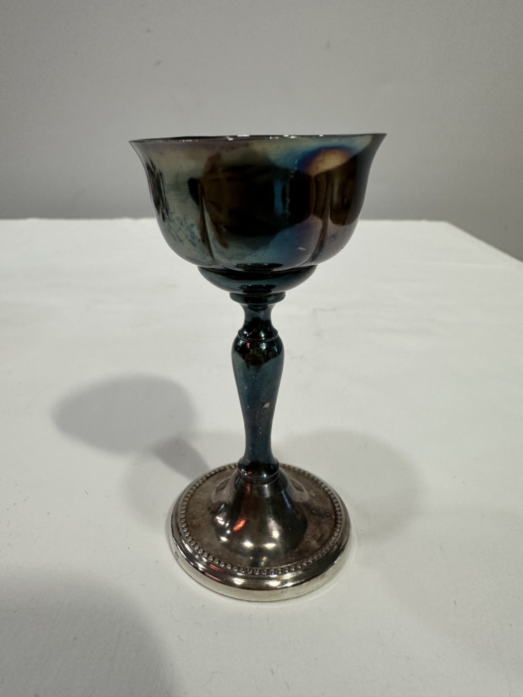 Dieses elegante Vintage Set besteht aus sechs fein gearbeiteten Likörkelchen und einem passenden Serviertablett. Die Kelche sind aus versilbertem Metall gefertigt, zeigen einen klassischen Pokalfuss mit Zierkante und haben innen eine goldfarbene Auslegung, die stilvolle Akzente setzt. Das ovale Tablett greift das Design harmonisch auf und besitzt einen geschwungenen Rand mit feiner Patina, ein schönes Detail, das den Charakter echter Handarbeit unterstreicht.