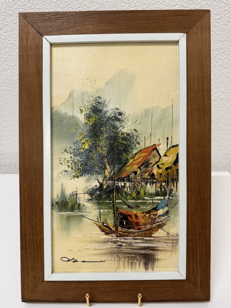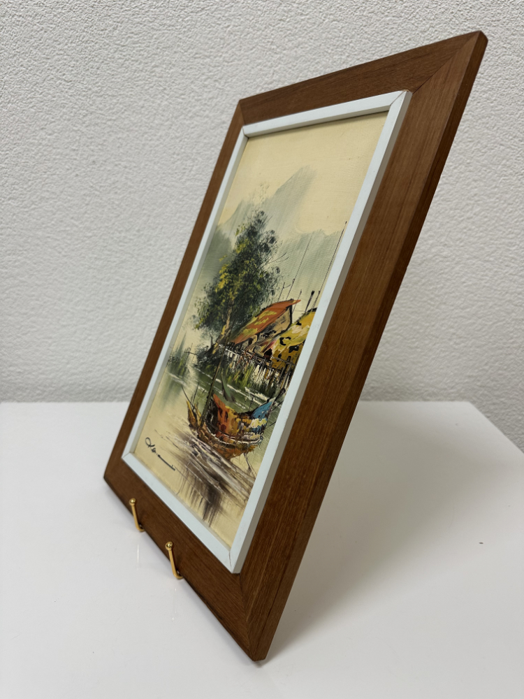 Signiertes Ölbild mit Bootsmotiv, Landschaftsszene auf Leinwand im Holzrahmen