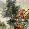 Ruhige Wasserflächen, ein traditionelles Boot und locker gesetzte Pinselzüge prägen diese stimmungsvolle Landschaftsszene. Die Komposition lebt vom Zusammenspiel aus warmen Ocker-, Braun- und Grüntönen, ergänzt durch feine dunkle Linien, die dem Motiv Tiefe und Bewegung verleihen. Der Farbauftrag ist sichtbar strukturiert und verleiht dem Bild eine lebendige, handgemalte Ausstrahlung.