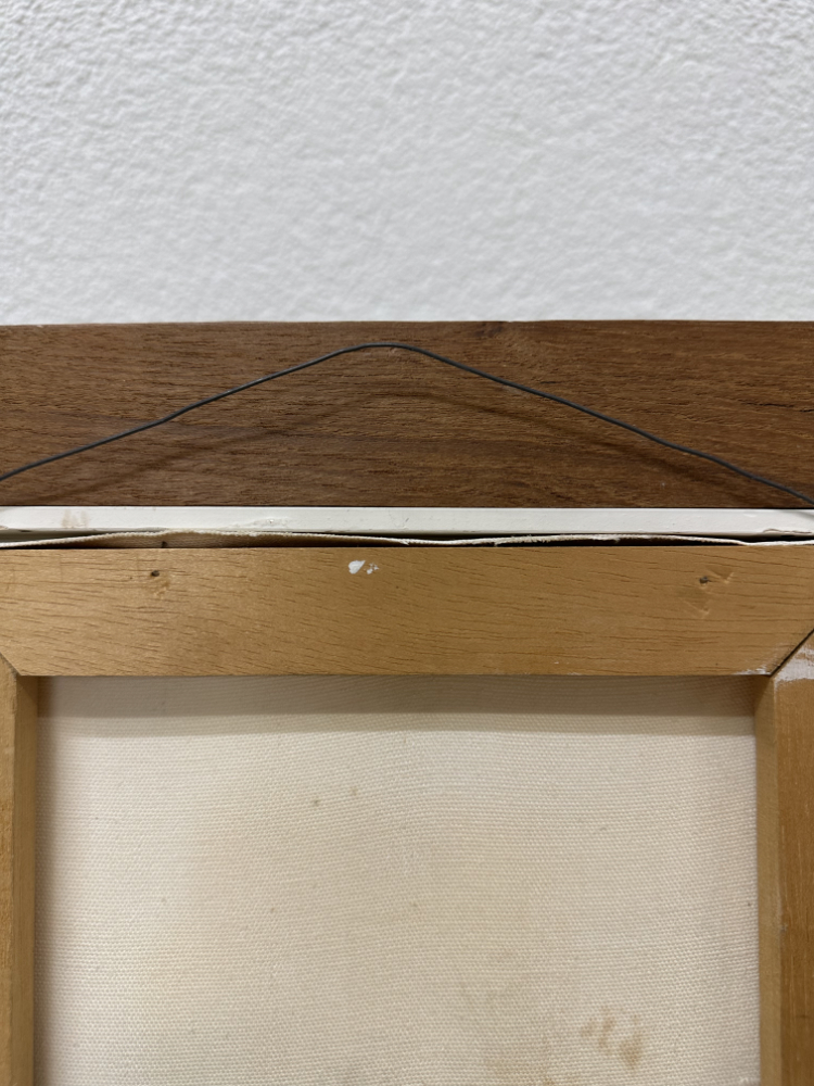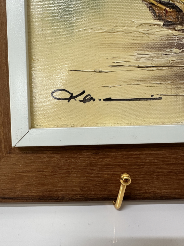 Das Gemälde ist unten links signiert, der Künstler oder die Künstlerin ist nicht eindeutig zuordenbar. Die Arbeit ist auf Leinwand ausgeführt und in einem schlichten, hochwertigen Holzrahmen mit heller Innenleiste gefasst. Eine stabile Aufhängung ist rückseitig vorhanden, zusätzlich eignet sich das Bild auch für die Präsentation auf einem Möbelstück oder Sideboard.