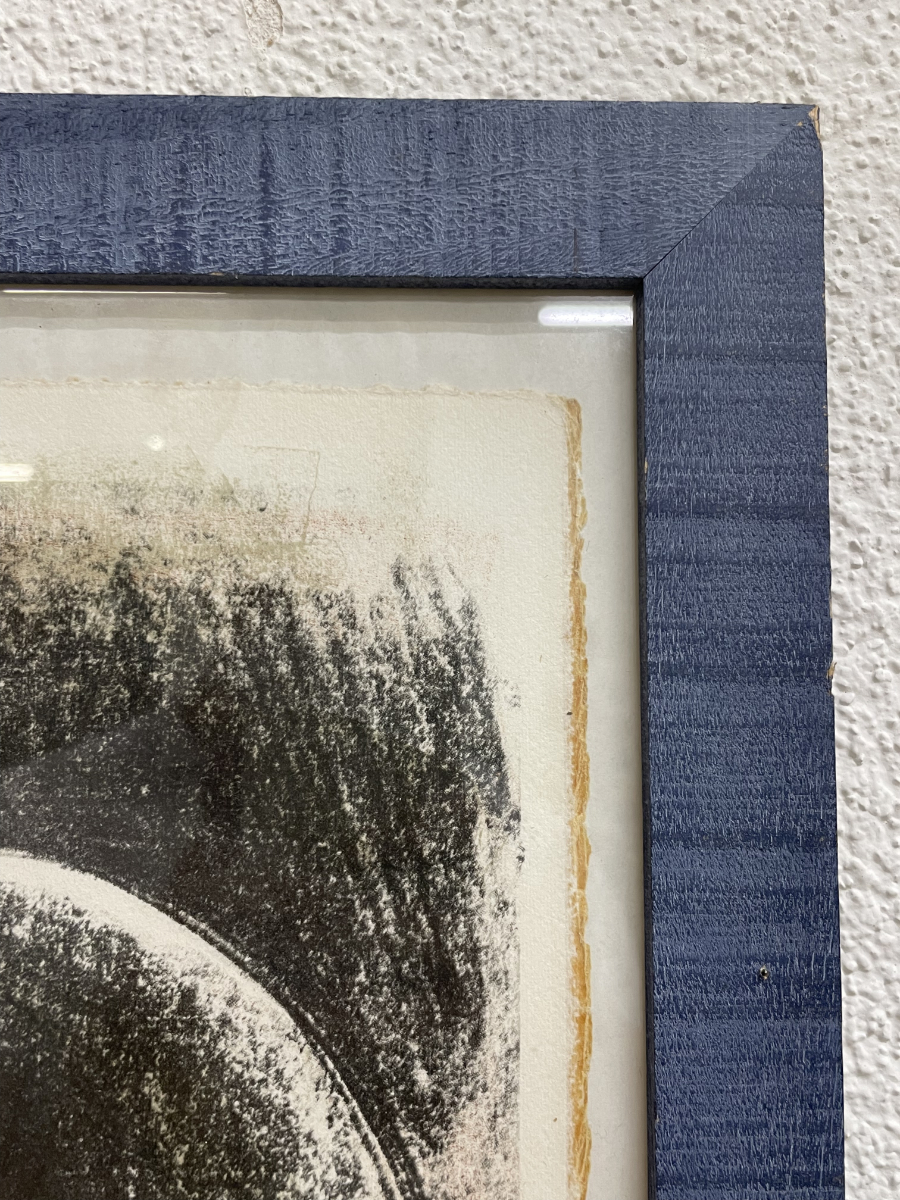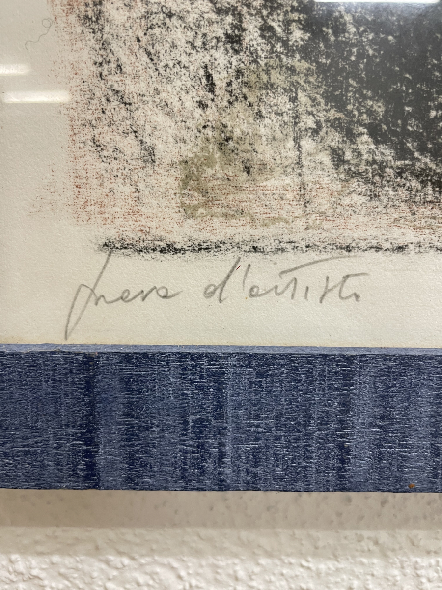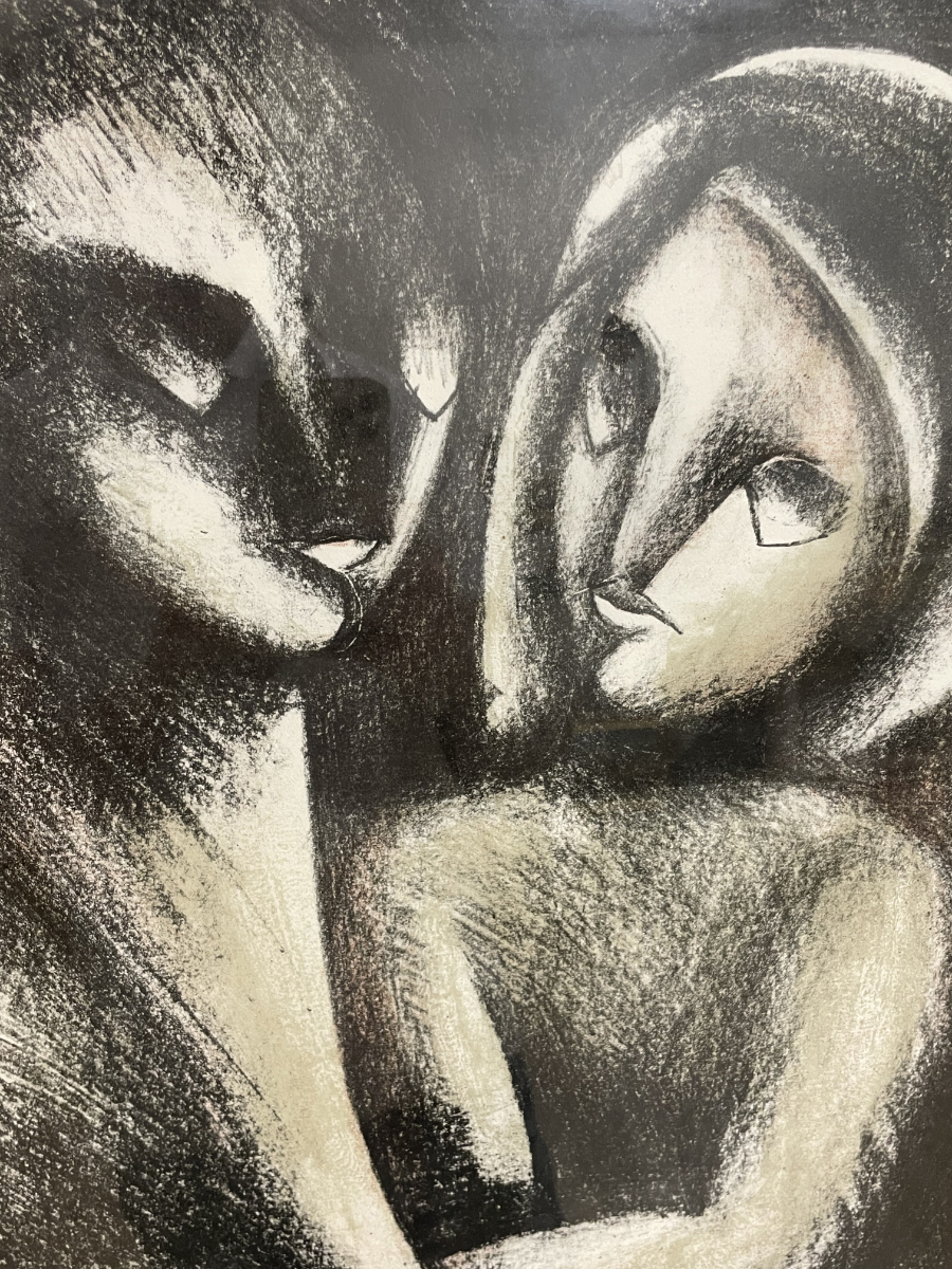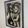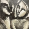 1976 entstand dieses Werk mit dem Titel «Maternità» vom italienischen Künstler Enrico Muscetra (geboren 1946 in Alezio). Zwei stilisierte Figuren stehen sich nah gegenüber, die Szene wirkt wie ein stiller Moment zwischen Mutter und Kind. Kohle- und Kreideflächen in Schwarz, Grau und warmen Beige-Tönen geben dem Bild Tiefe, Kontrast und eine ruhige Spannung. Unten ist das Werk beschriftet und signiert, gerahmt hinter Glas in einem blau gefassten Holzrahmen.