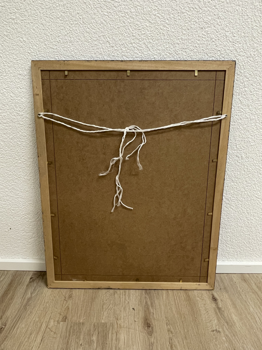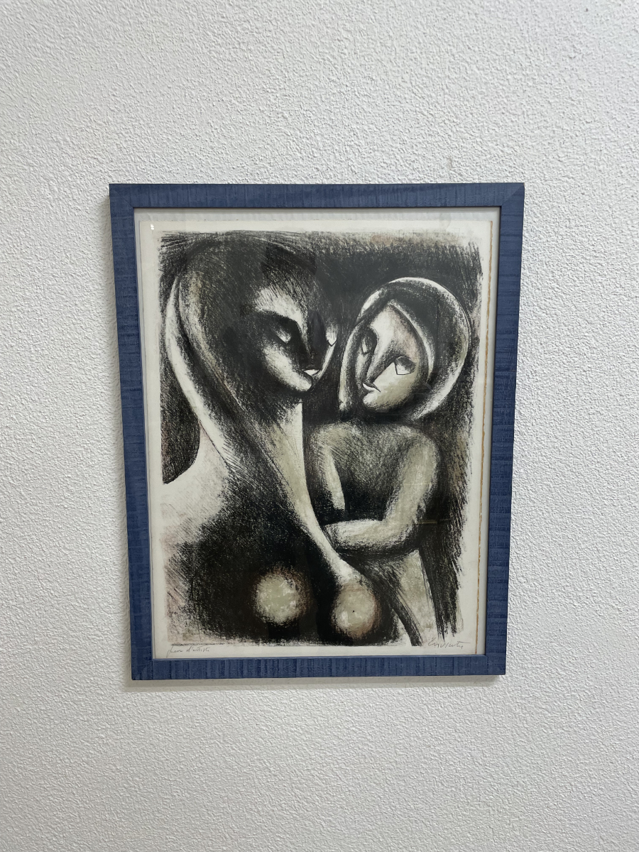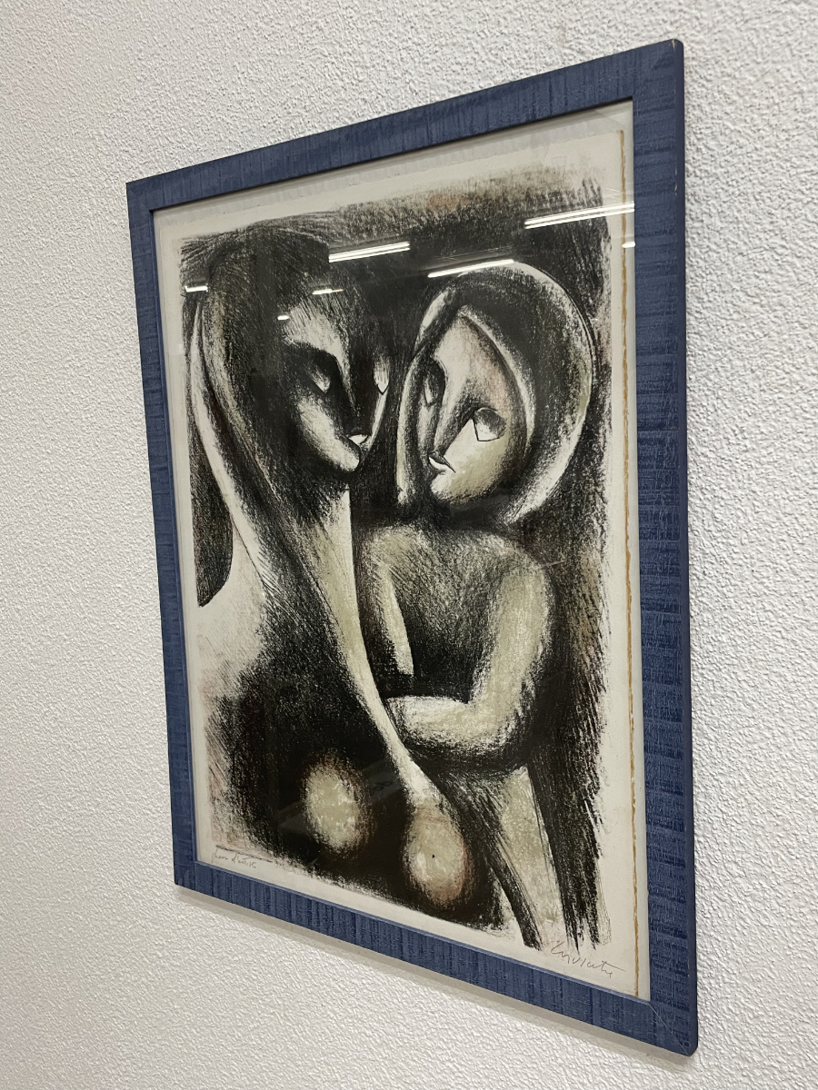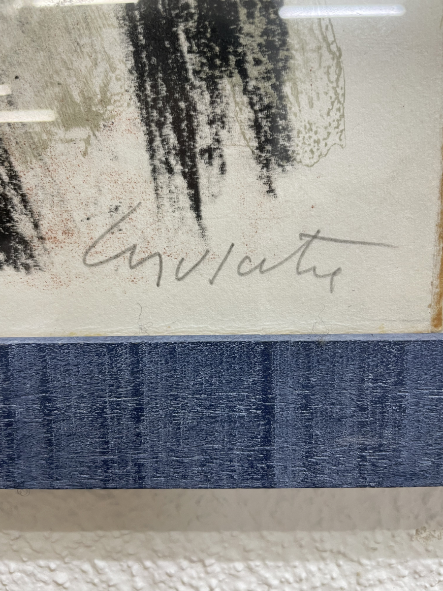 1976 entstand dieses Werk mit dem Titel «Maternità» vom italienischen Künstler Enrico Muscetra (geboren 1946 in Alezio). Zwei stilisierte Figuren stehen sich nah gegenüber, die Szene wirkt wie ein stiller Moment zwischen Mutter und Kind. Kohle- und Kreideflächen in Schwarz, Grau und warmen Beige-Tönen geben dem Bild Tiefe, Kontrast und eine ruhige Spannung. Unten ist das Werk beschriftet und signiert, gerahmt hinter Glas in einem blau gefassten Holzrahmen.