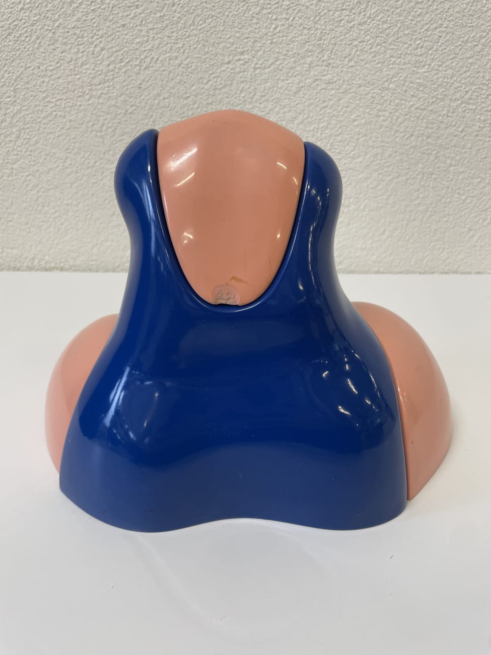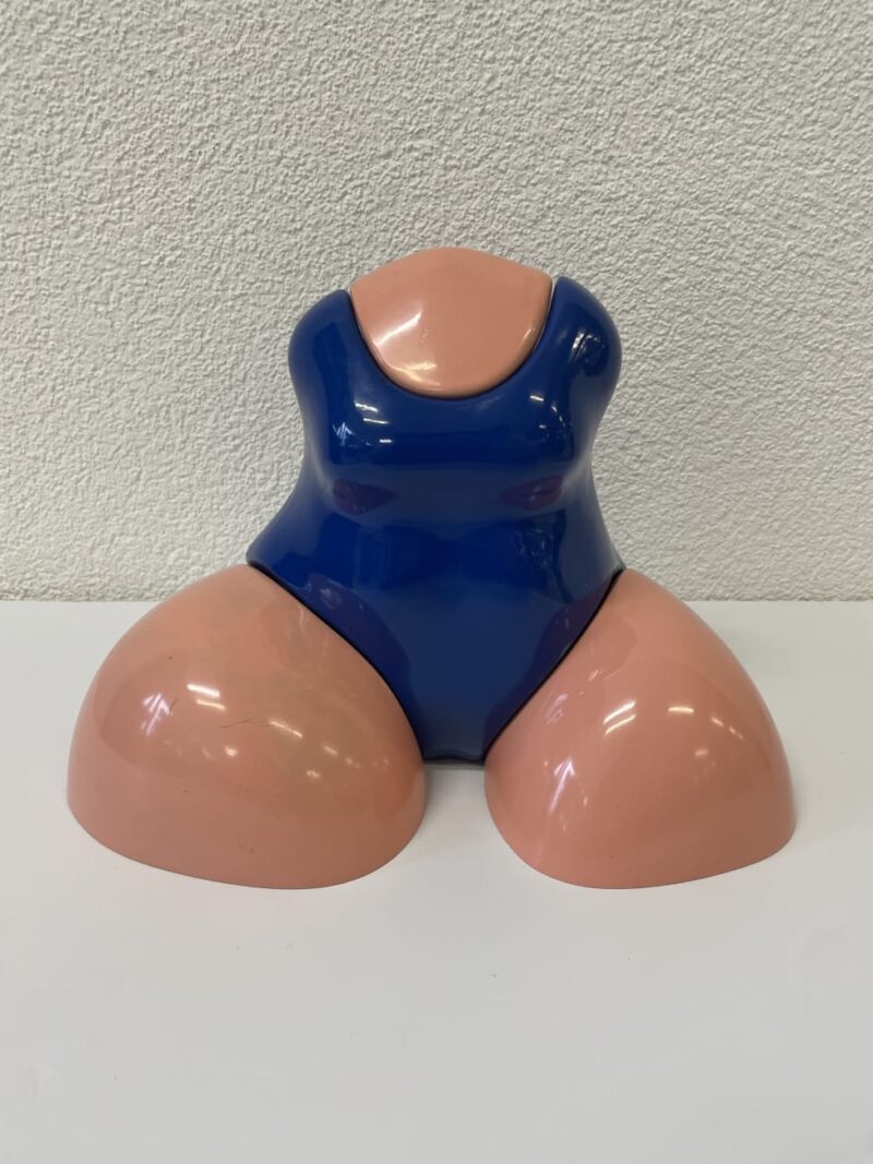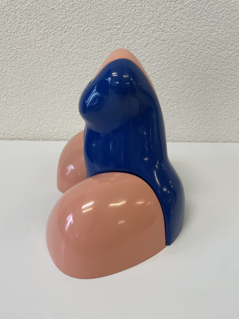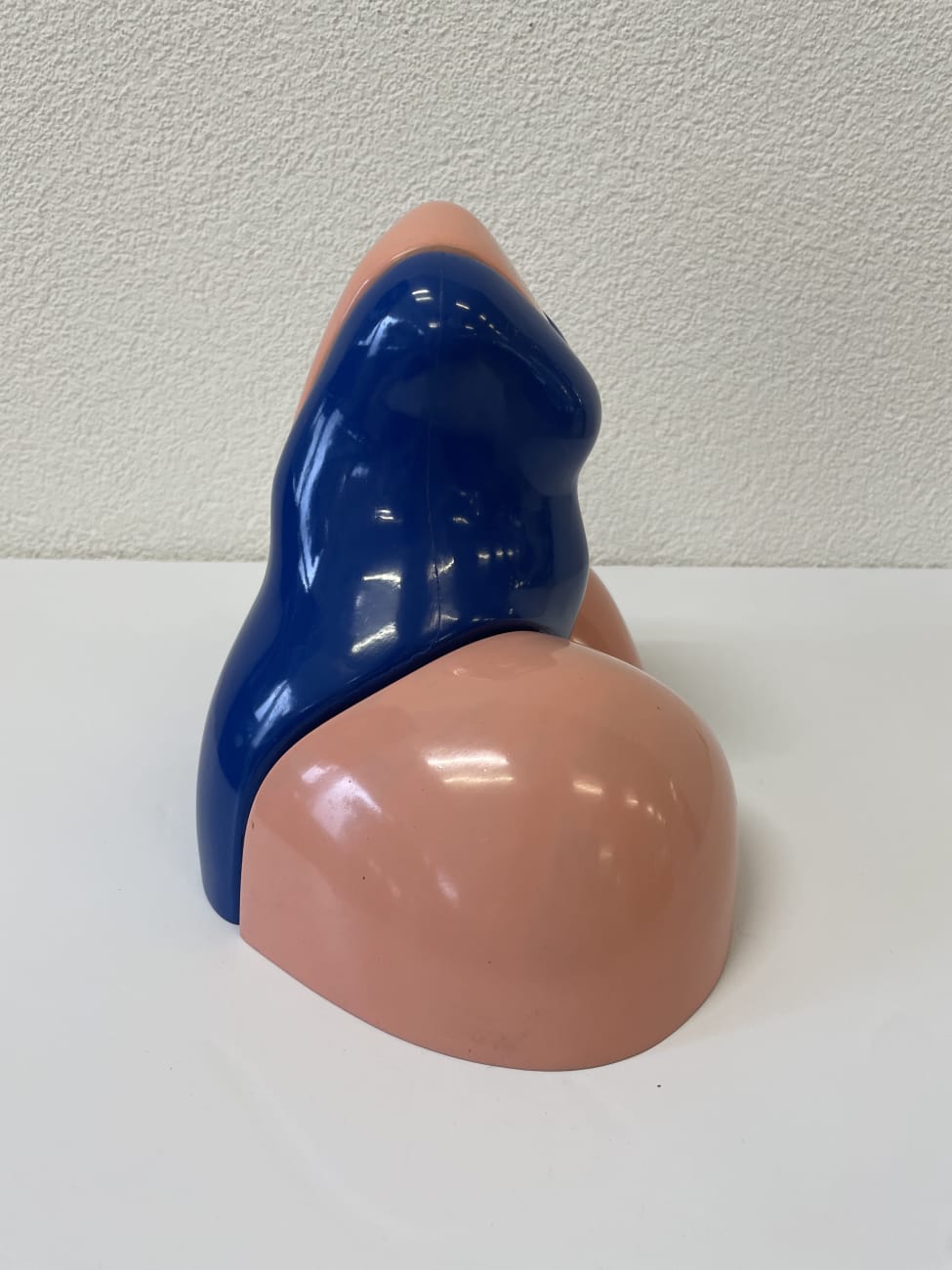 Kräftige Farben und runde Formen machen diese Skulptur sofort sichtbar im Raum. Der blaue obere Teil geht klar in den rosa Unterkörper über und erinnert abstrakt an einen menschlichen Körper. Die Oberfläche wirkt glatt und glänzend, ohne Muster oder Struktur. Als freistehendes Objekt findet sie gut Platz auf einem Sideboard, im Regal oder auf einem Podest. Sie befindet sich in einem guten Zustand mit leichten Macken am hinteren Teil, die von vorne nicht sichtbar sind.