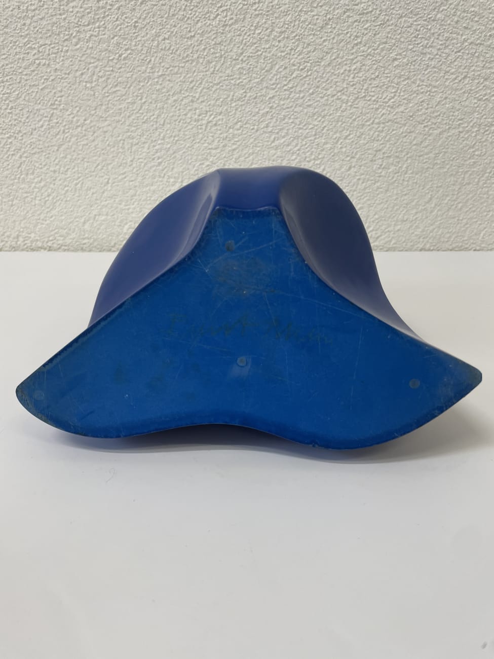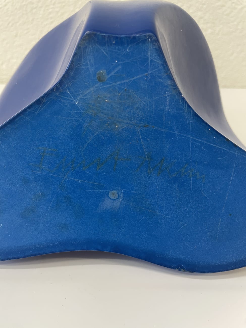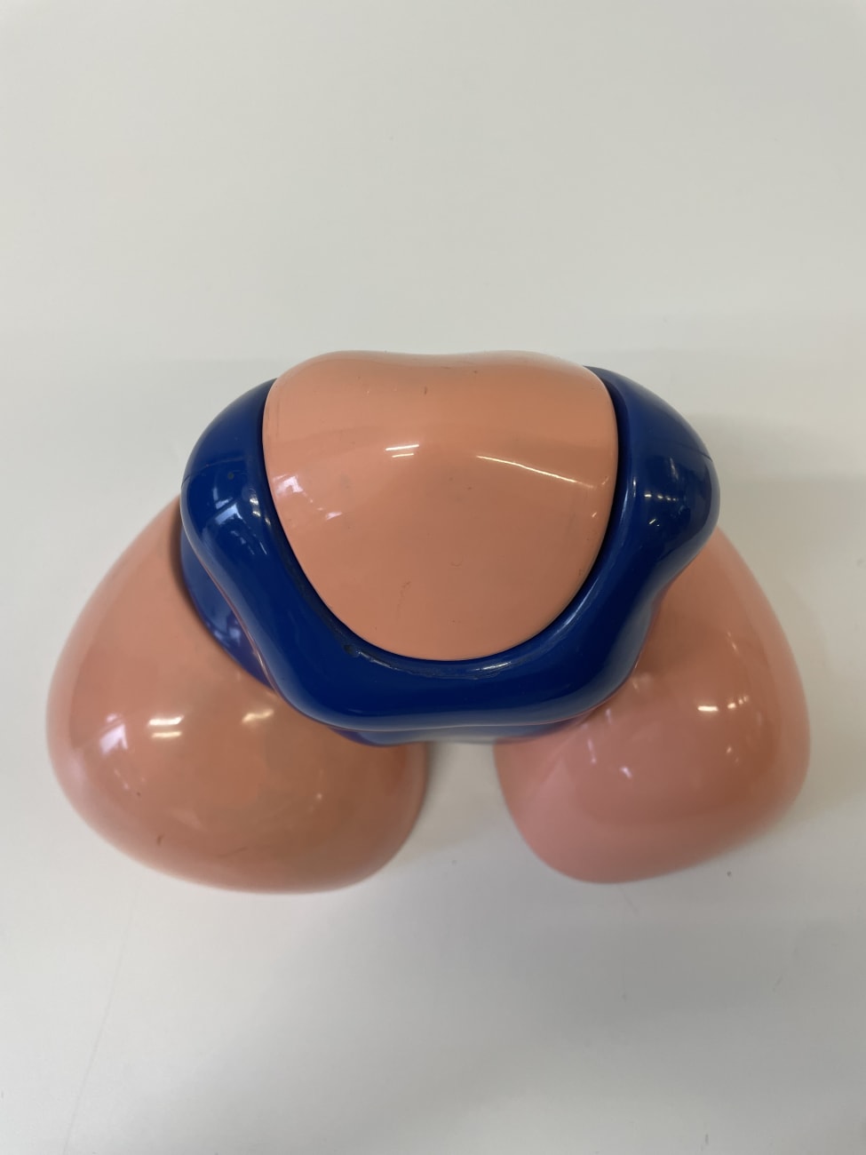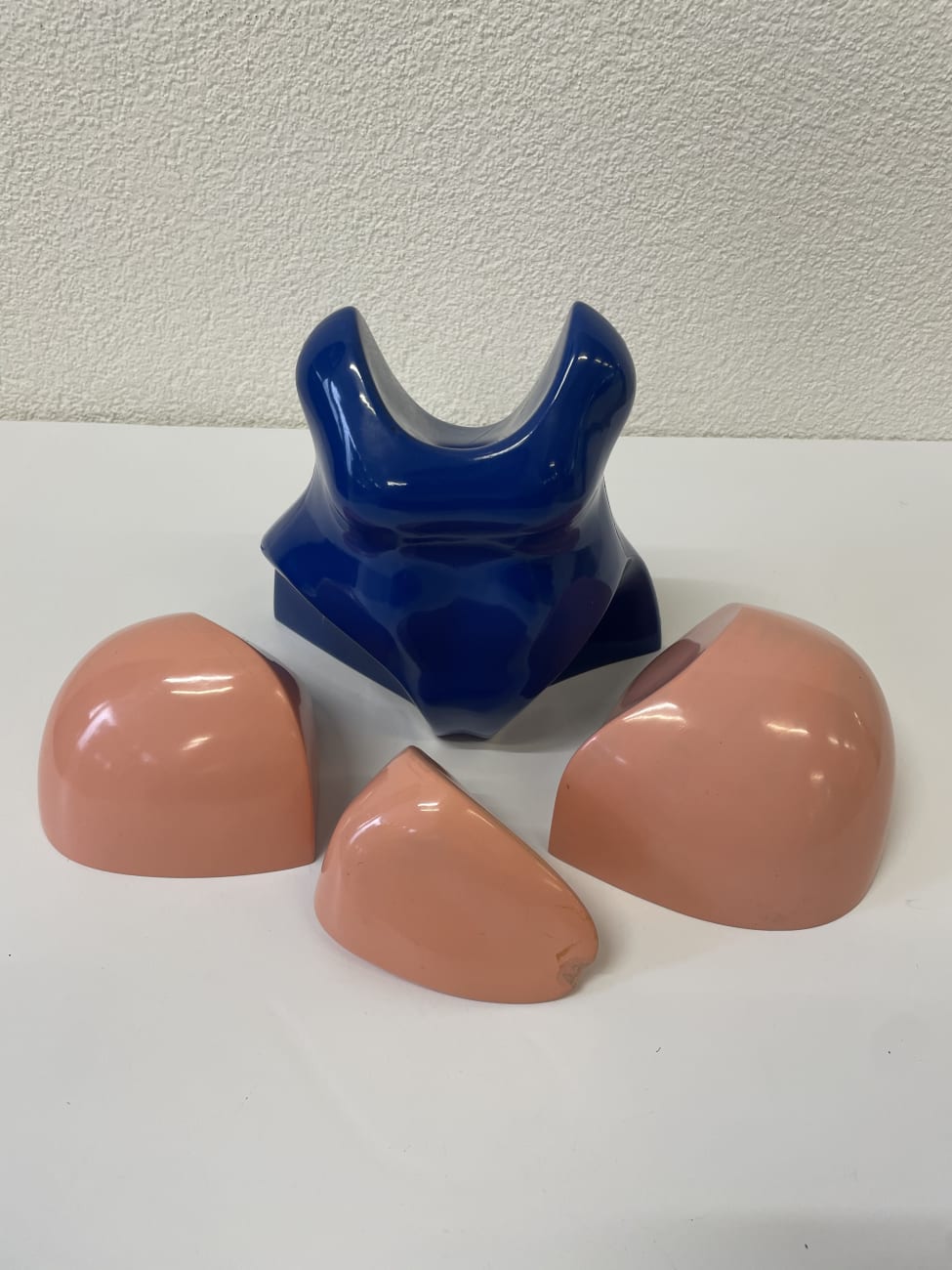 Kräftige Farben und runde Formen machen diese Skulptur sofort sichtbar im Raum. Der blaue obere Teil geht klar in den rosa Unterkörper über und erinnert abstrakt an einen menschlichen Körper. Die Oberfläche wirkt glatt und glänzend, ohne Muster oder Struktur. Als freistehendes Objekt findet sie gut Platz auf einem Sideboard, im Regal oder auf einem Podest. Sie befindet sich in einem guten Zustand mit leichten Macken am hinteren Teil, die von vorne nicht sichtbar sind.