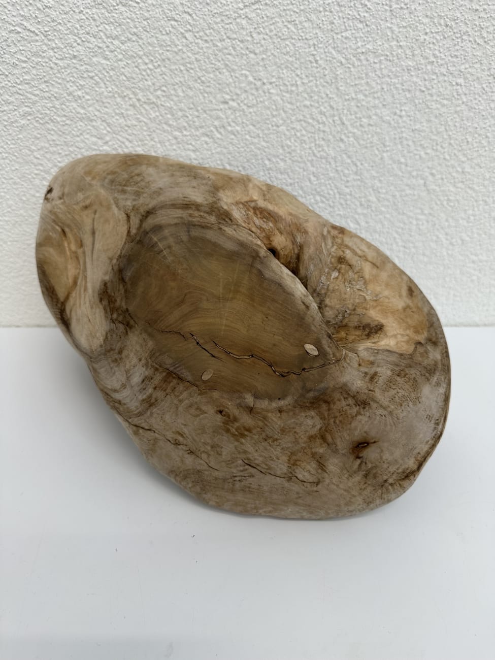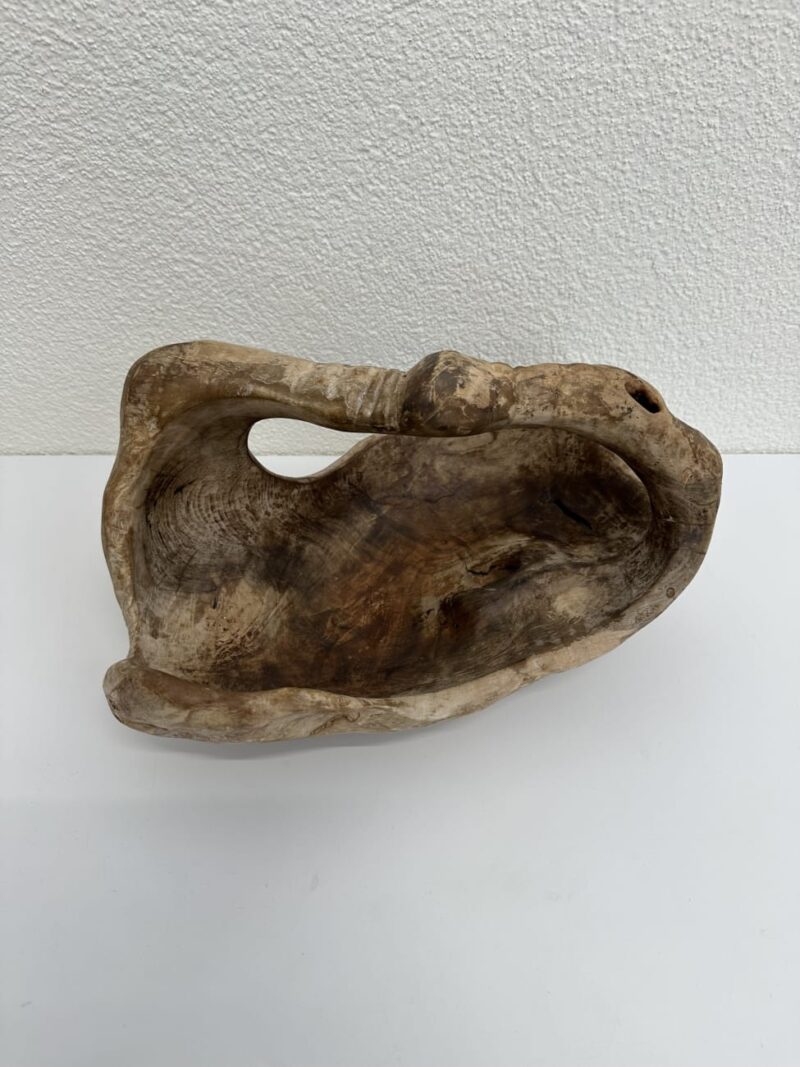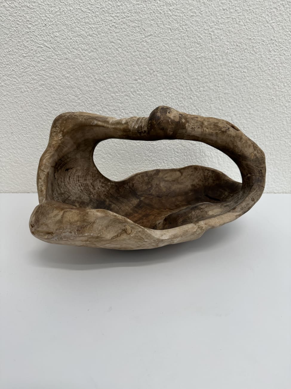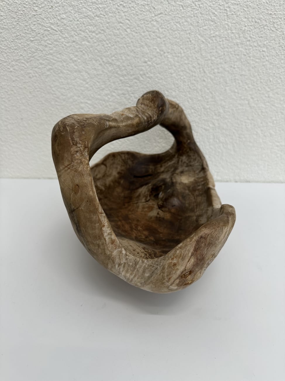 Massives Holz, frei geformt und sichtbar von Hand bearbeitet. Die Schale wirkt wie aus einem Stück gewachsen, mit natürlicher Linienführung und organischer Form. Der integrierte Griff gibt ihr einen fast skulpturalen Charakter und macht sie zugleich praktisch. Die Maserung zeigt warme Braun- und Beigetöne mit lebendigen Strukturen, Aststellen und kleinen natürlichen Öffnungen. Ein Stück, das sofort auffällt und sich gut in ruhige, natürliche Einrichtungen einfügt.