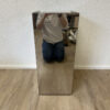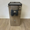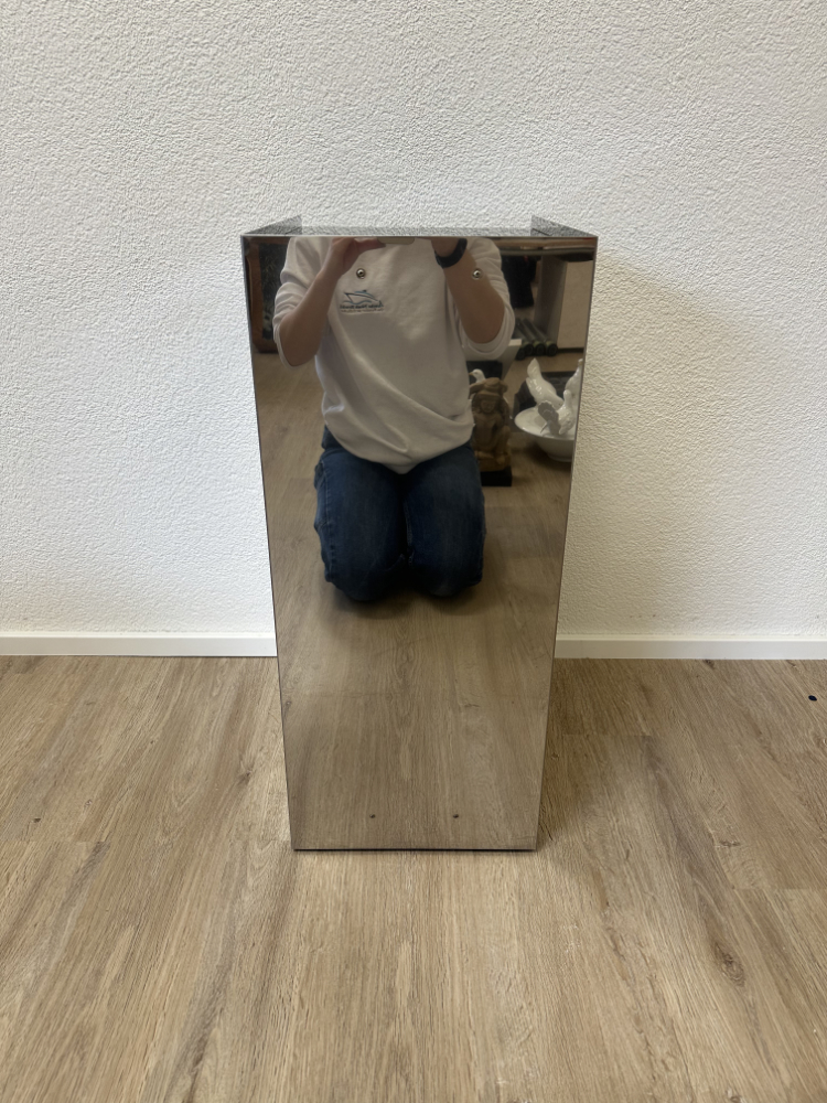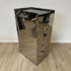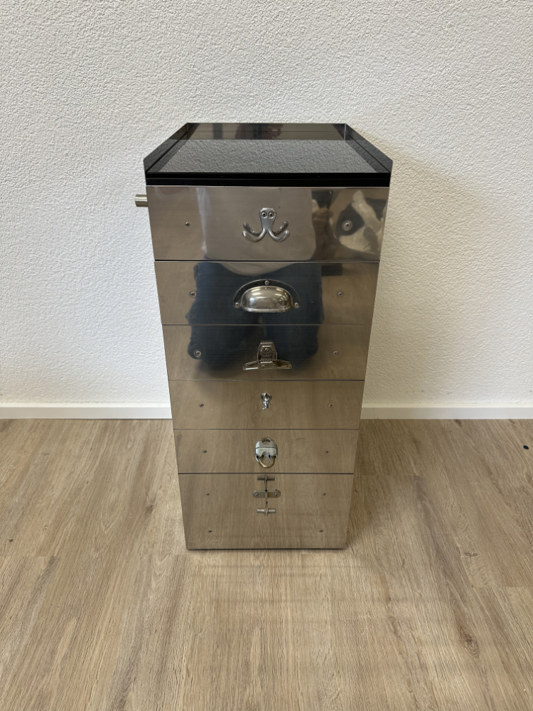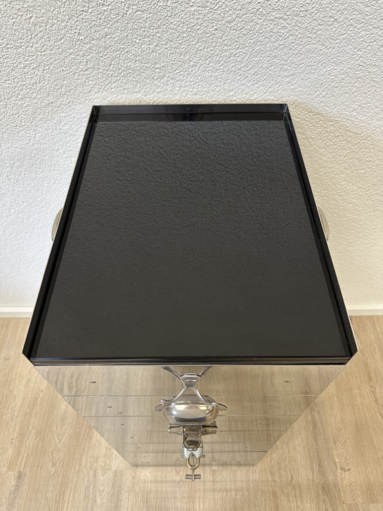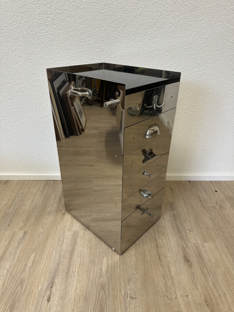 Der schmale Schubladenschrank kombiniert einen spiegelnden Edelstahlkorpus mit einer schwarzen Glasabdeckung und mehreren flachen Holzschubladen. Typisch für Tecta sind die bewusst eingesetzten, unterschiedlichen Griffe und Verschlüsse an den Schubladenfronten. Sie verweisen auf Breuers funktionalen Ansatz und den spielerischen Umgang mit Technik und Alltag. Das Möbel wirkt zugleich sachlich, industriell und elegant.