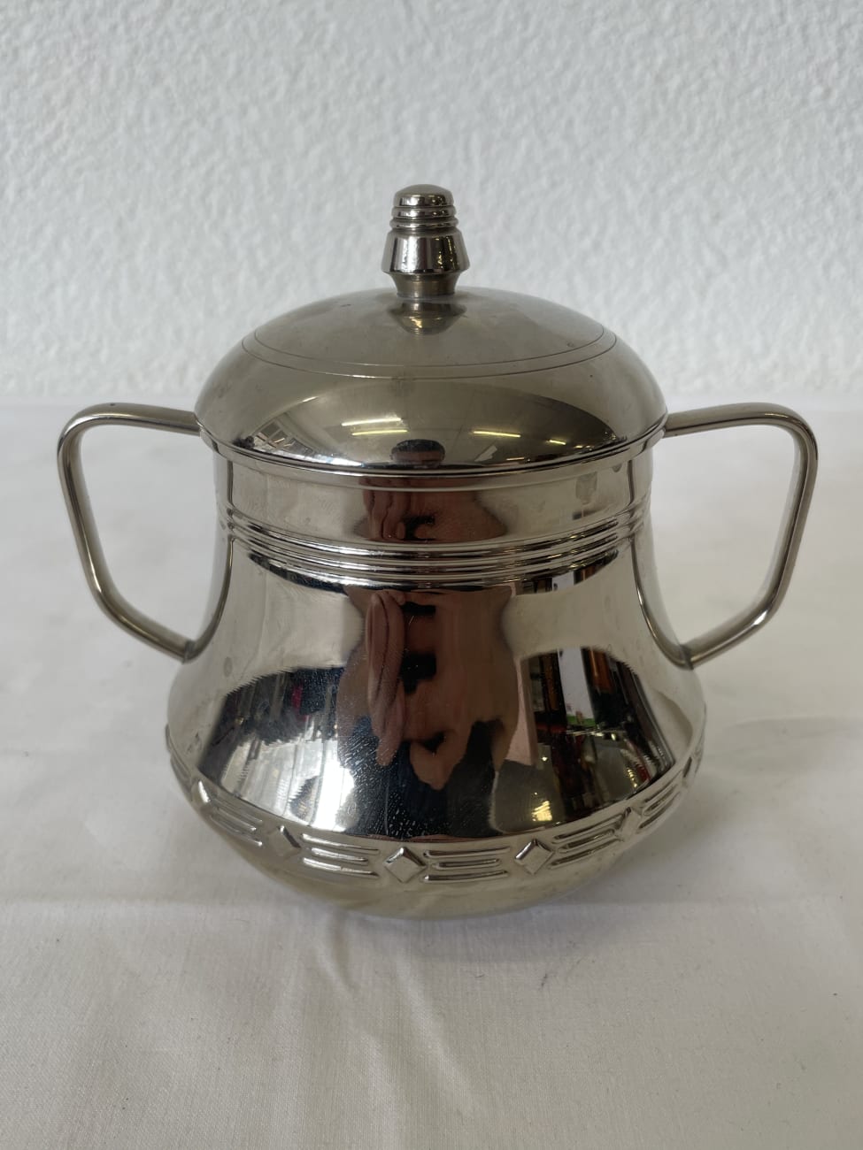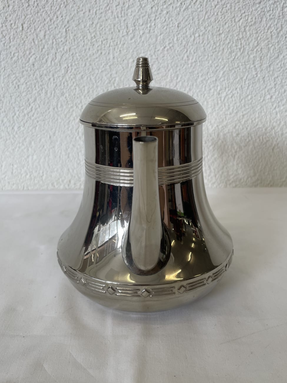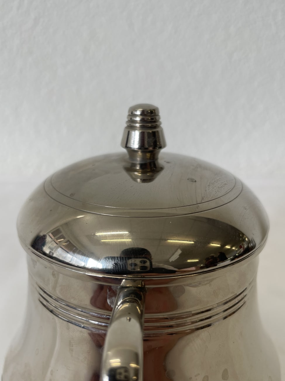 Glänzendes Teeservice aus Edelstahl mit drei Teilen: eine grössere Kanne, eine kleinere Kanne und ein Zuckergefäss. Die Oberflächen sind poliert und spiegelnd, mit dekorativen Rillen am Korpus. Beide Kannen haben einen spitz zulaufenden Ausguss und kurze, gut greifbare Henkel. Die Deckel sind mit schlichtem Knauf ausgeführt und passen formschlüssig auf die Gefässe. Leichte Gebrauchsspuren und feine Kratzer sind sichtbar, insgesamt wirkt das Set gepflegt und alltagstauglich.