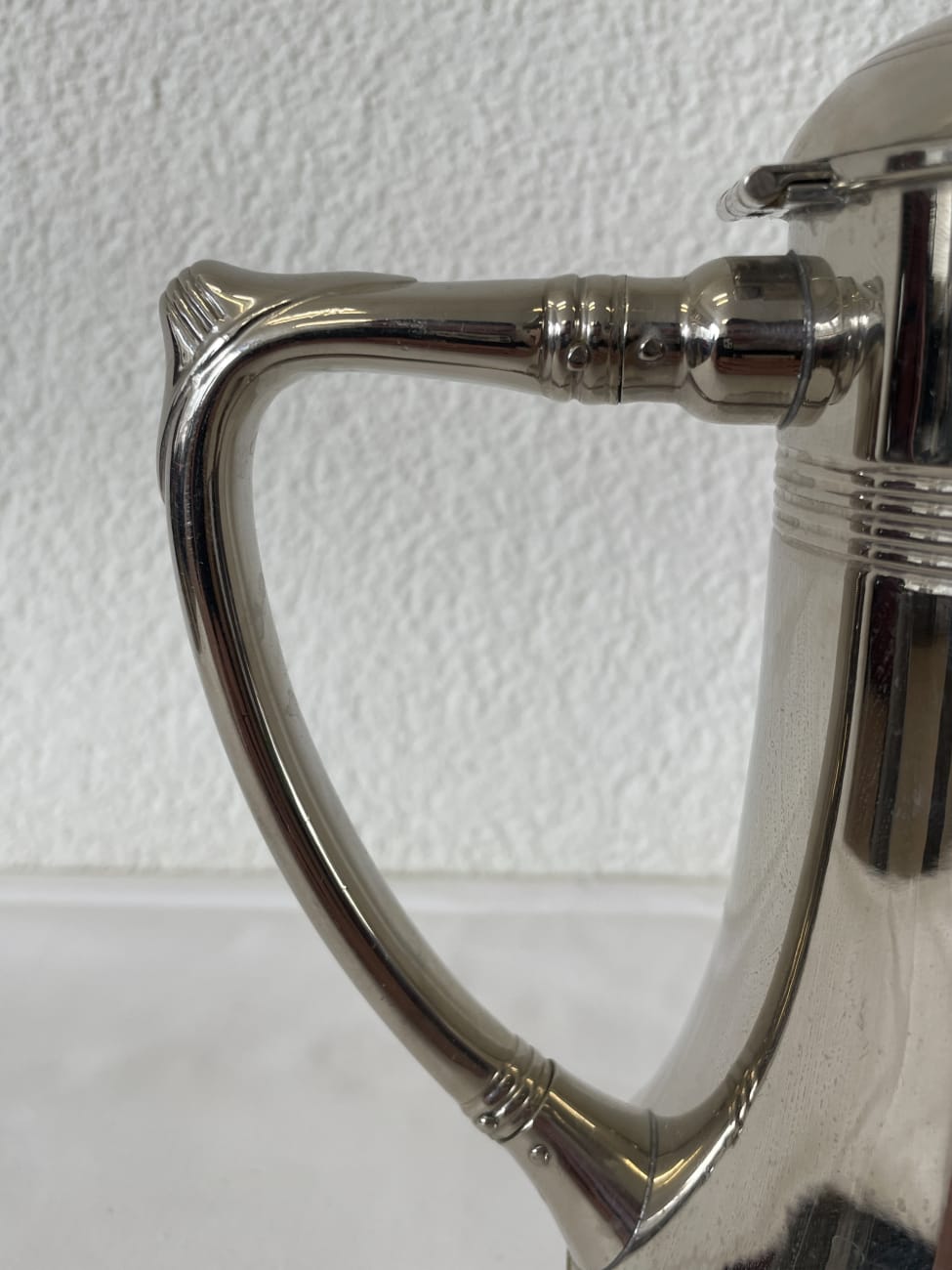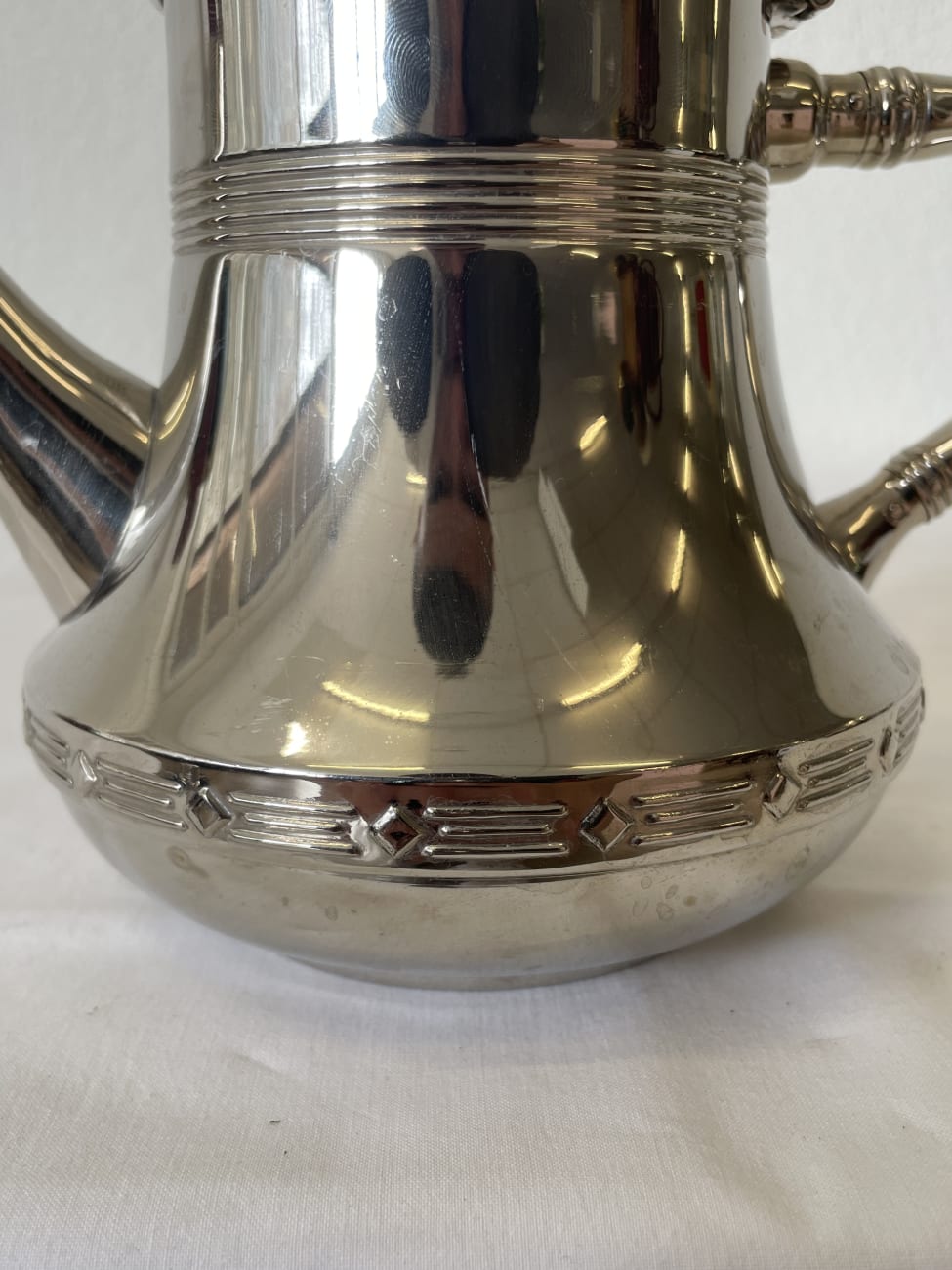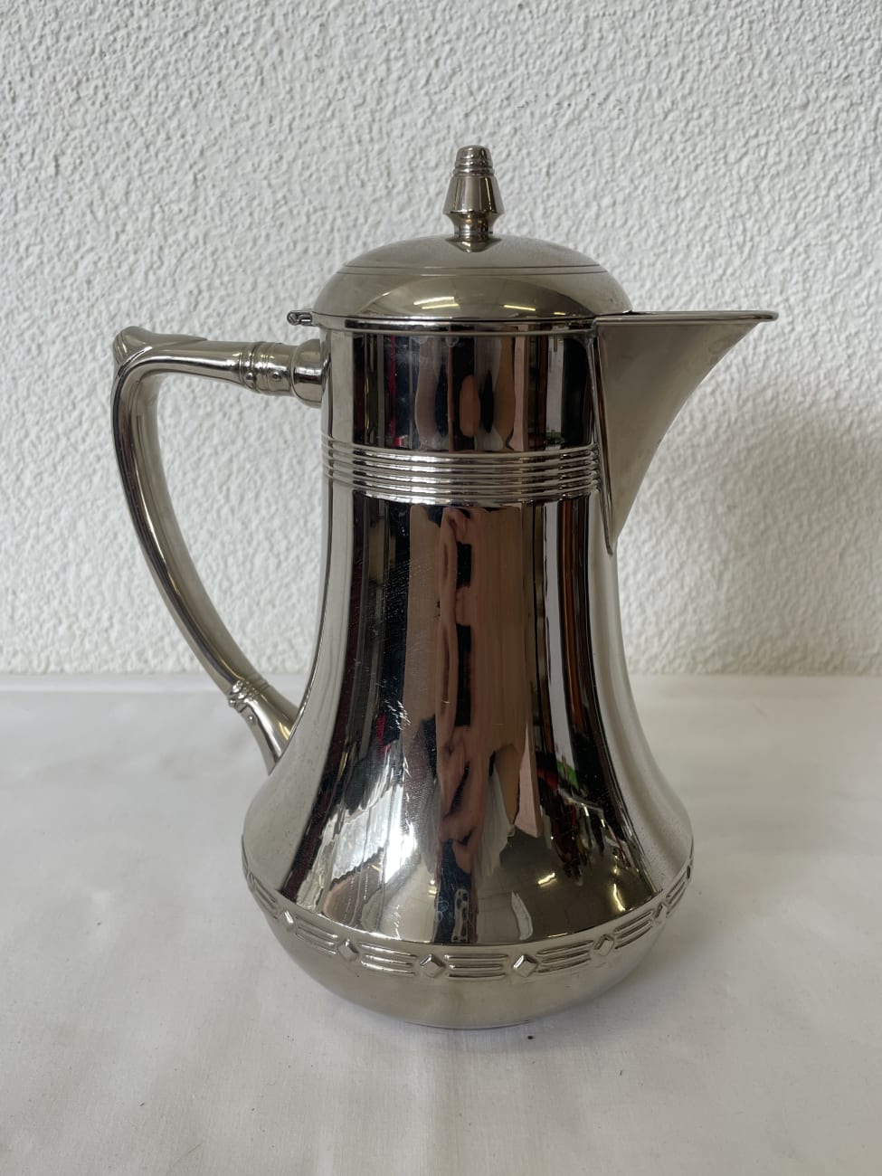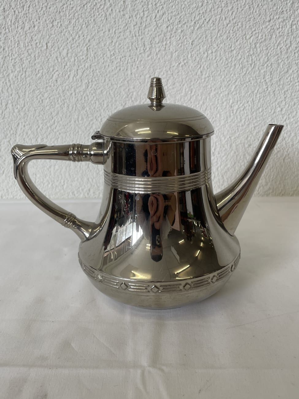 Glänzendes Teeservice aus Edelstahl mit drei Teilen: eine grössere Kanne, eine kleinere Kanne und ein Zuckergefäss. Die Oberflächen sind poliert und spiegelnd, mit dekorativen Rillen am Korpus. Beide Kannen haben einen spitz zulaufenden Ausguss und kurze, gut greifbare Henkel. Die Deckel sind mit schlichtem Knauf ausgeführt und passen formschlüssig auf die Gefässe. Leichte Gebrauchsspuren und feine Kratzer sind sichtbar, insgesamt wirkt das Set gepflegt und alltagstauglich.