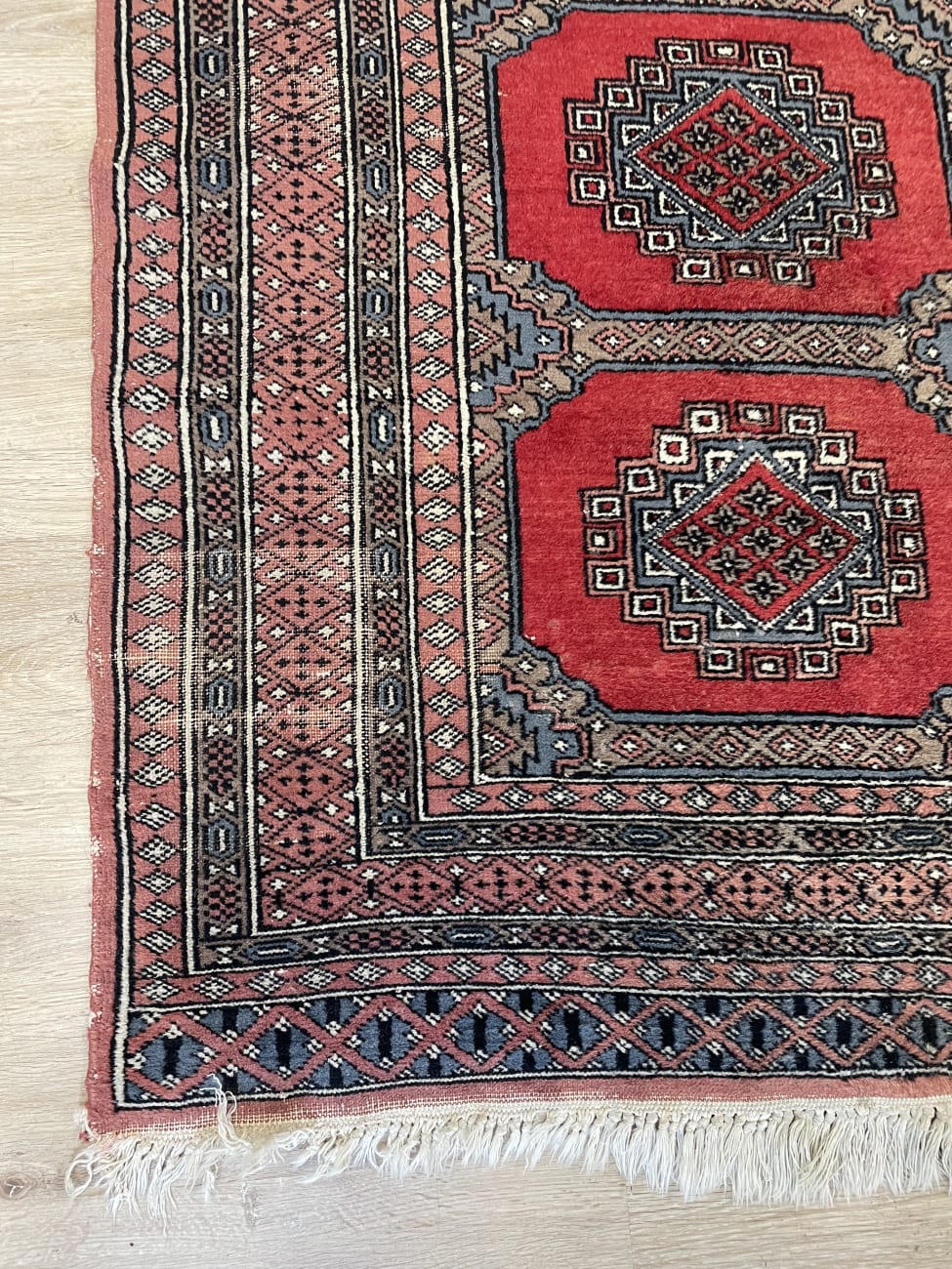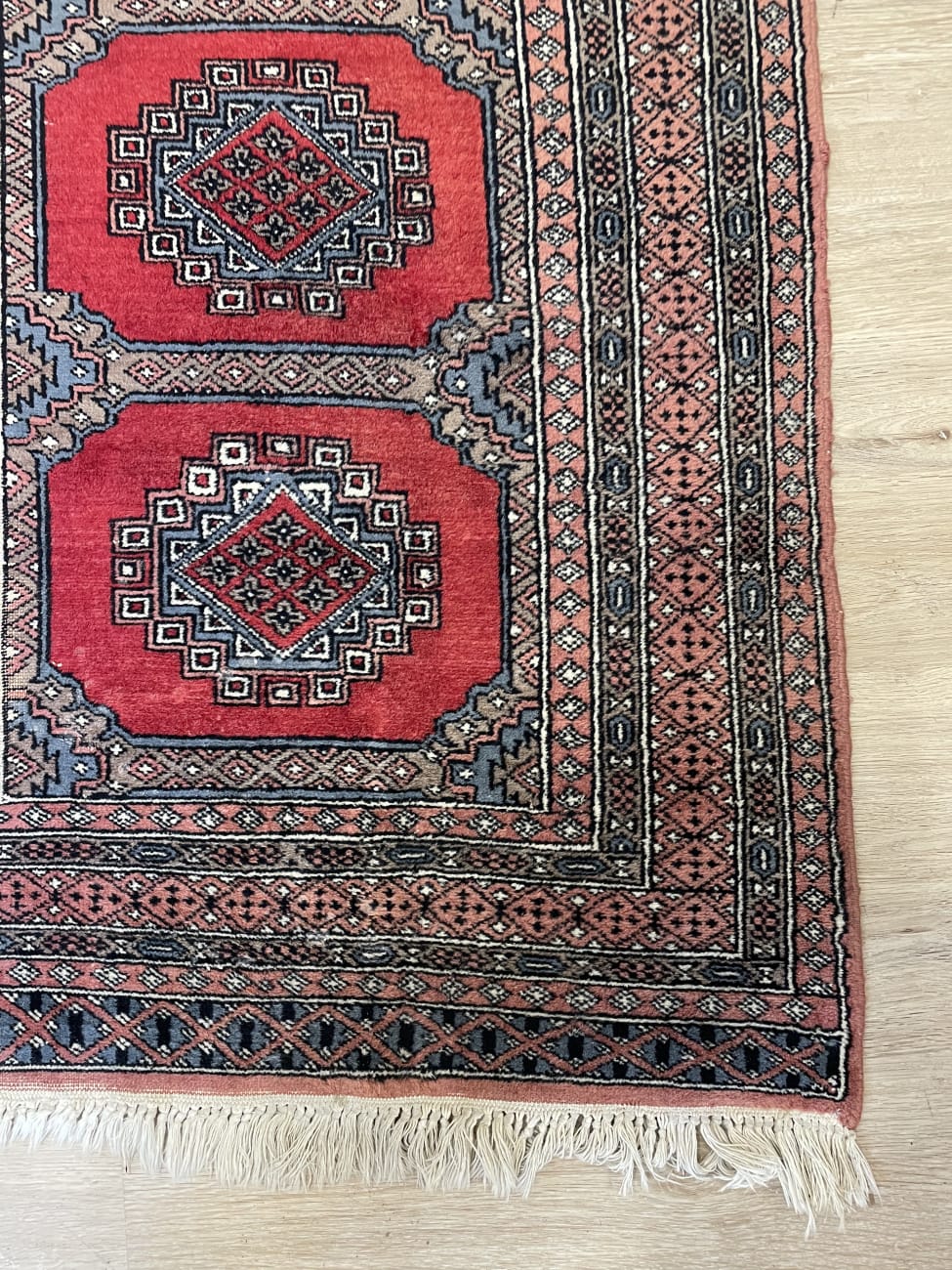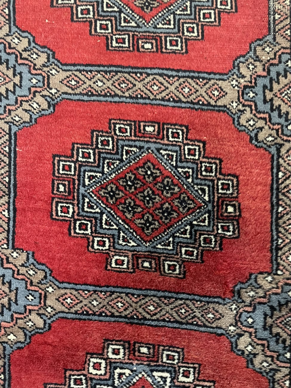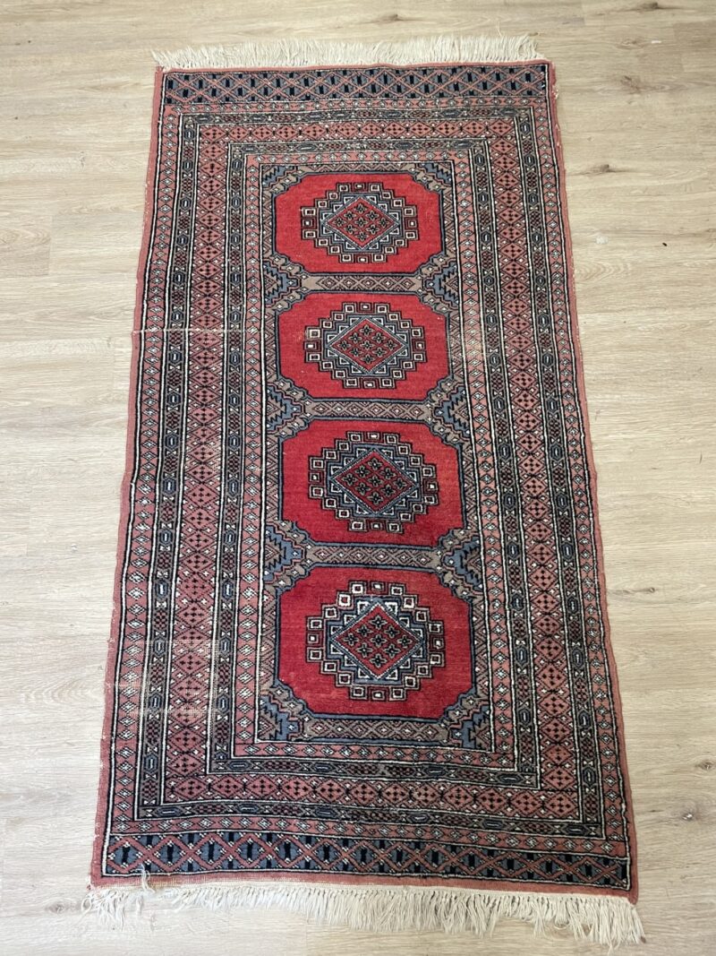 Kräftiges Rot dominiert die Fläche und wird von klaren geometrischen Formen durchzogen. Vier zentrale Medaillons liegen sauber in einer Reihe und geben dem Teppich eine ruhige, symmetrische Struktur. Die Bordüren sind fein gemustert und greifen die Farben Grau, Beige und Schwarz wieder auf, was dem Ganzen Tiefe gibt. Die Oberfläche wirkt weich und leicht glänzend, typisch für maschinell hergestellte Teppiche dieser Art. Ein praktischer Teppich im Orientstil, der Farbe bringt ohne aufdringlich zu wirken.