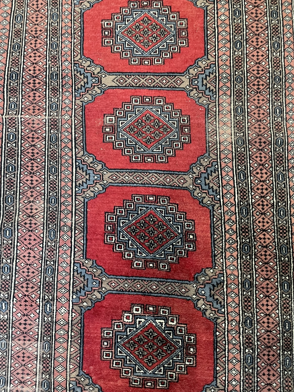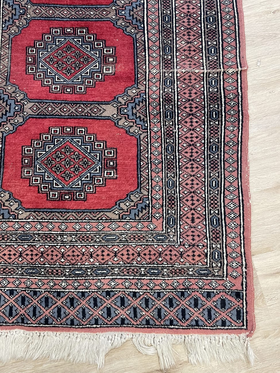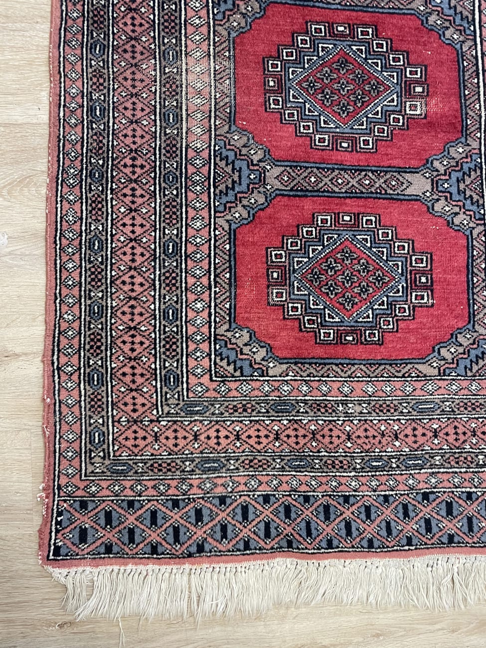 Kräftiges Rot dominiert die Fläche und wird von klaren geometrischen Formen durchzogen. Vier zentrale Medaillons liegen sauber in einer Reihe und geben dem Teppich eine ruhige, symmetrische Struktur. Die Bordüren sind fein gemustert und greifen die Farben Grau, Beige und Schwarz wieder auf, was dem Ganzen Tiefe gibt. Die Oberfläche wirkt weich und leicht glänzend, typisch für maschinell hergestellte Teppiche dieser Art. Ein praktischer Teppich im Orientstil, der Farbe bringt ohne aufdringlich zu wirken.