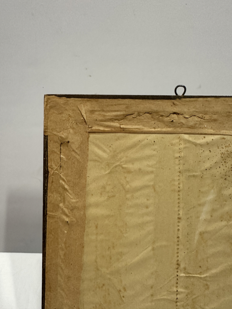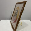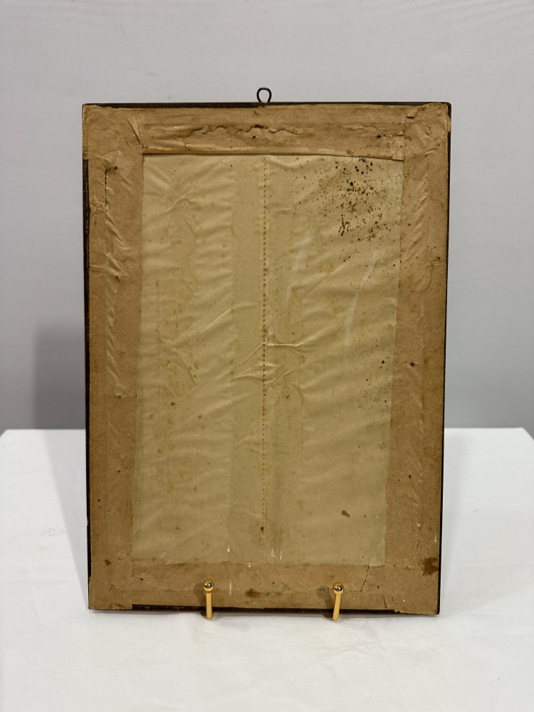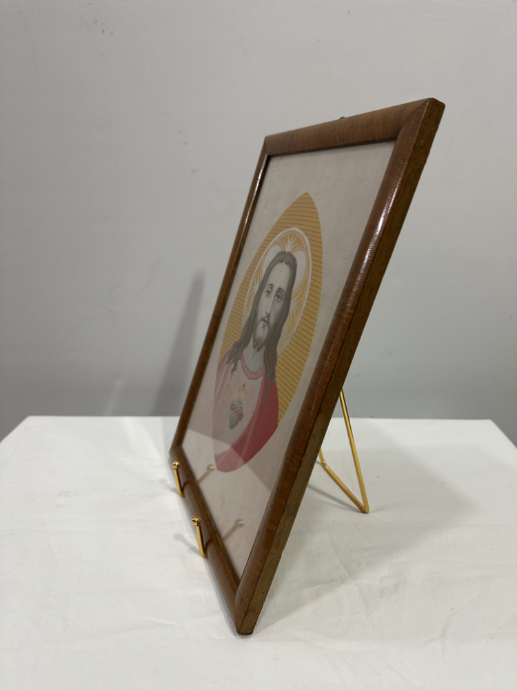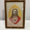 Dieses fein gearbeitete Andachtsbild zeigt das Heiligste Herz Jesu, dargestellt mit sanftem Ausdruck und strahlender Aureole. Das Motiv ist auf echter Seide ausgeführt, zu erkennen am feinen Glanz, der glatten Oberfläche und den charakteristischen Lichtreflexen der Fäden. Solche Seidenbilder wurden im frühen 20. Jahrhundert häufig in Klöstern oder religiösen Werkstätten gefertigt und zählten zu den hochwertigen Devotionalien ihrer Zeit.