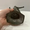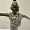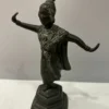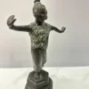 Diese thailändische Tempeltänzerin, gefertigt aus Metall befindet sich in einem guten bis sehr guten Zustand. Die Figur, eingefangen in einer dynamischen Tanzpose, besticht durch ihre detailreichen, in einem zarten Mintgrün gehaltenen Verzierungen auf dem Kleid. Sie stellt eine exquisite Dekoration dar und kann äußerst ansprechend auf einem Möbelstück in Szene gesetzt werden.