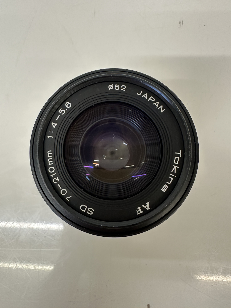 Auf der Front ist die Lichtstärke 1:4-5.6 angegeben, dazu Filtergewinde Ø 52 mm. Das Objektiv trägt die Bezeichnung Tokina 70-210 und ist Made in Japan. Eine Distanzskala mit Meter und Fuss ist ebenfalls vorhanden. Ideal für alle, die ältere AF Objektive sammeln oder analog fotografieren.