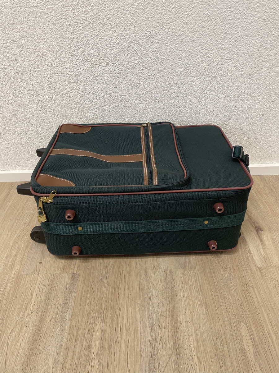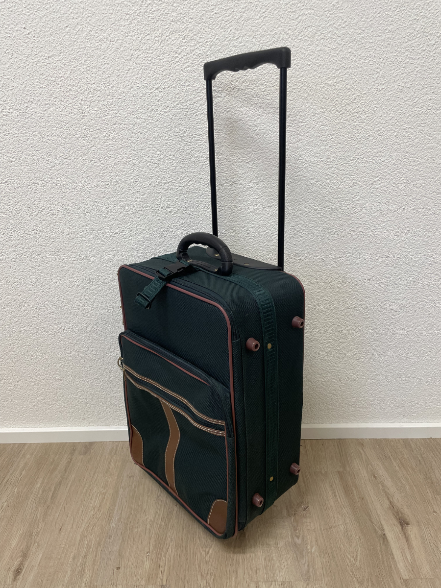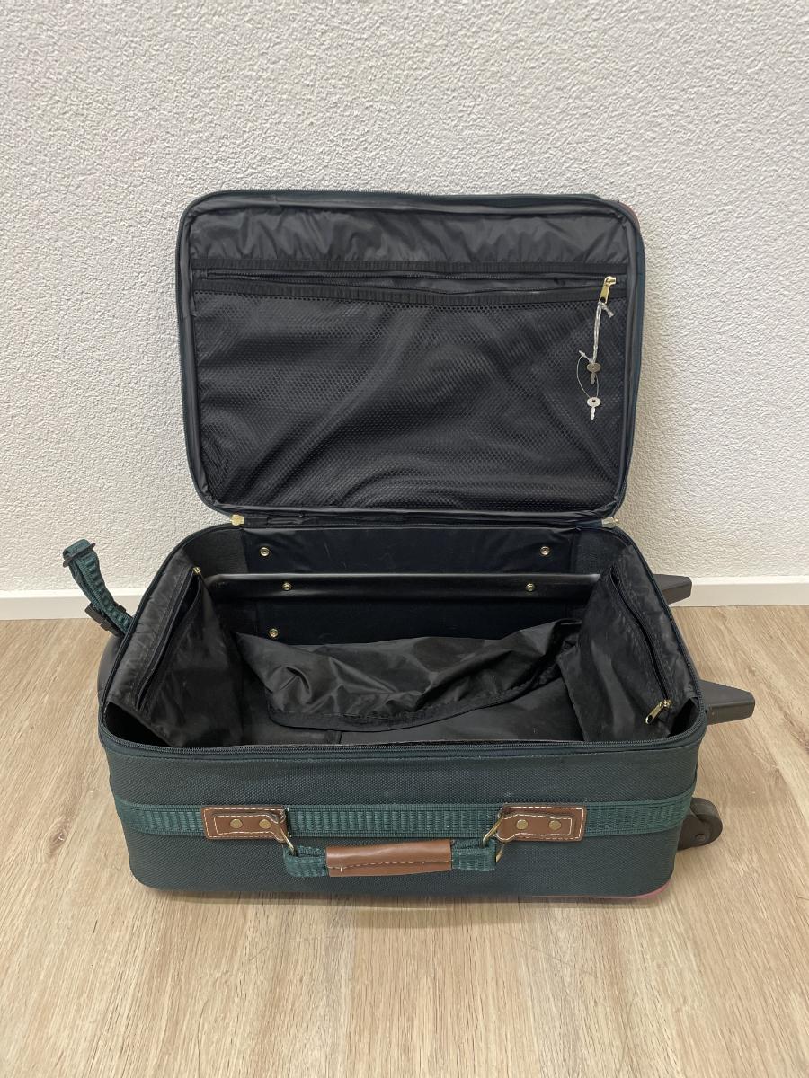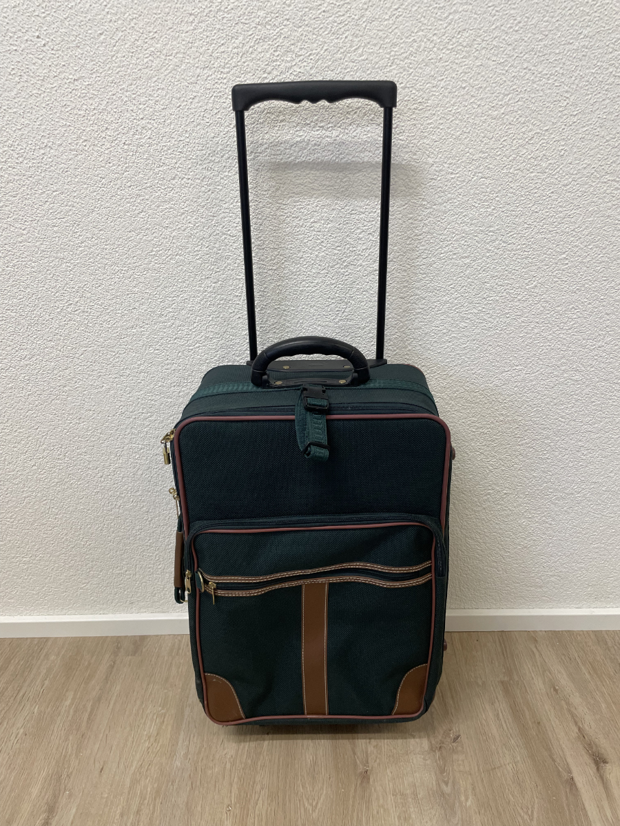 Dunkelgrünes Textilgewebe, braune Kunstleder-Details und eine funktionale Innenaufteilung prägen diesen kompakten Trolley-Koffer. Das Hauptfach lässt sich weit öffnen und bietet übersichtlichen Stauraum. Im Deckel befindet sich ein Reissverschlussfach aus Netzmaterial. Der Koffer ist abschliessbar, passende Schlüssel sind vorhanden. Mehrere Aussenfächer ermöglichen schnellen Zugriff auf Dokumente oder Zubehör. Kunststoffrollen und stabiler Griff sorgen für angenehmes Handling.