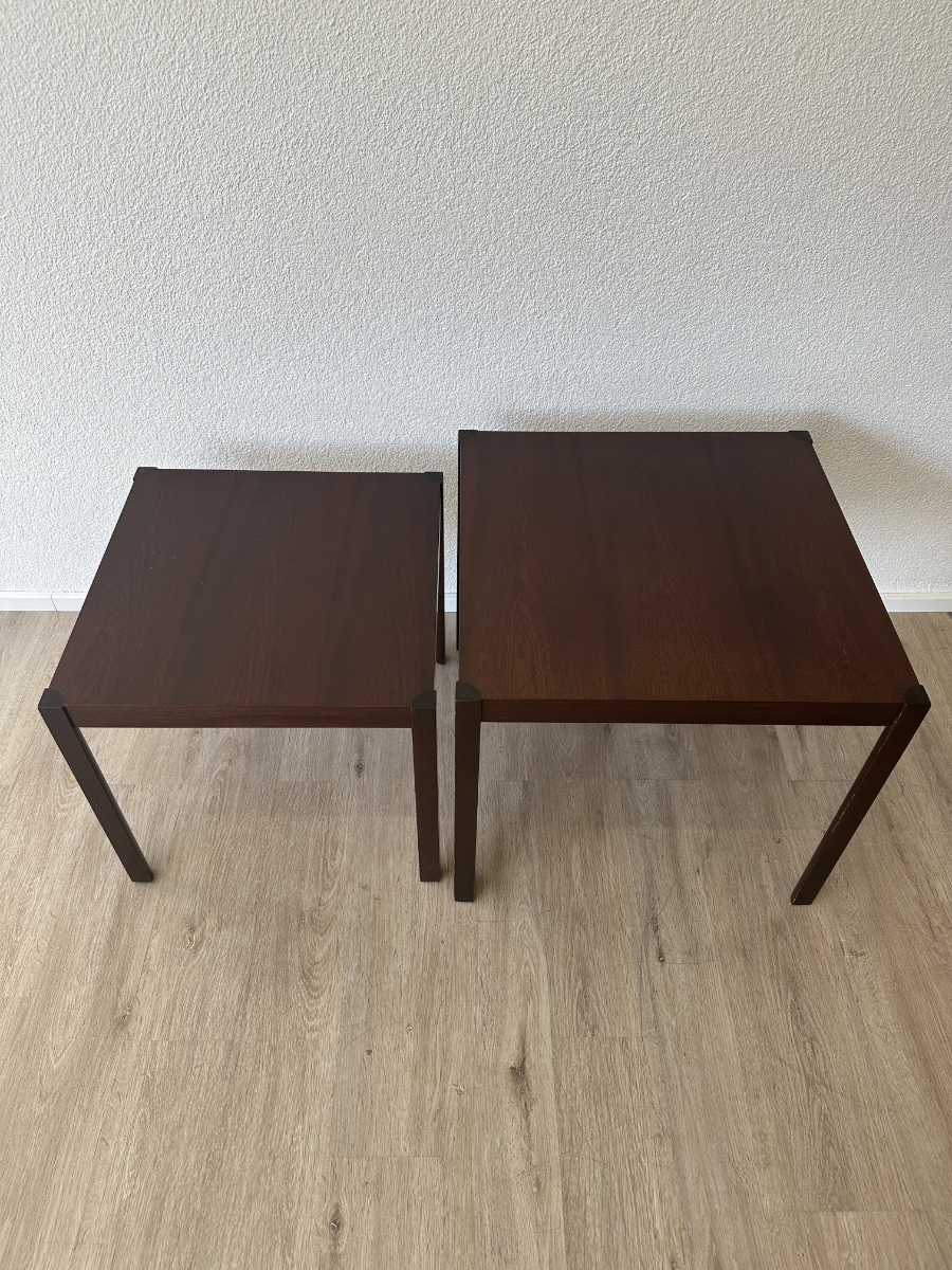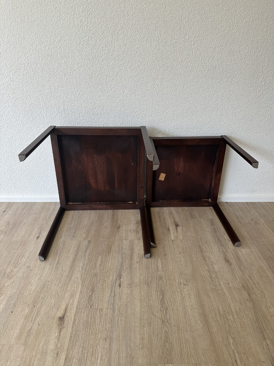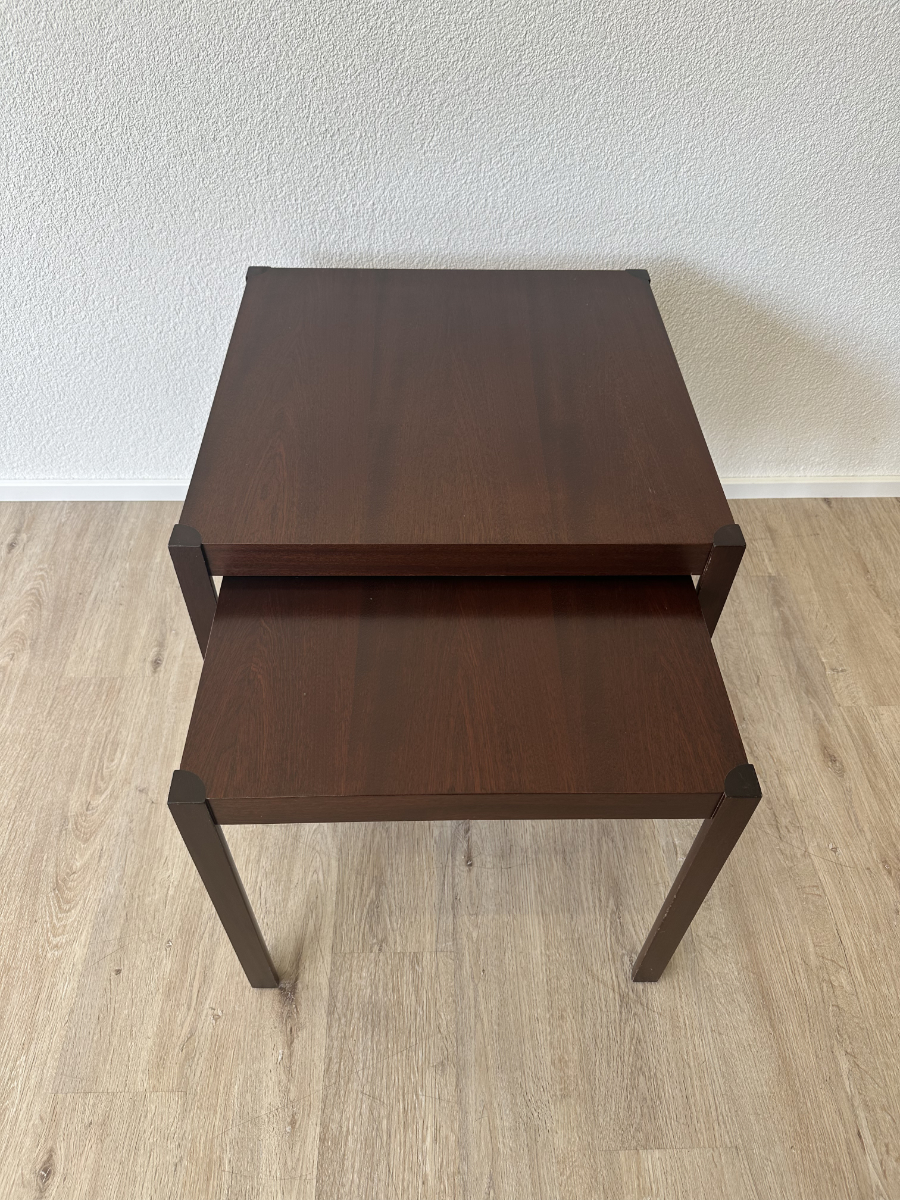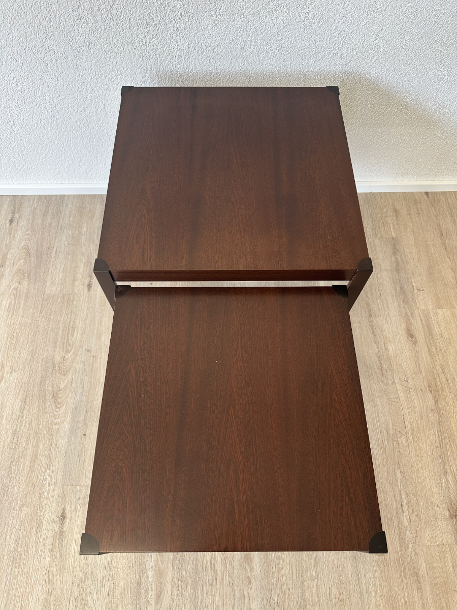 Dunkles Mahagoni Furnier mit schöner, ruhiger Maserung und ein geradliniges Design ohne Schnickschnack. Die zwei Tische passen perfekt zusammen und lassen sich platzsparend ineinander schieben oder nebeneinander als flexible Ablage nutzen. Ideal fürs Wohnzimmer, neben dem Sofa oder als kleine Couchtisch Kombi.