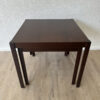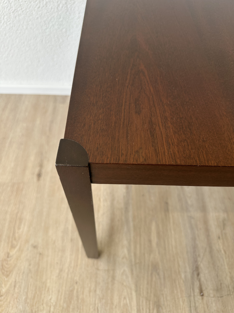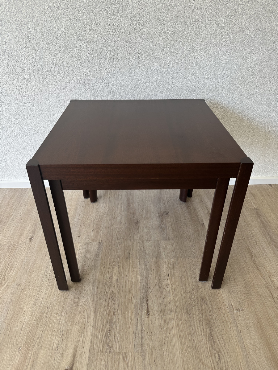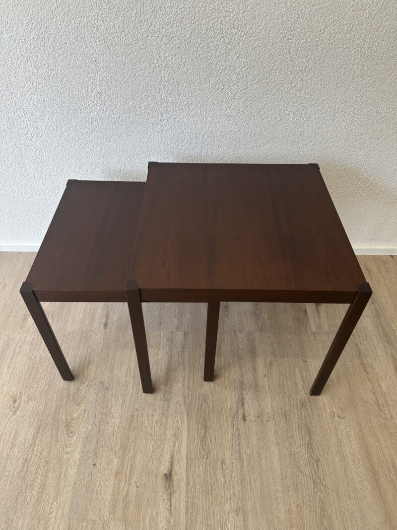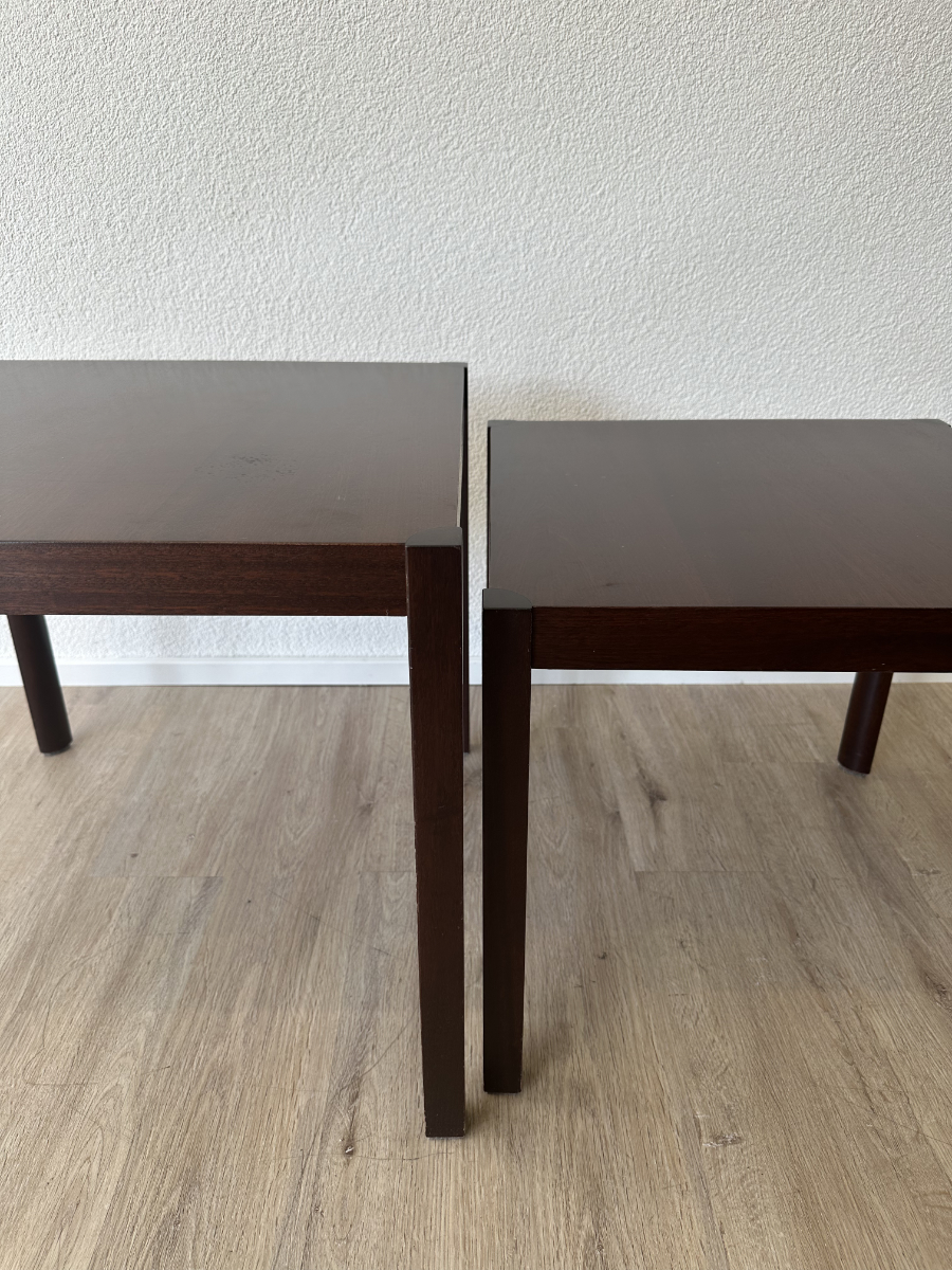 Dunkles Mahagoni Furnier mit schöner, ruhiger Maserung und ein geradliniges Design ohne Schnickschnack. Die zwei Tische passen perfekt zusammen und lassen sich platzsparend ineinander schieben oder nebeneinander als flexible Ablage nutzen. Ideal fürs Wohnzimmer, neben dem Sofa oder als kleine Couchtisch Kombi.