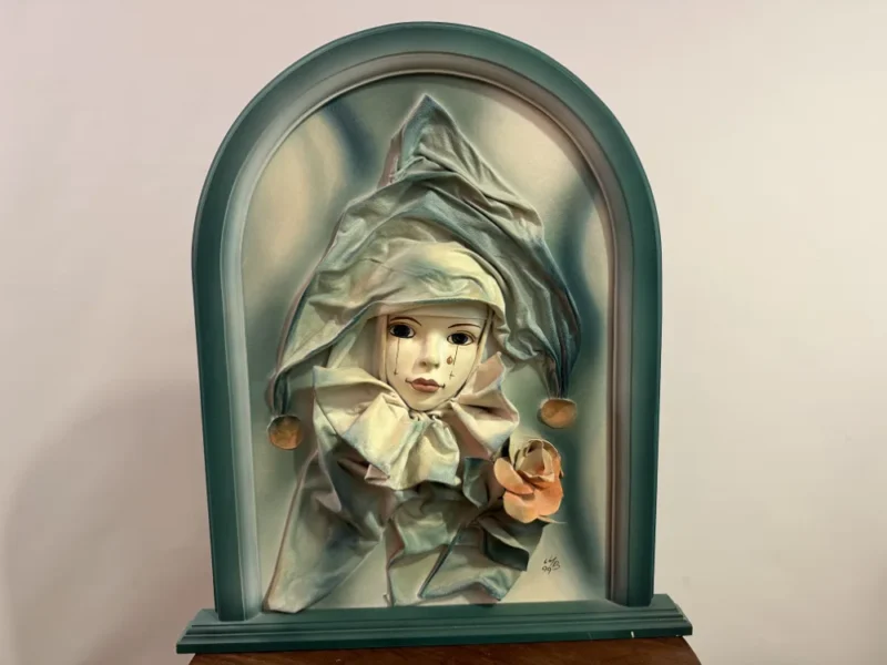 Vintage 3D Kunst / Art mit einem modellierten Clown befindet sich in einem guten bis sehr guten Zustand. Dieser Clown wurde selbst modelliert von einer Privatperson. In der Mitte des Bildes strahlt der Clown aus dem Bild, umrandet wurde er mit einem Türkisen Rahmen. Das Bild kann aufgehängt werden wie auch zum aufstelle an einer Wand.