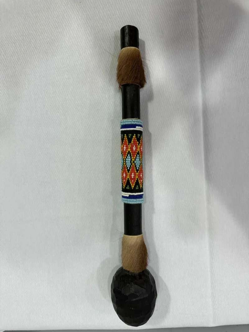 Vintage Afrikanischer Zulu-Knopf-Kerrie mit langen Perlen befindet sich in einem guten bis sehr guten Zustand. Dieses traditionelle Werkzeug wurde von Zulu-Stammesangehörigen sowohl als Kriegskeule als auch bei der Jagd verwendet. Im Krieg wurde die Keule typischerweise zusammen mit einem Zulu-Schild und einem Speer eingesetzt, wobei der Schild den Krieger schützt, während die Keule gegen den Feind eingesetzt wird. Bei der Jagd wird sie zur Beutejagd verwendet. Dieses Knobkiere ist aus robustem Holz geschnitzt, das die erforderliche Stärke für den Gebrauch als Schlagwaffe aufweist, und anschließend in die Form des Griffs oder Schafts gebracht wird. In jüngerer Zeit wird der Schaft von Zulu-Frauen in traditionellen Zulu-Farben getragen. Er kommt häufig bei Zeremonien zum Einsatz und verfügt über eine kunstvoll geschnitzte Öffnung an der Spitze, durch die eine Lederschnur zum Aufhängen des Schlägers geführt werden kann. Heutzutage kann er auch als beeindruckendes Dekorationsstück dienen.